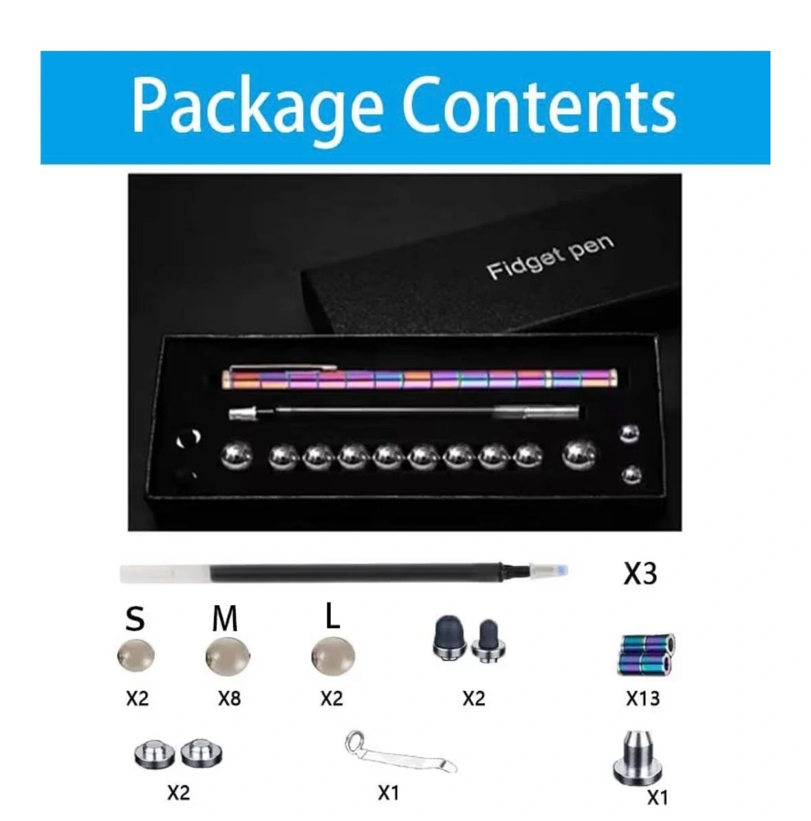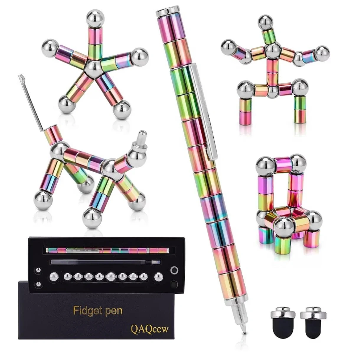 This is a magnetic fidget pen set with multiple magnetic balls and pieces. It includes a pen, various sized magnetic balls, and other attachments for creative building. Great for stress relief and fun!