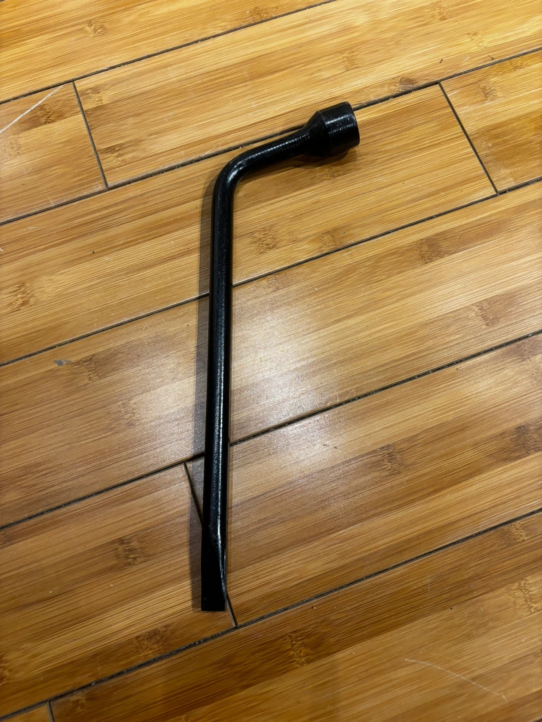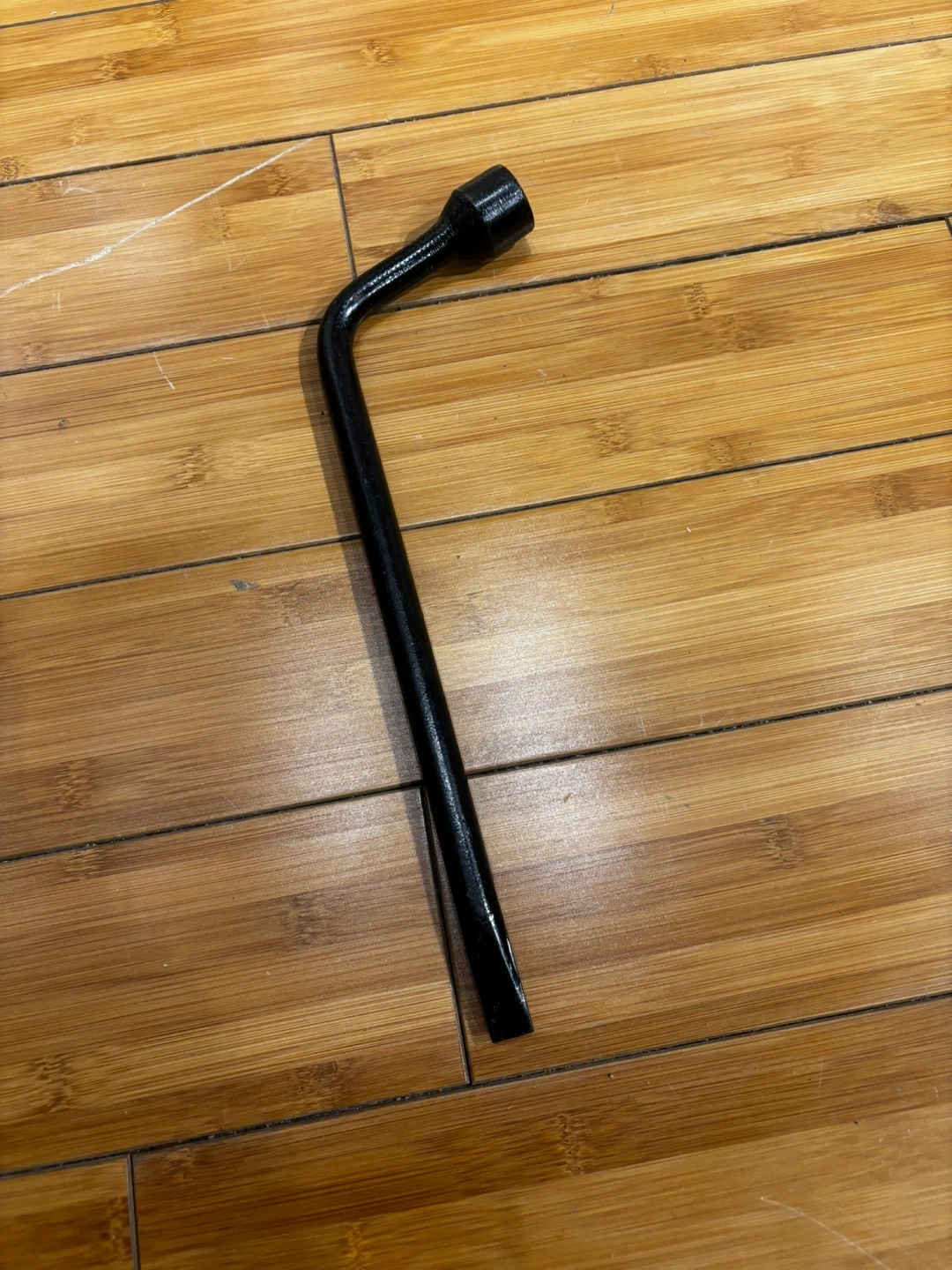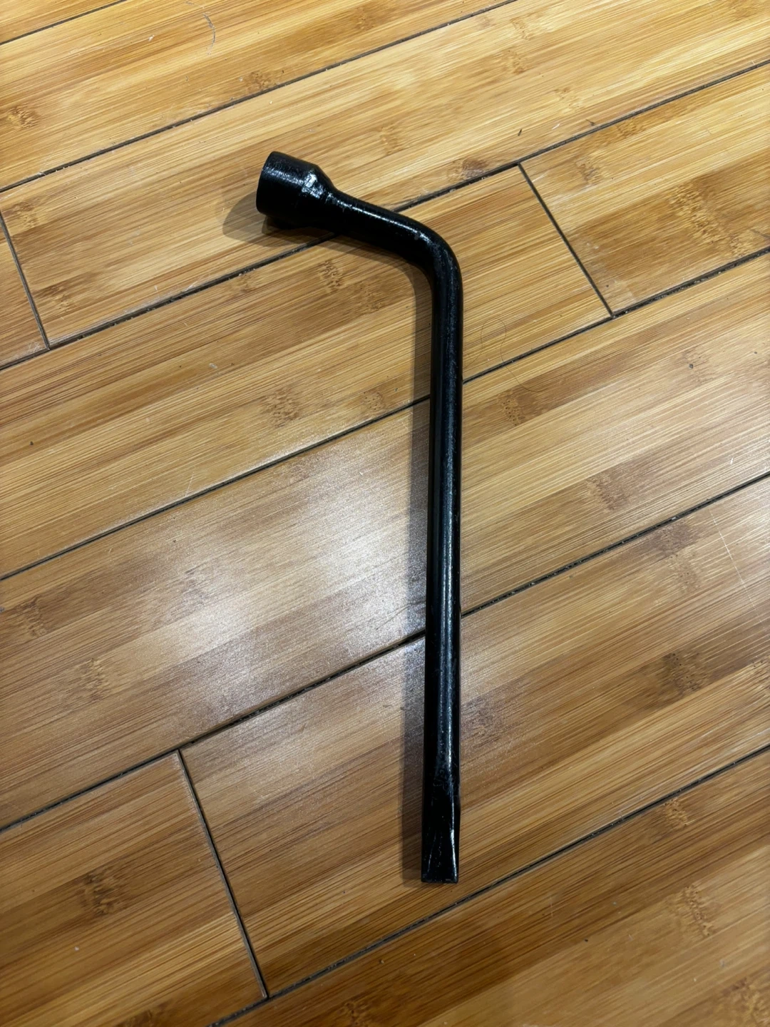 This is a black L-shaped lug wrench. It's made of metal and appears to be a standard size for car tires. One end has a socket for lug nuts, and the other end is flat for leverage. 25mm