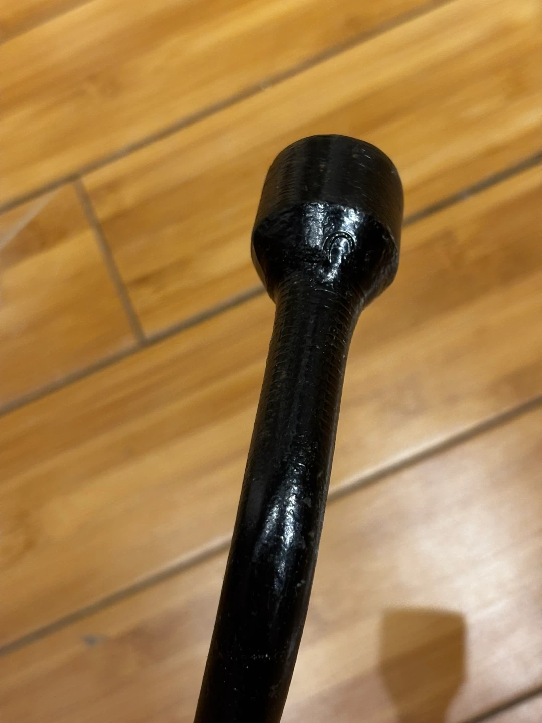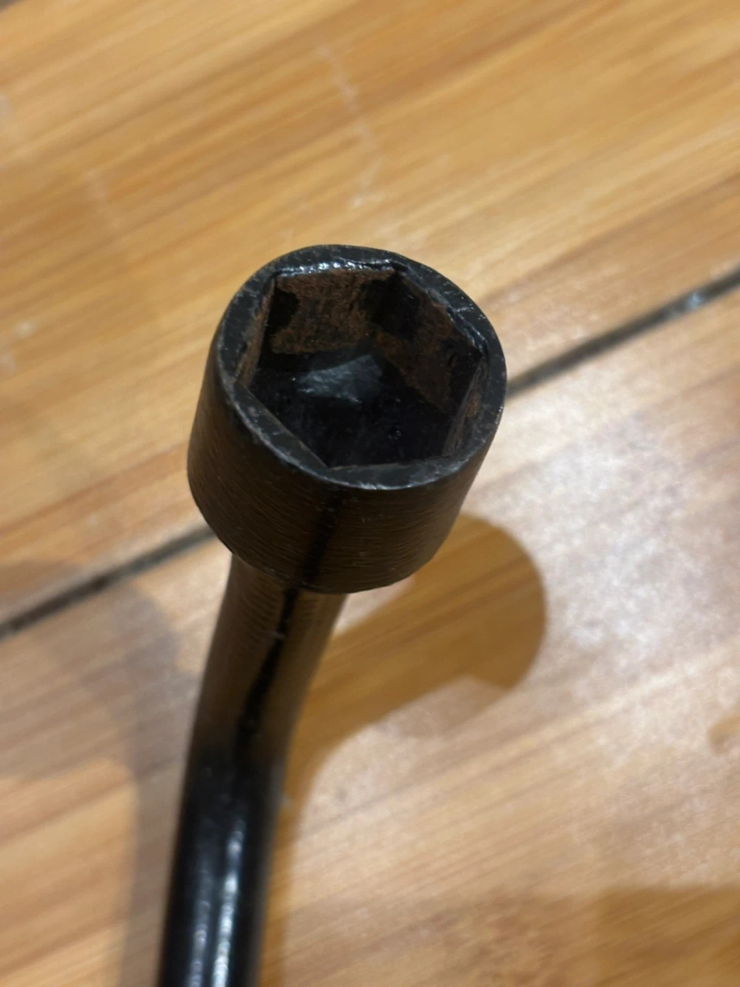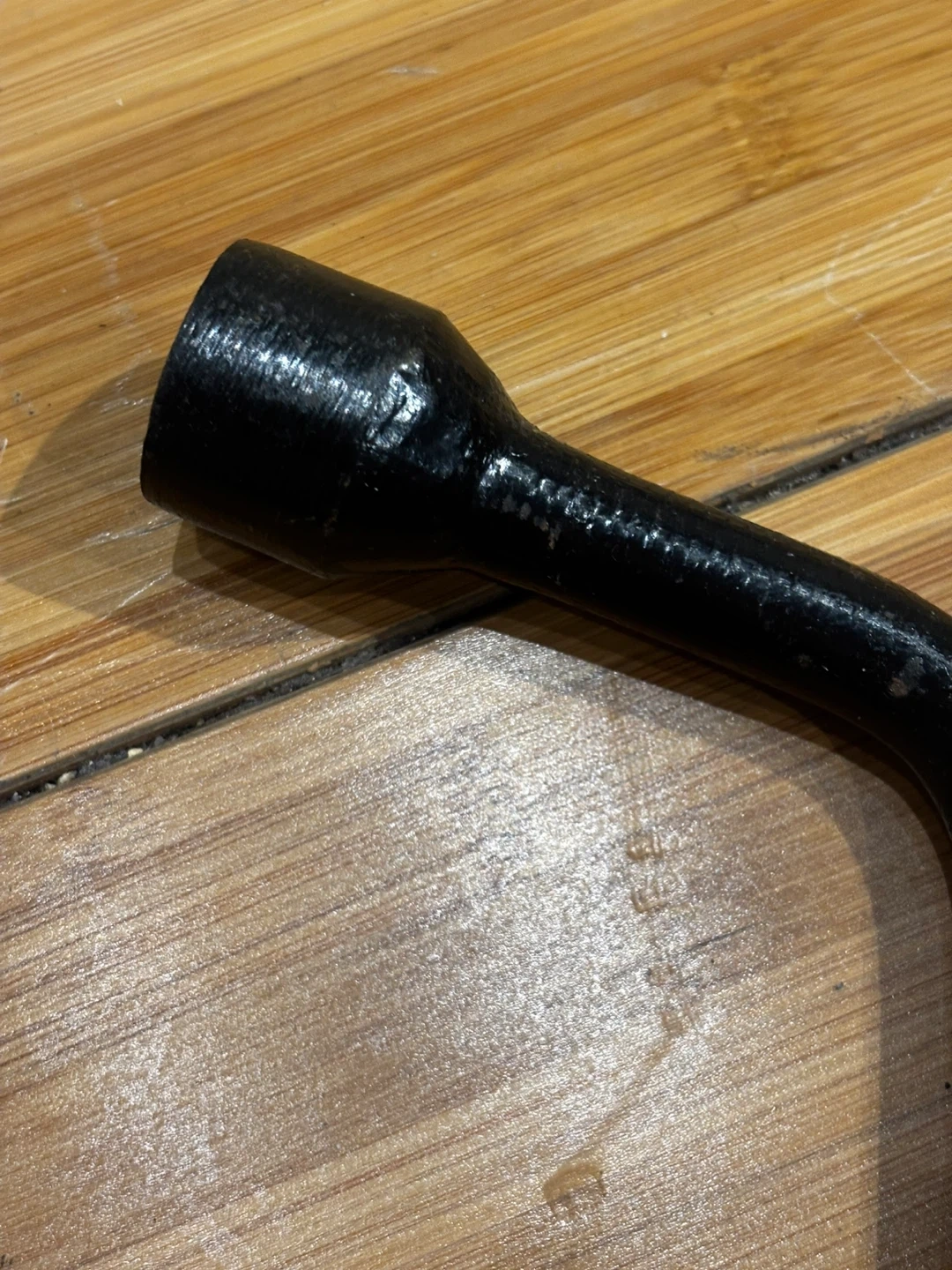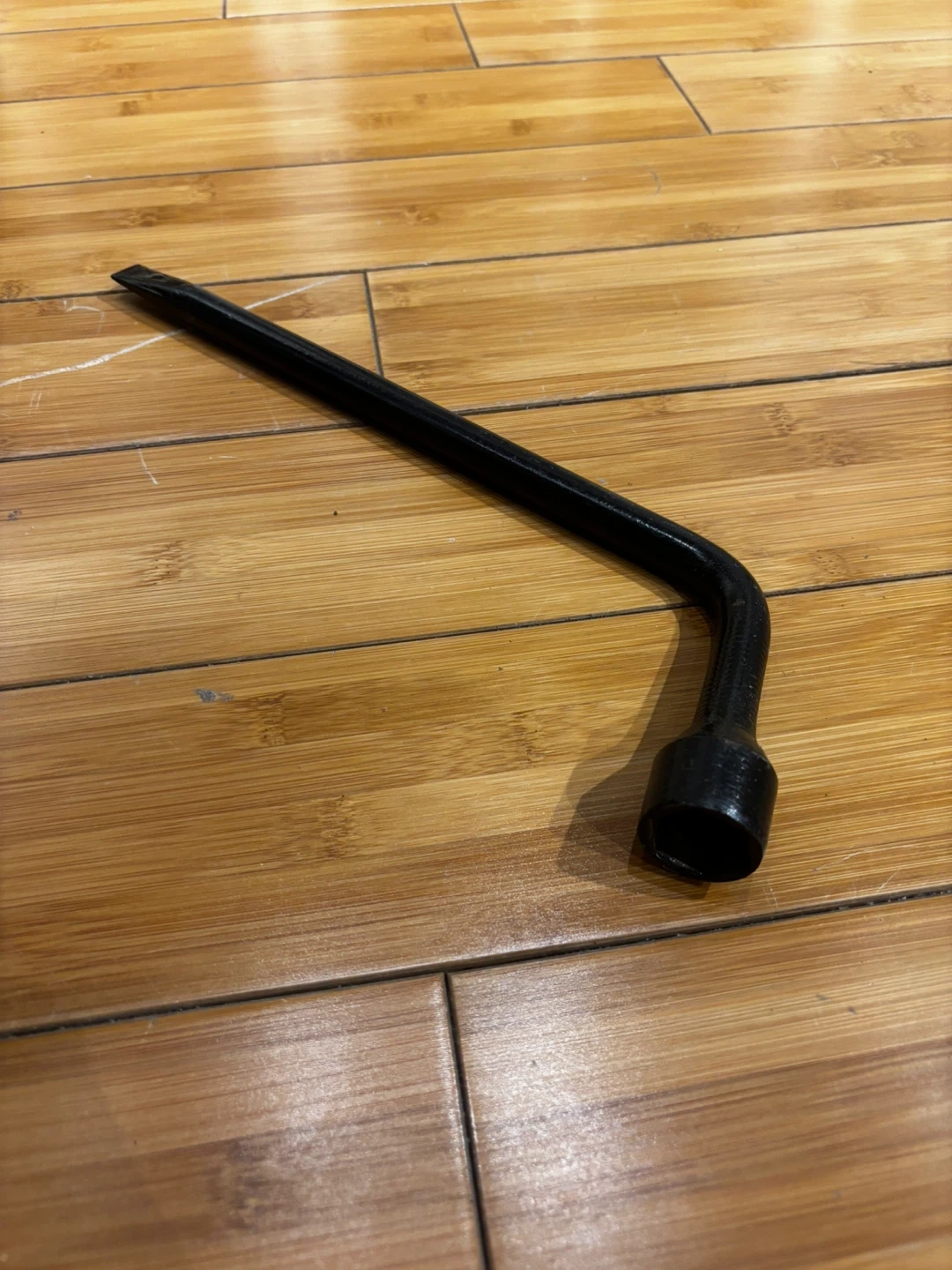This is a black L-shaped lug wrench. It's made of metal and appears to be a standard size for car tires. One end has a socket for lug nuts, and the other end is flat for leverage. 25mm
