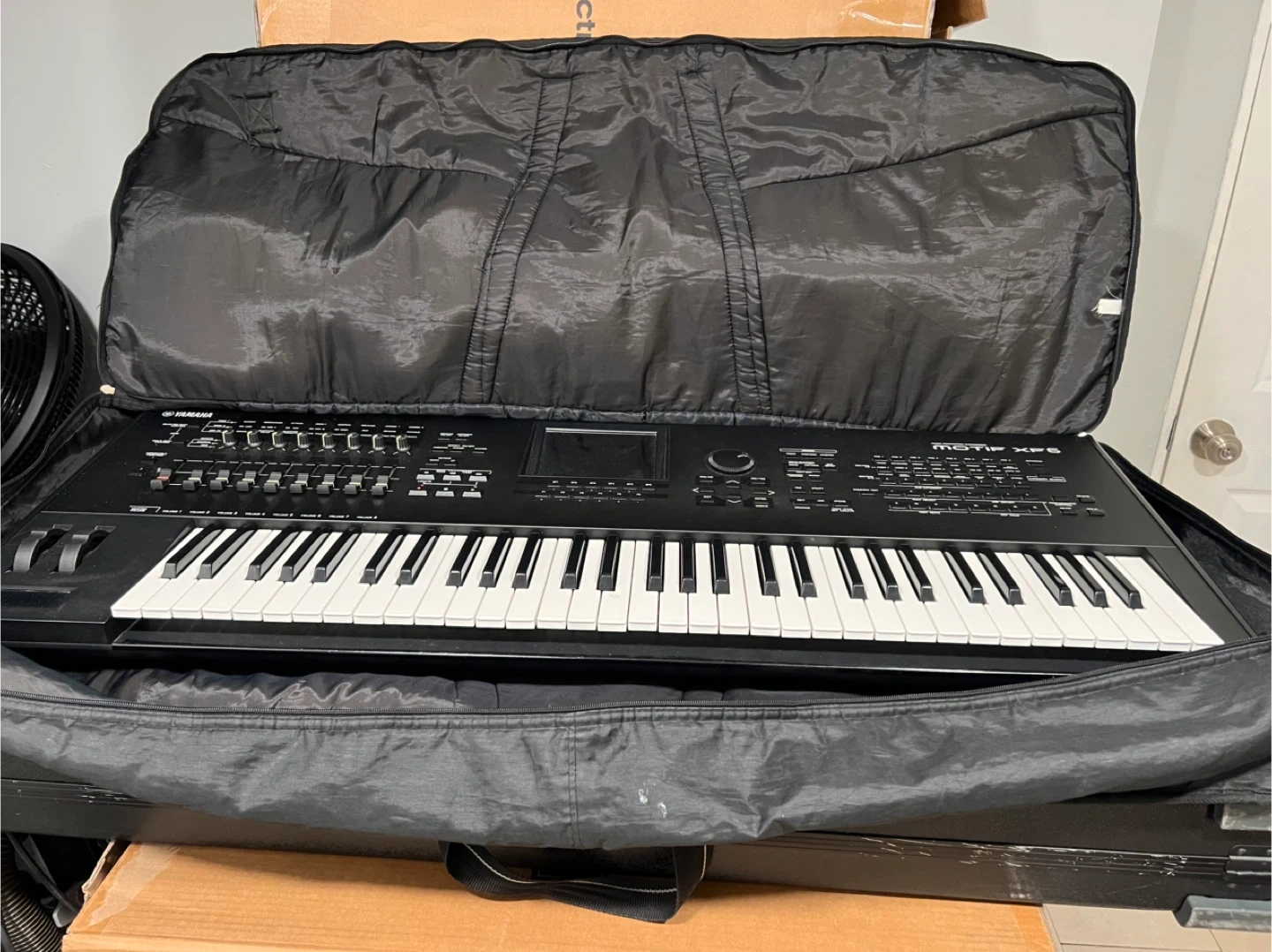 This is a Yamaha Motif XF6 workstation synthesizer keyboard. It comes with a protective gig bag. This keyboard is known for its extensive sound library and sequencing capabilities.
