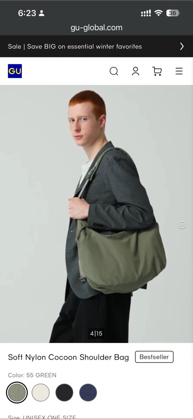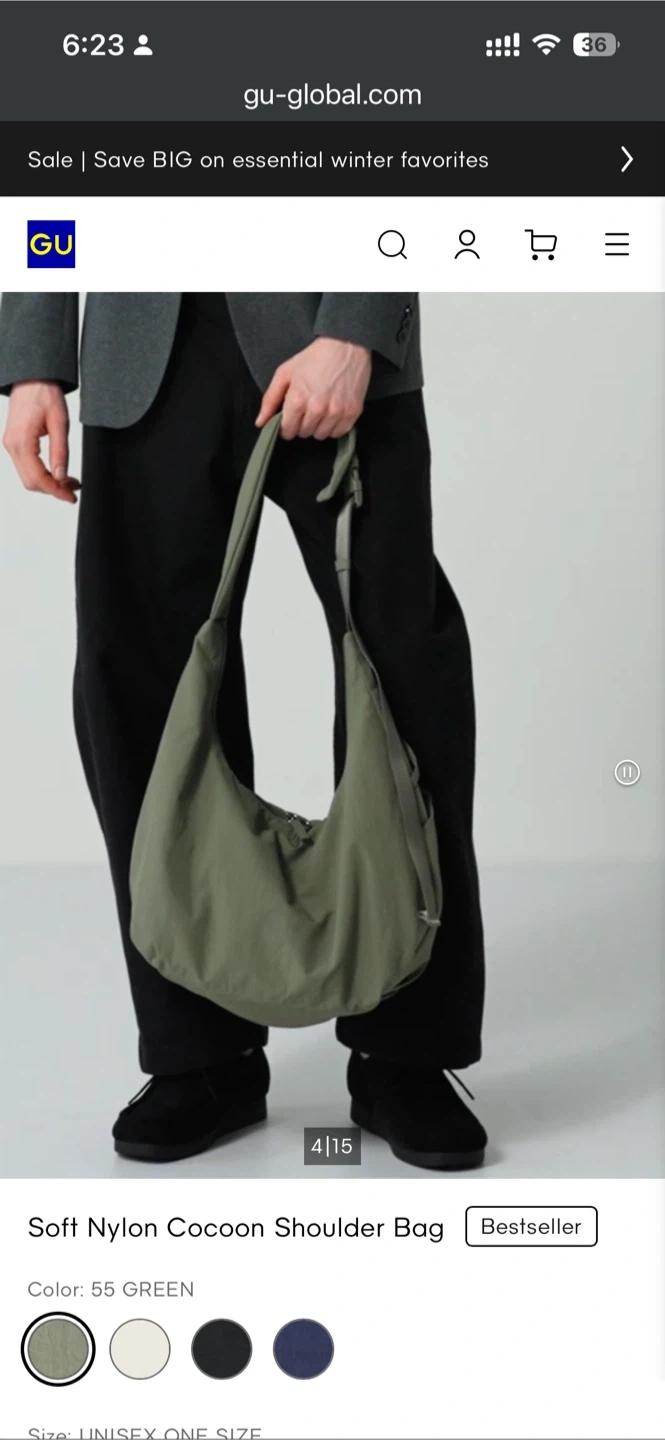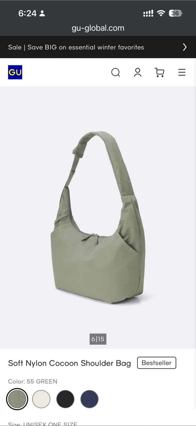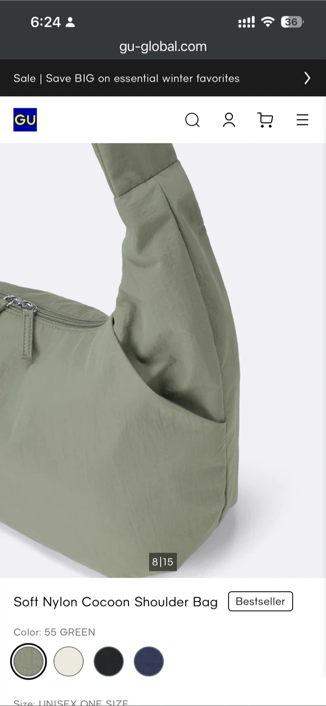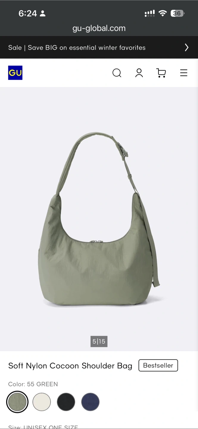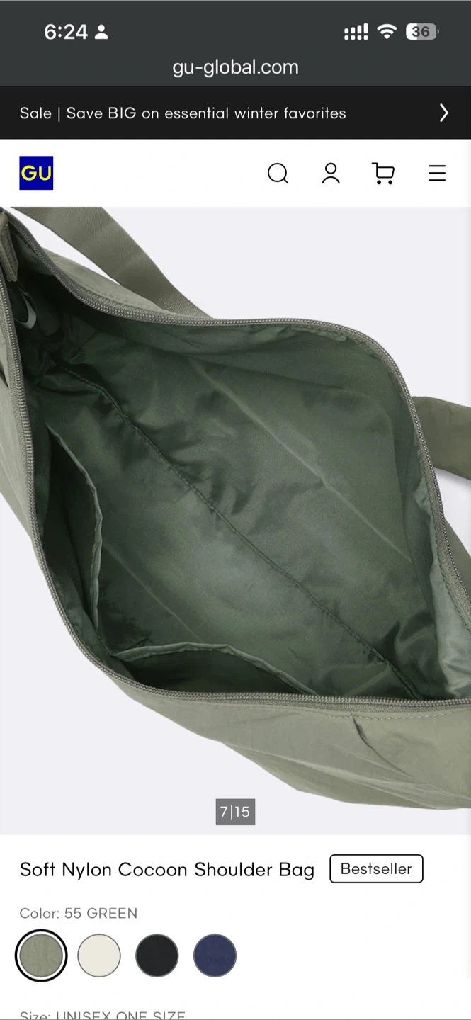 This is a GU Soft Nylon Cocoon Shoulder Bag in green. It's made of nylon and features a zippered main compartment with interior pockets. The size is unisex one size.