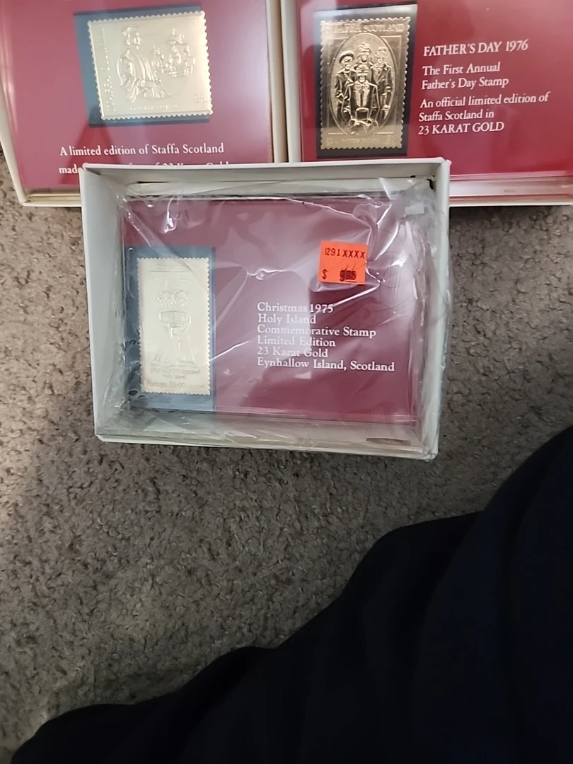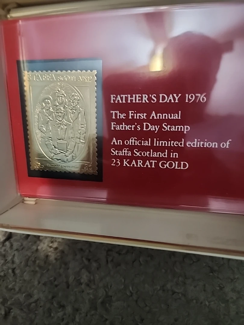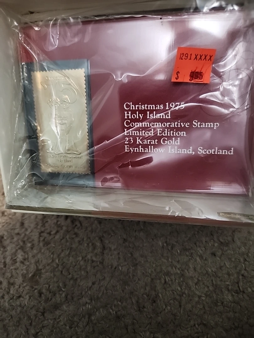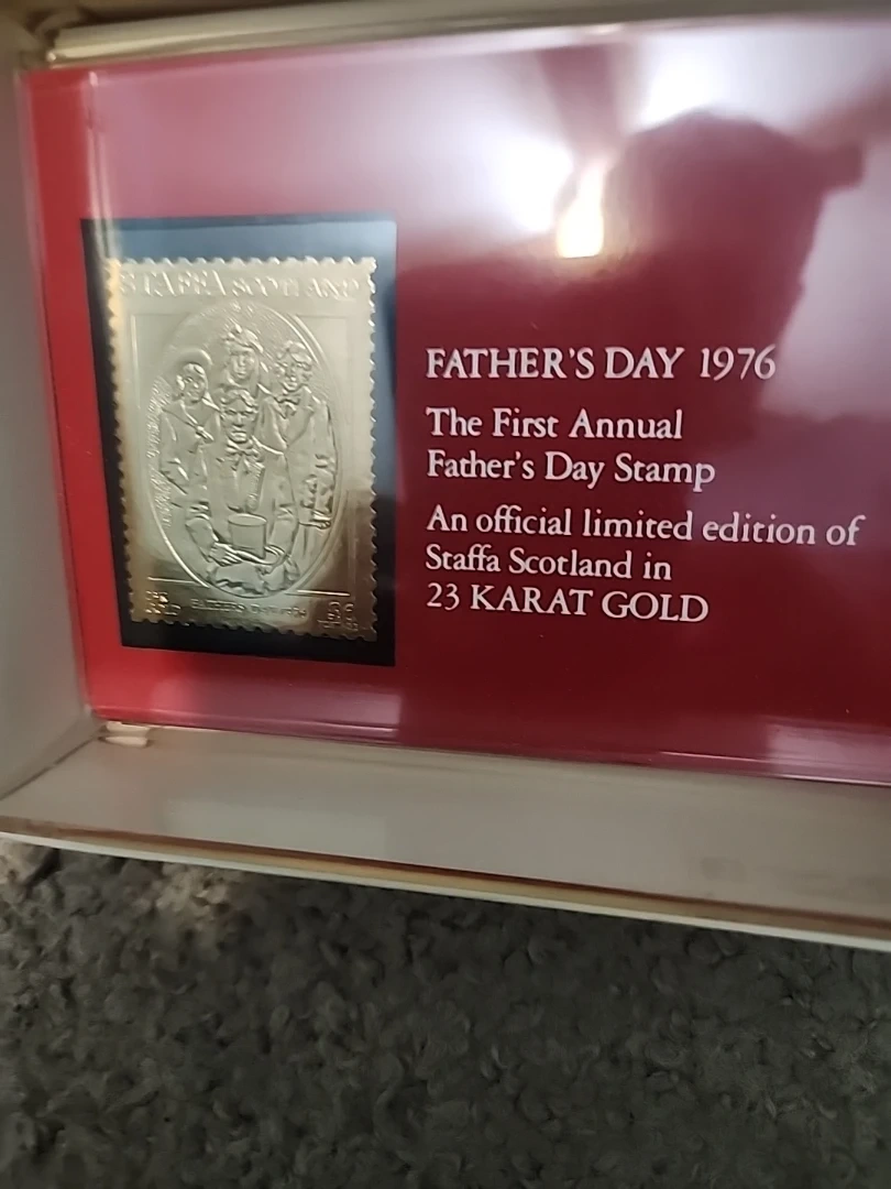 Collection of official limited edition commemorative stamps made with a surface of 23 Karat Gold from Staffa Scotland. Includes Father's Day 1976, Columbus Day 1976, and Christmas 1975 Holy Island stamps. Presented in protective packaging.