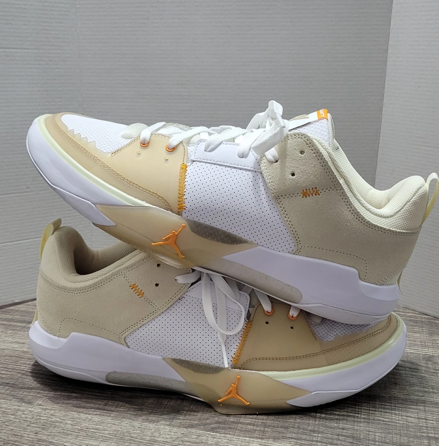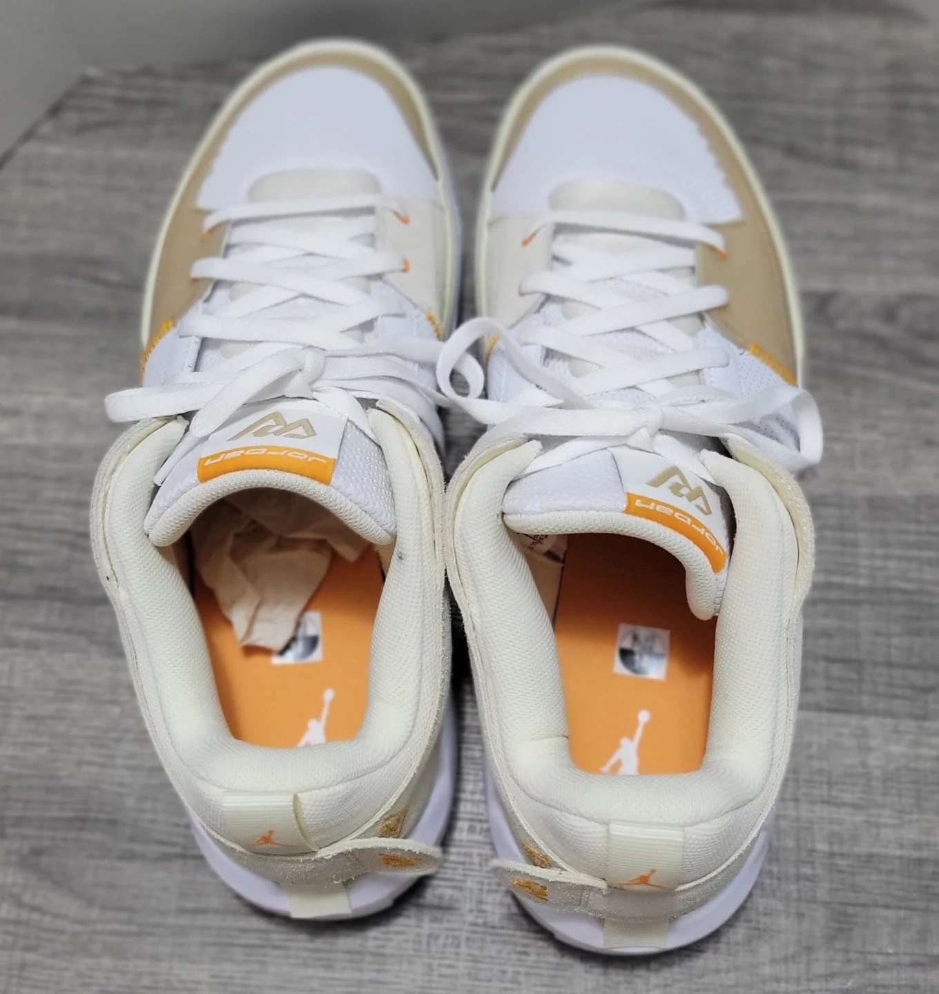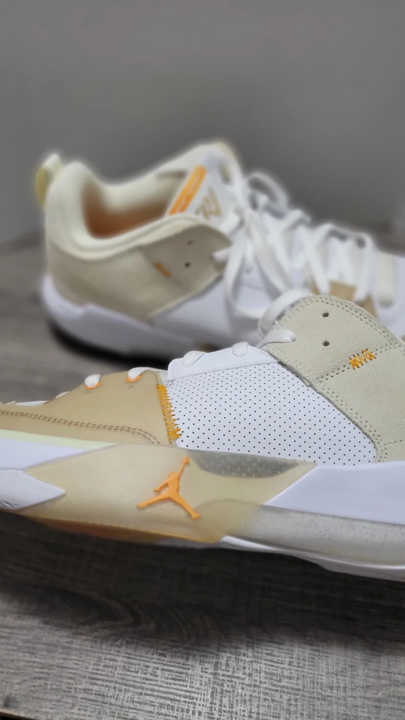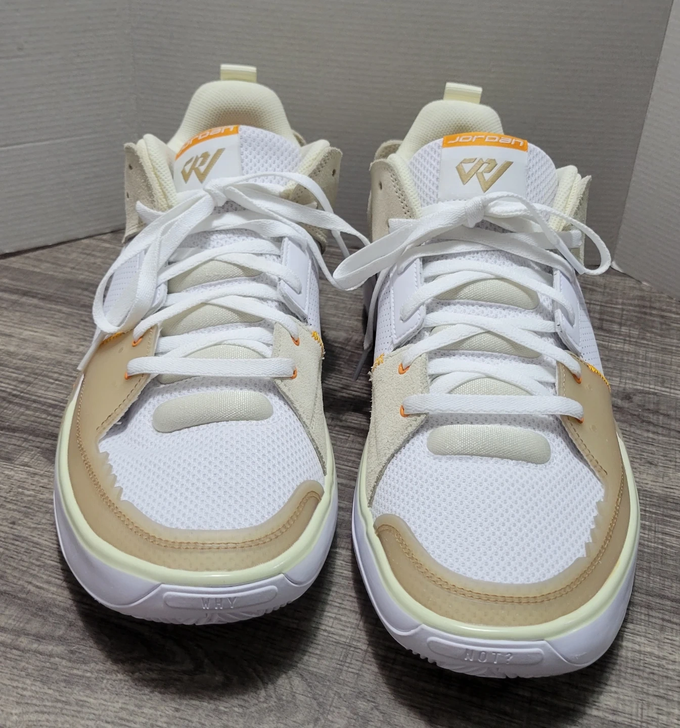These are Jordan Why Not Zer0.5 basketball shoes. They're a size 14 US. Made in Vietnam with a mix of white, tan, and orange accents.
