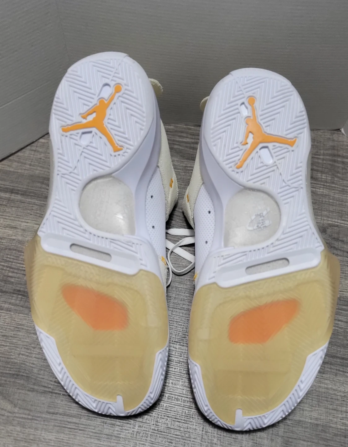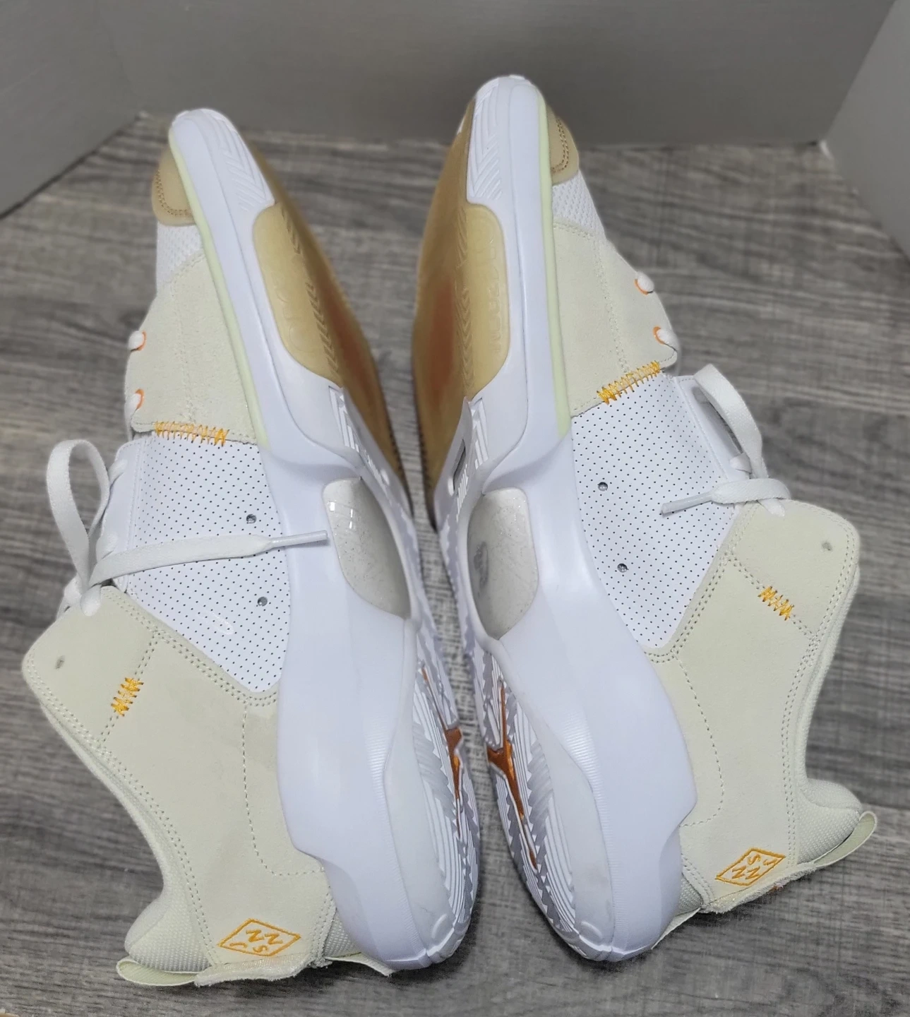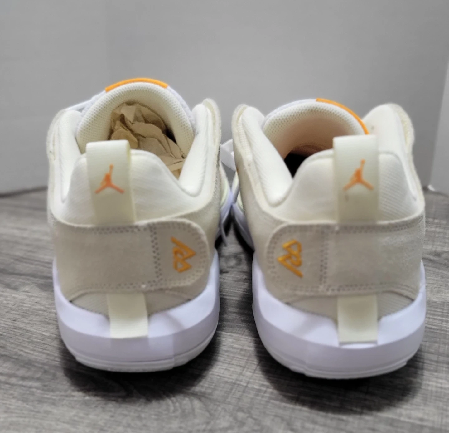 These are Jordan Why Not Zer0.5 basketball shoes. They're a size 14 US. Made in Vietnam with a mix of white, tan, and orange accents.