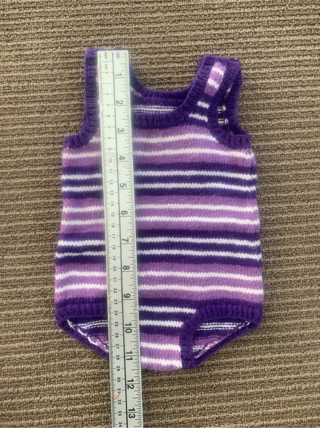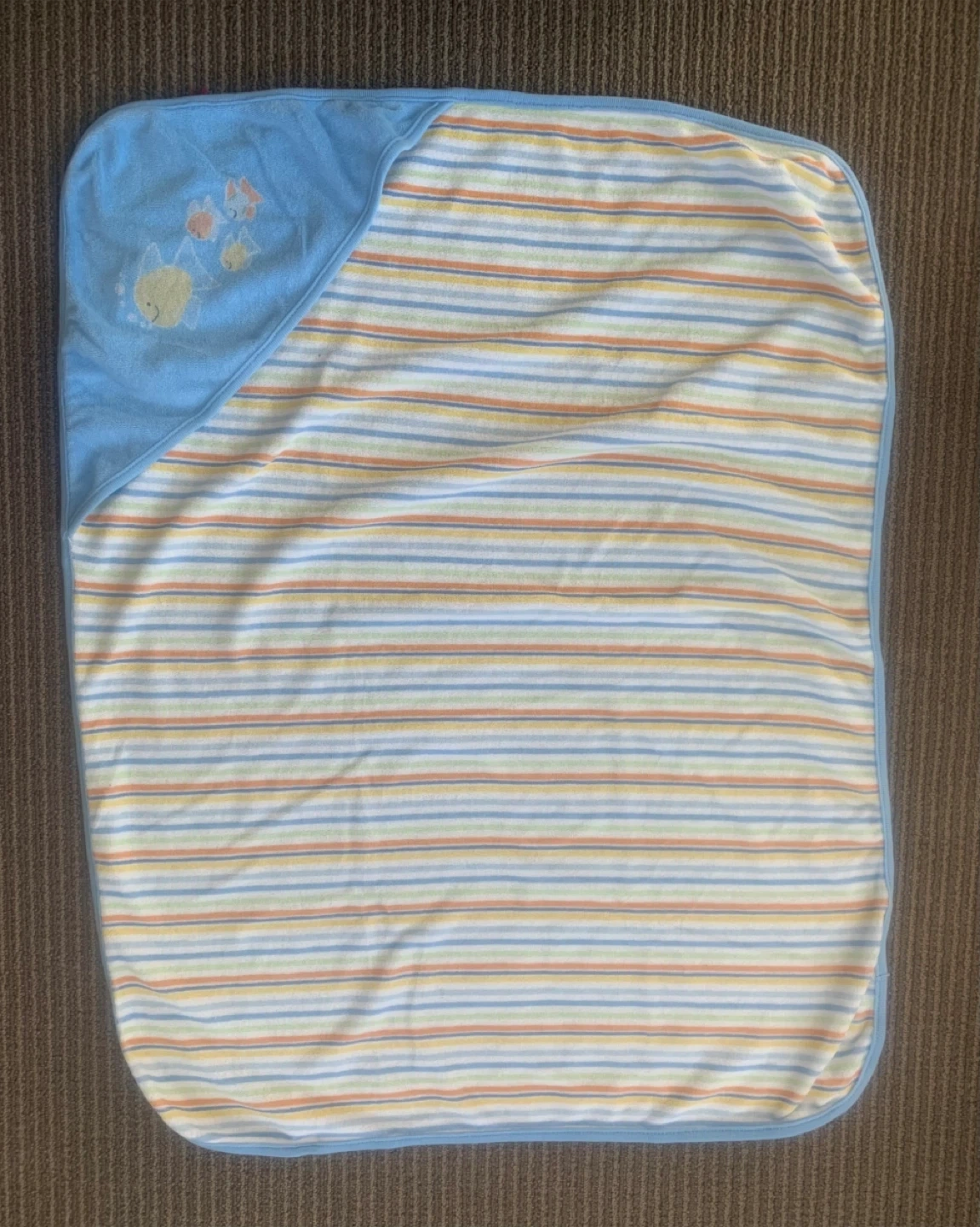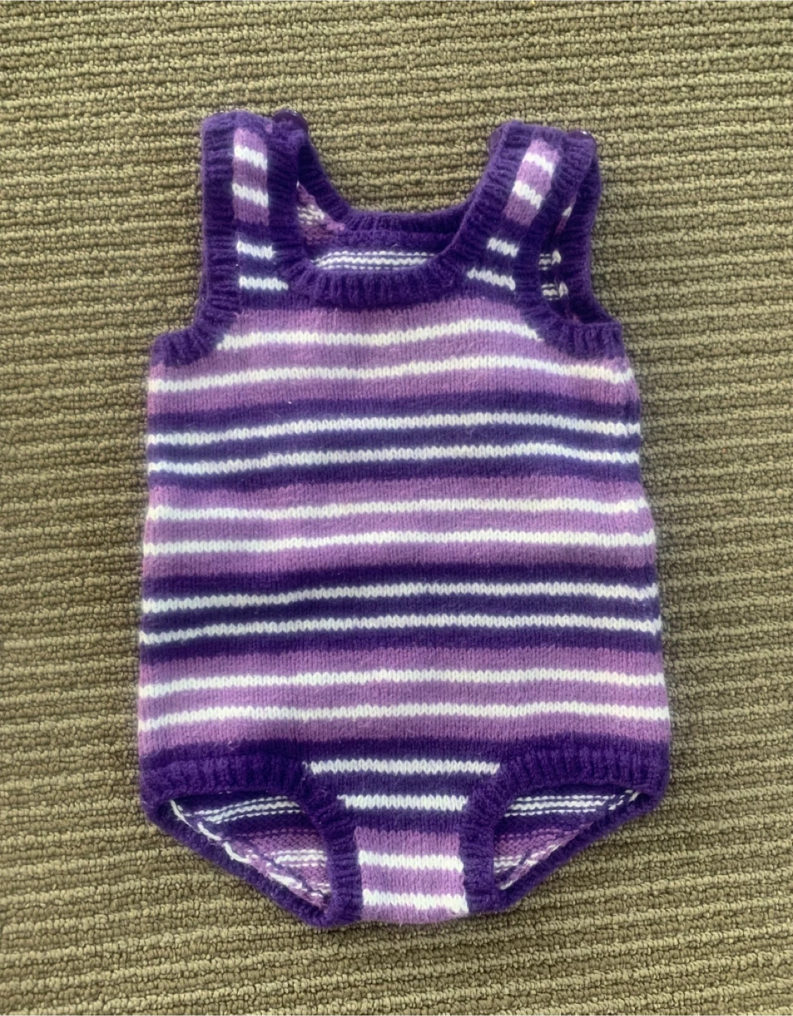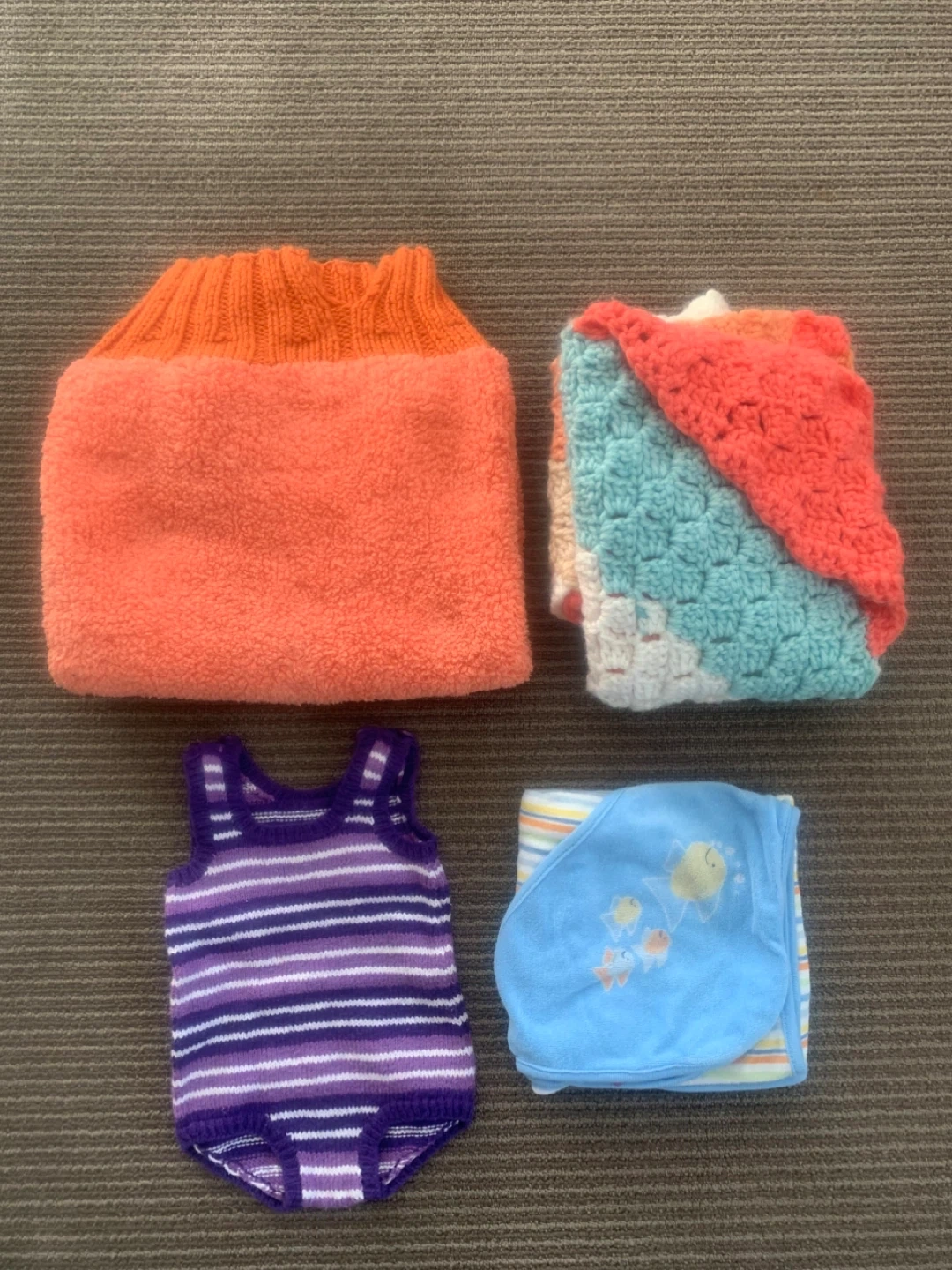 Includes a knitted purple and white striped onesie, an orange knitted bunting, a crocheted striped blanket, and a hooded baby towel with fish detail.
