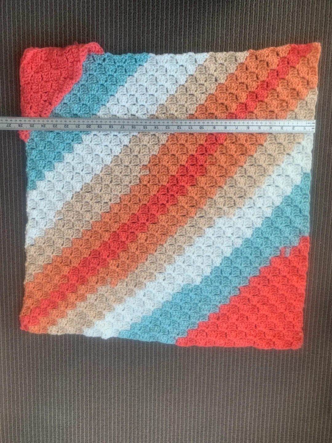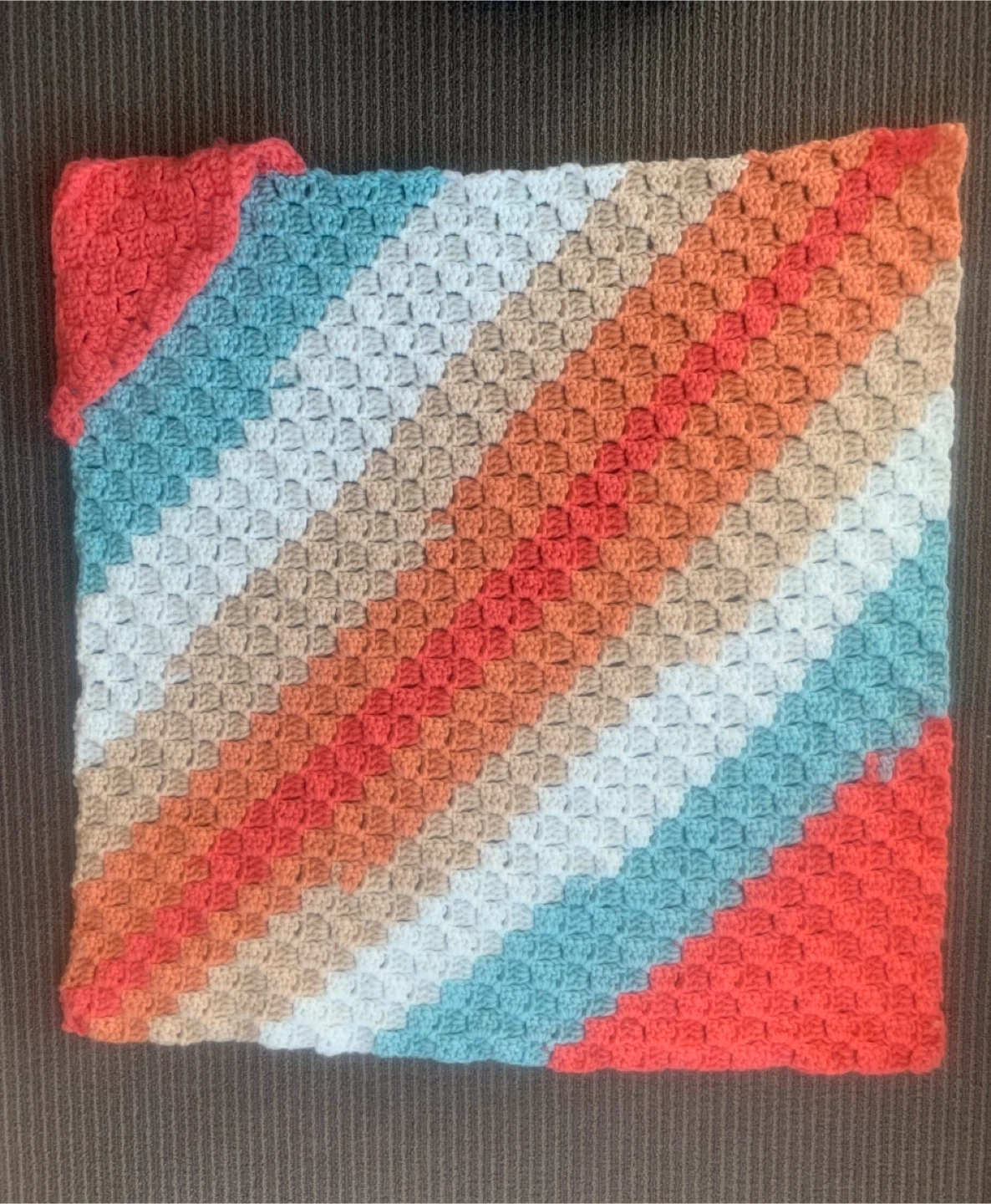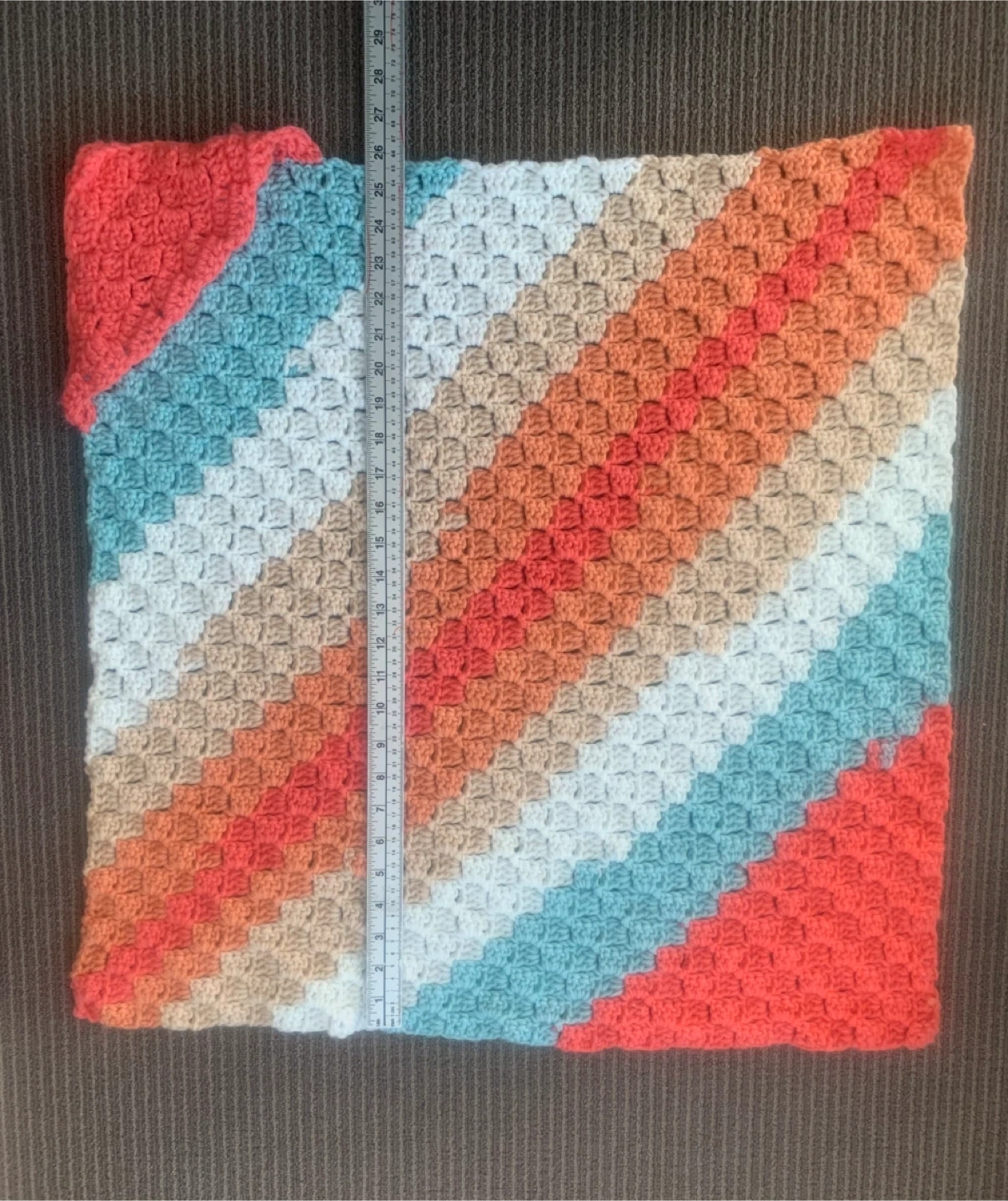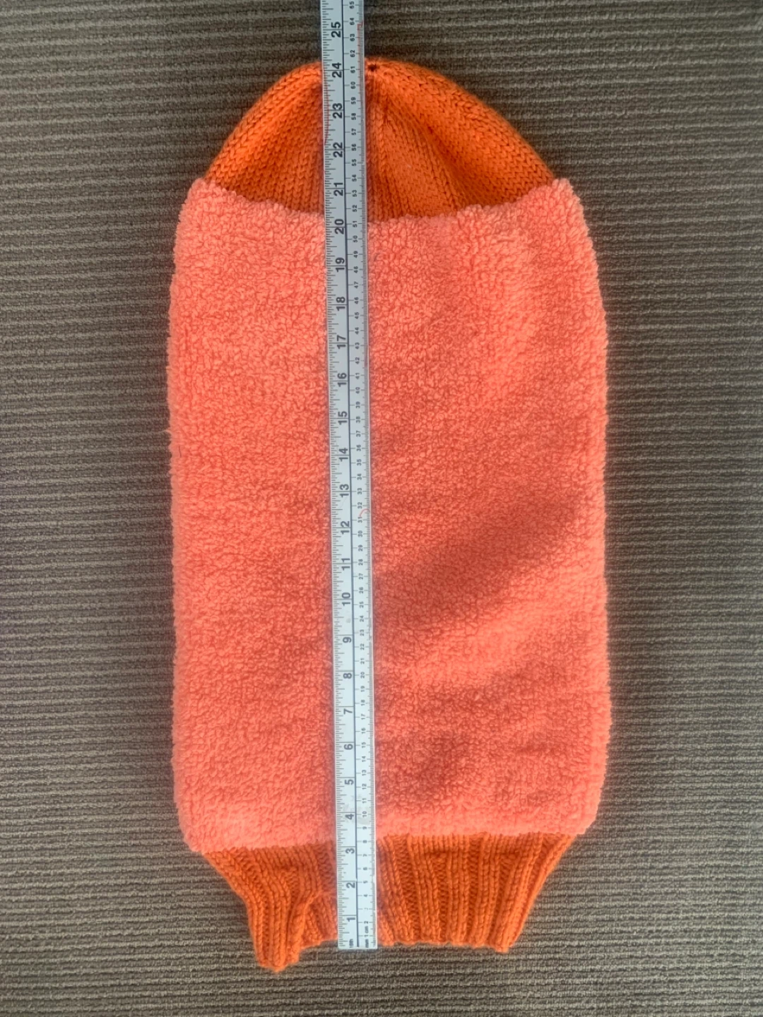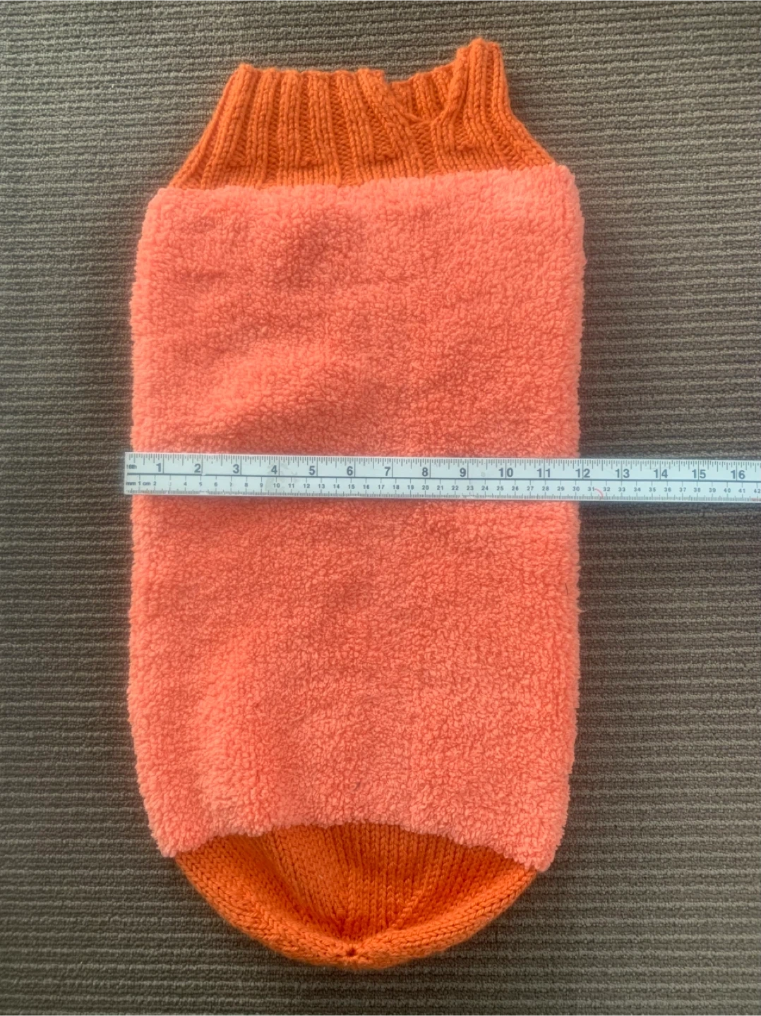 Includes a knitted purple and white striped onesie, an orange knitted bunting, a crocheted striped blanket, and a hooded baby towel with fish detail.