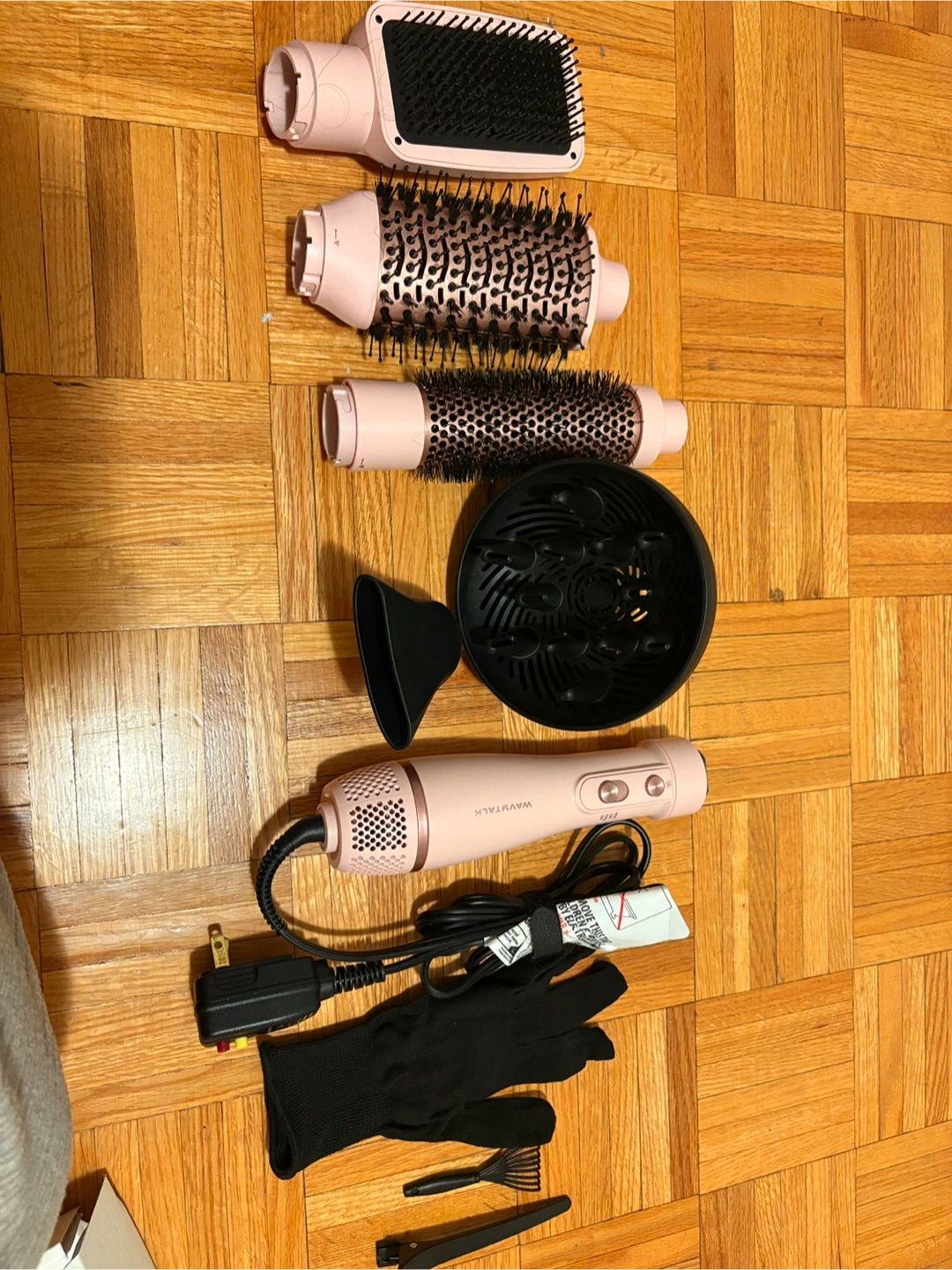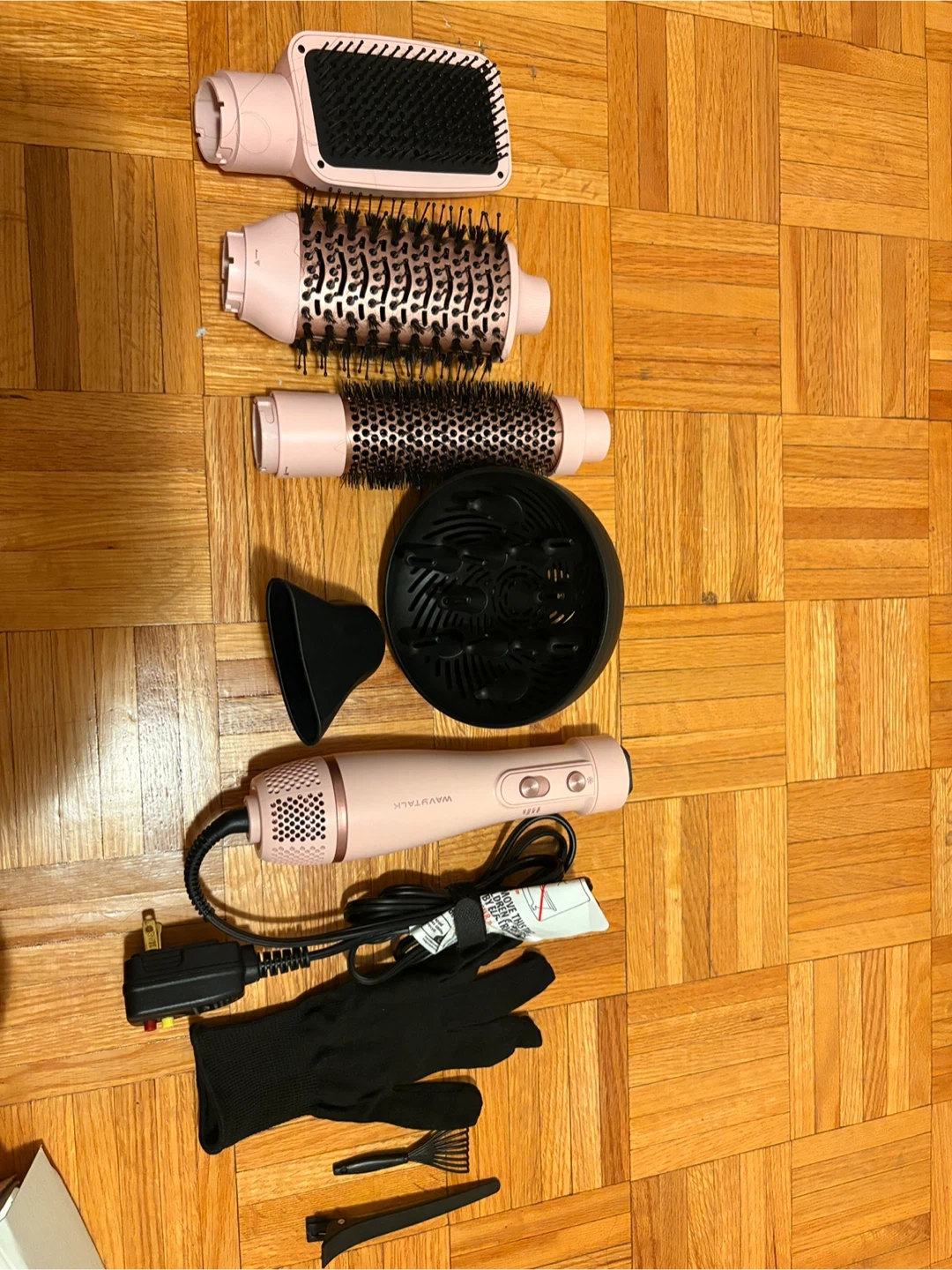 This WavyTalk 5-in-1 Hot Air Brush Set comes with a handle and multiple attachments. It includes a paddle brush, round brush (1.5"/38mm), and oval brush (2.4"/60mm). A concentrator nozzle and a diffuser are also included. A pair of heat-resistant gloves and clips are also part of the set.