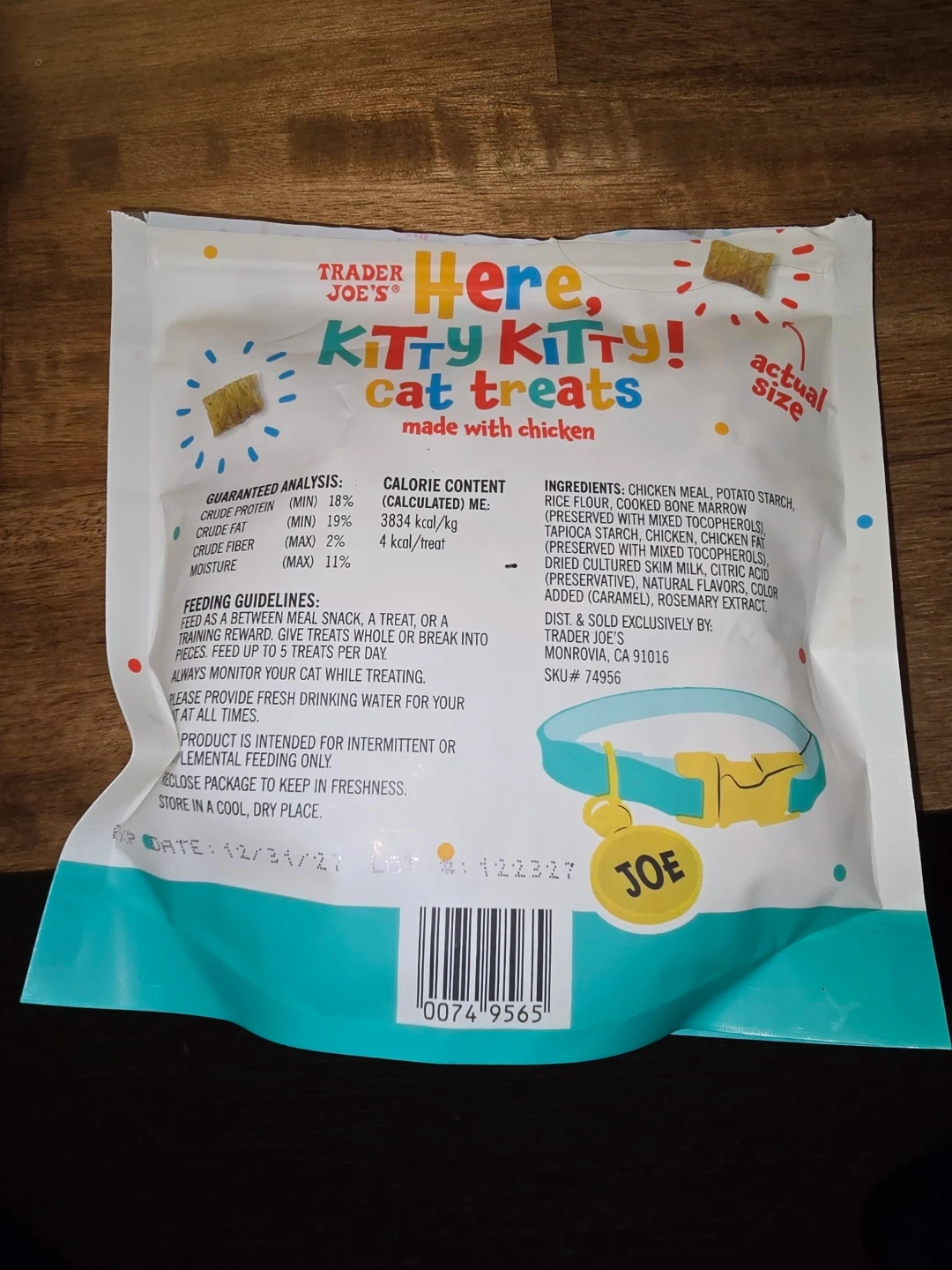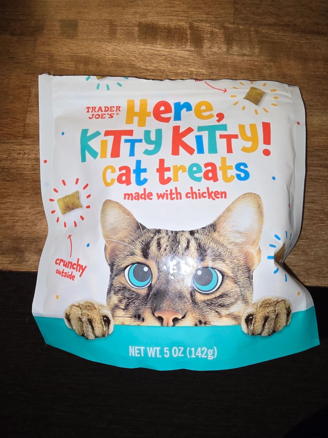 Trader Joe's Here, Kitty Kitty! cat treats are made with chicken. They have a crunchy outside. Net wt. 5 oz (142g).
