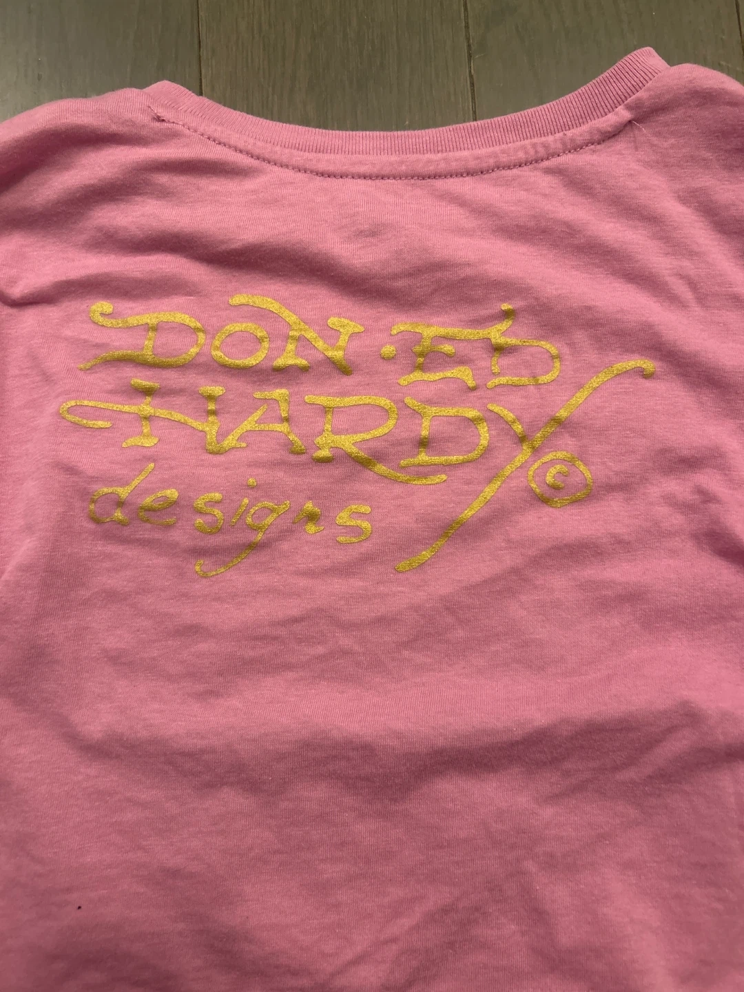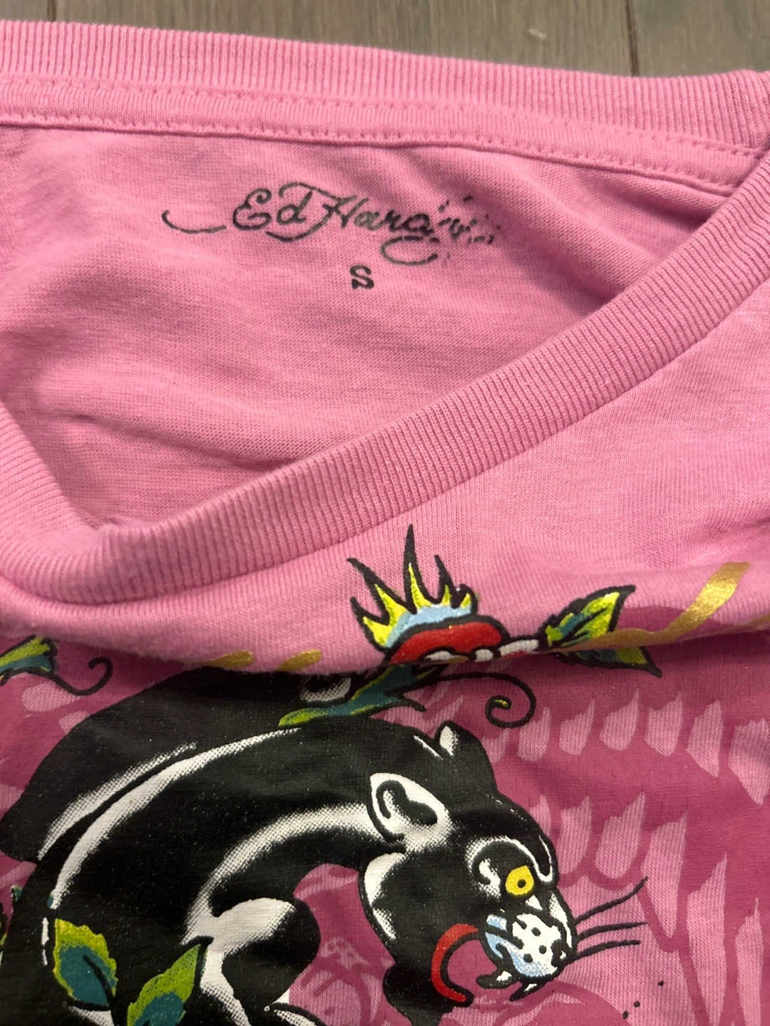 This is an Ed Hardy long-sleeve shirt in pink with a panther and floral design. It features the brand's signature graphic print. Size S.