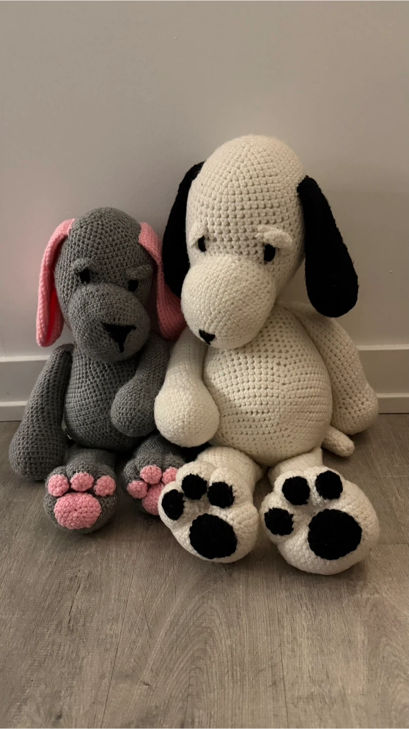 Two adorable, handmade crocheted dog in great condition. One is white with black ears and paws, and the other is grey with pink ears and paws.
