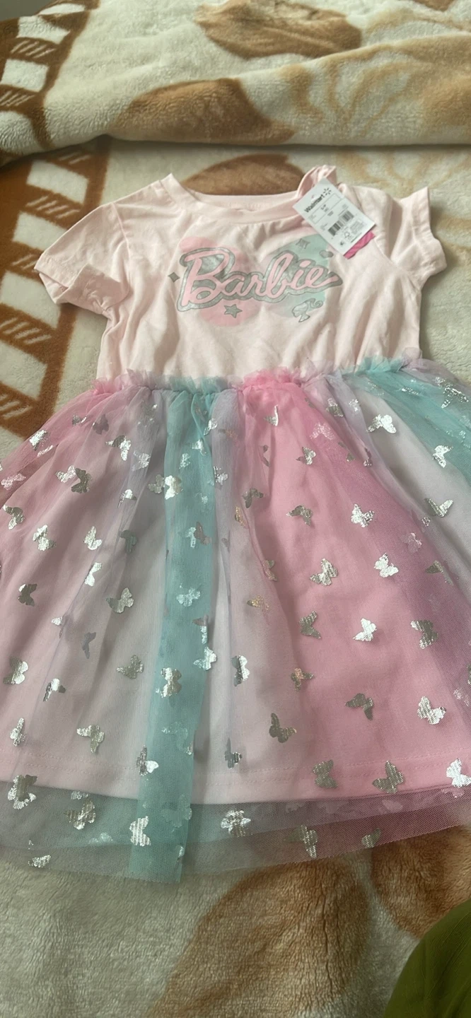This Barbie dress features a sparkly sequin bodice and a colourful tutu skirt with butterfly appliques. It's perfect for parties or dress-up fun! Made with a comfortable cotton blend top.