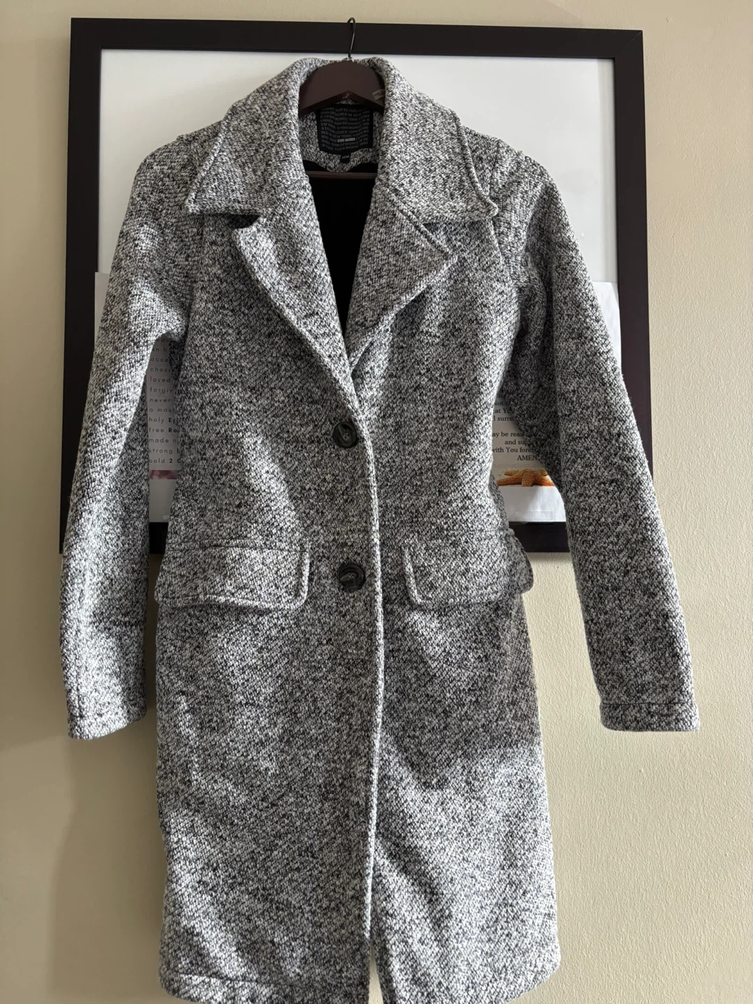 This Steve Madden tweed coat is grey and black. It's a stylish piece for cooler weather. Features two front pockets and a double-breasted button closure.