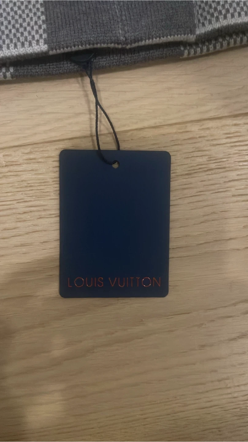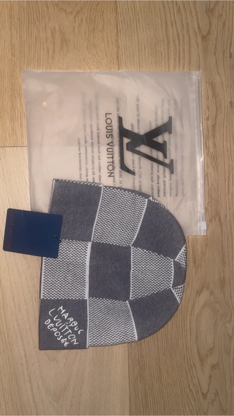 This is a Louis Vuitton beanie hat with a grey checkerboard pattern. It comes with its original packaging and dust bag. Perfect for keeping warm in style!