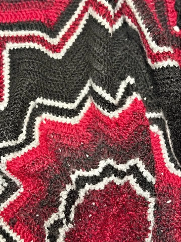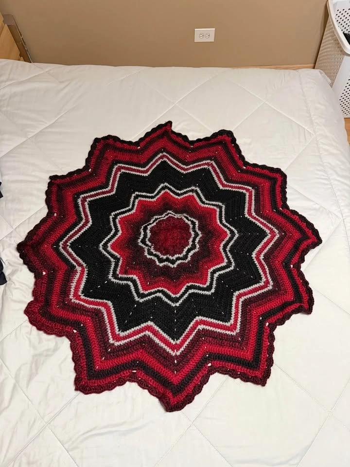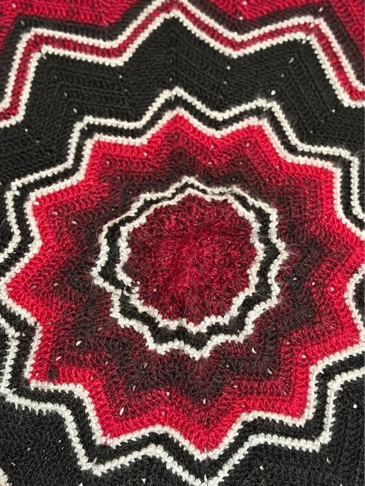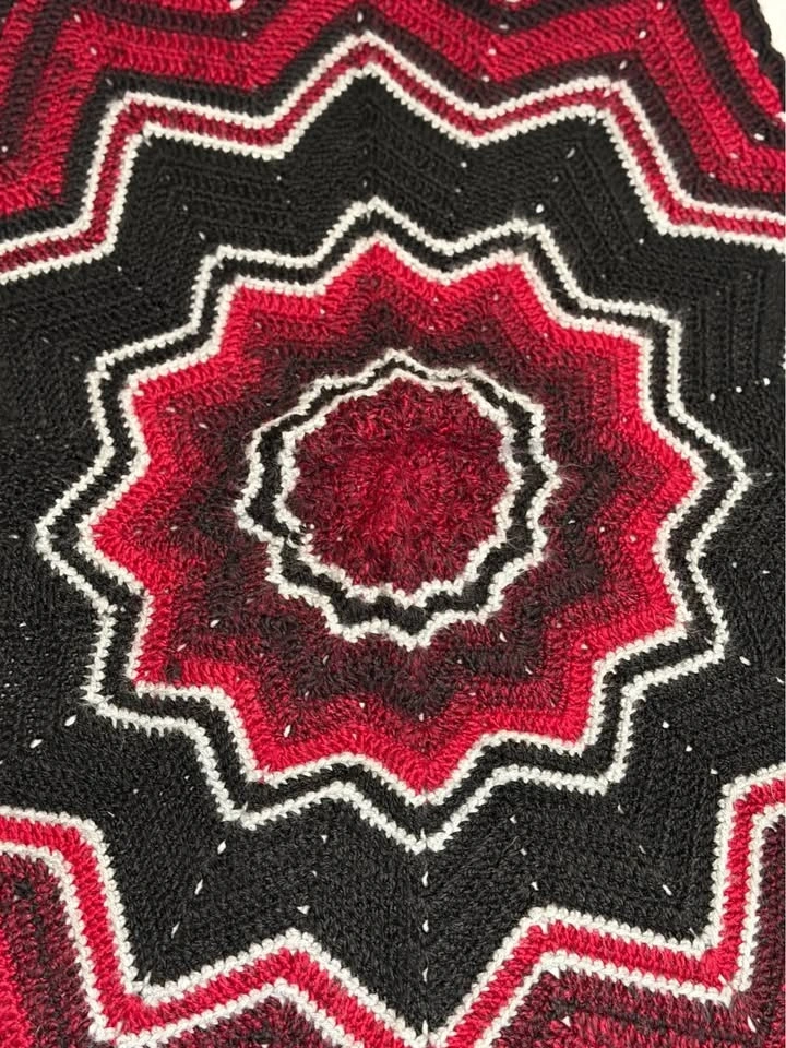 Beautiful handmade crochet blanket featuring a bold starburst design in rich red, black, and white tones. This unique geometric throw adds warmth, texture, and a dramatic pop of color to any space. Perfect for draping over a couch, accent chair, reading nook, or using as a cozy lap blanket. The layered star shape creates a striking decorative piece that feels both modern and handmade. Approximate size: 39” diameter (high points), 33” diameter (low points). Perfect for: Couch décor, Accent chair throw, Cozy lap blanket, Holiday or winter décor, Handmade gift, Statement home accent. Each blanket is lovingly handmade and one of a kind. Cash only.
