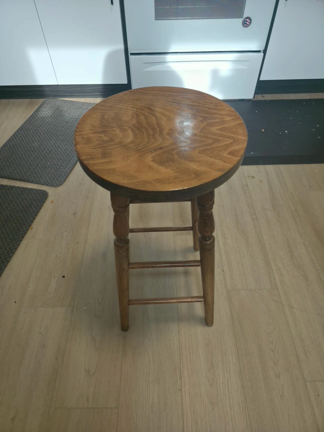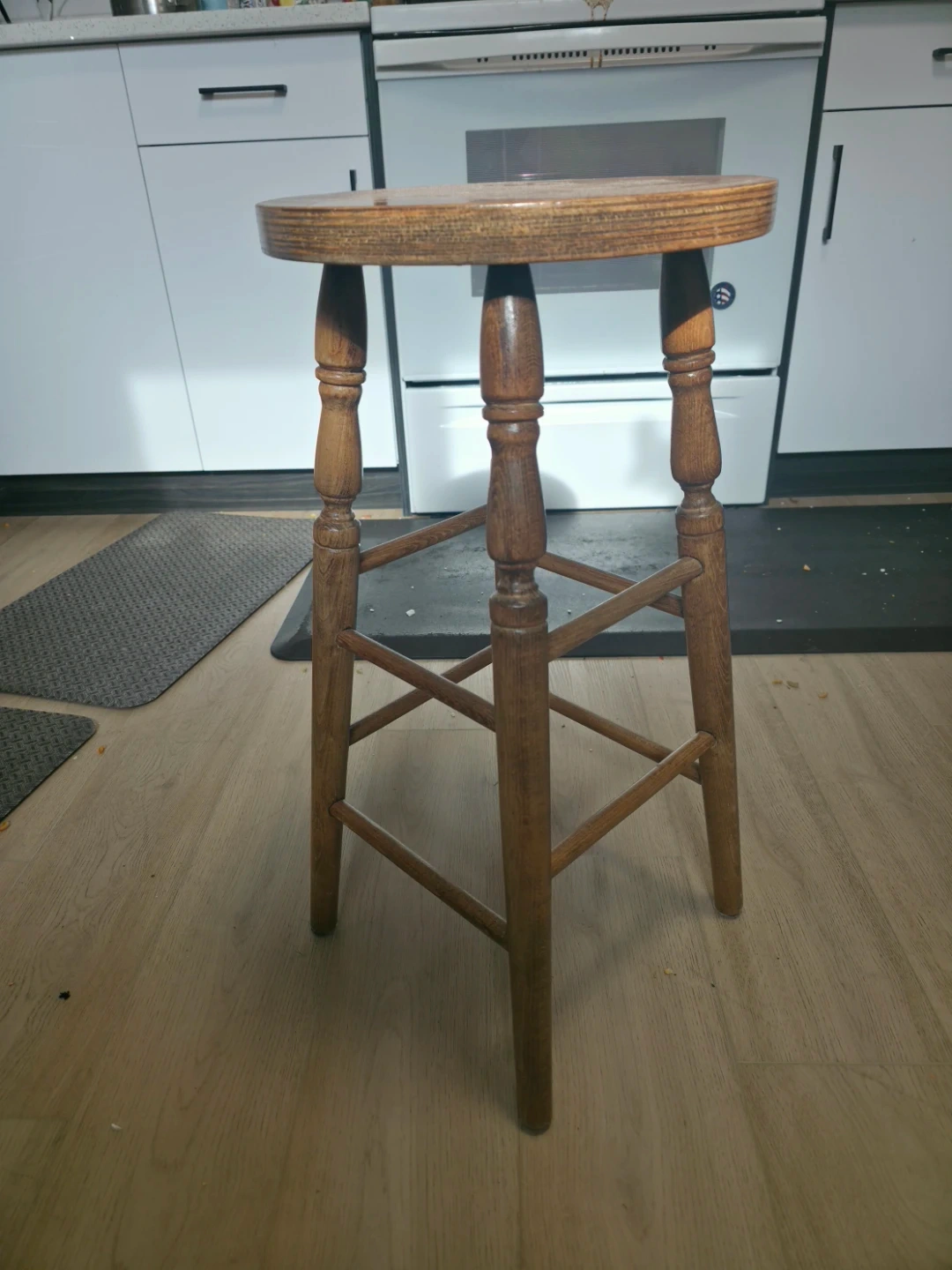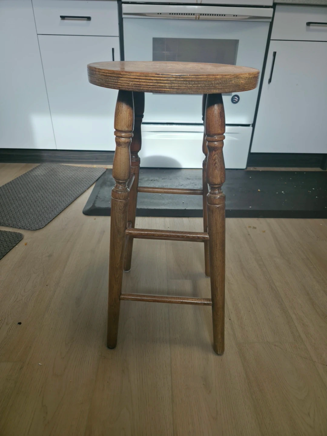 This is a sturdy wooden bar stool. It features a round seat and turned legs with cross braces for added stability. Wood material.
