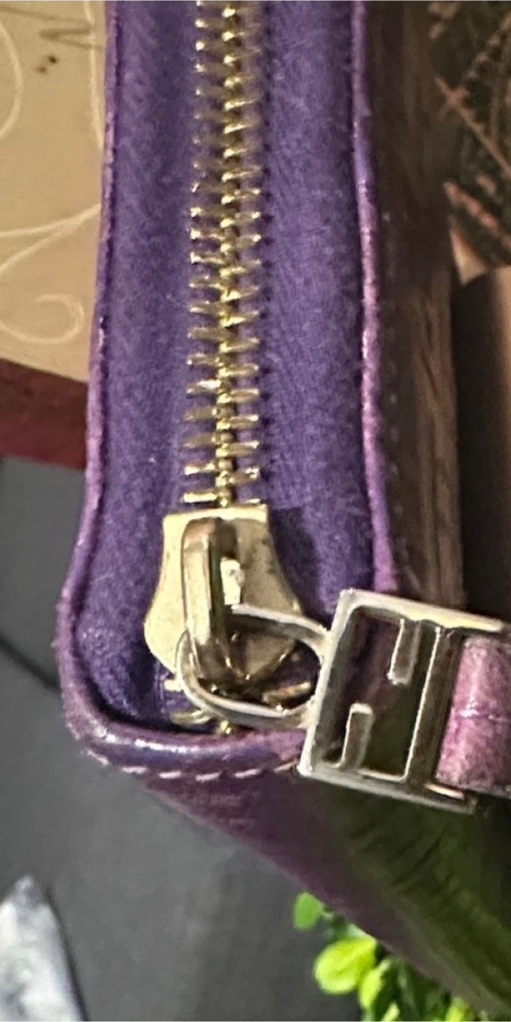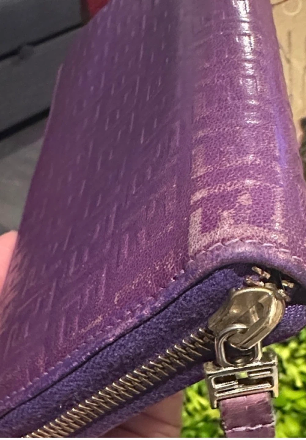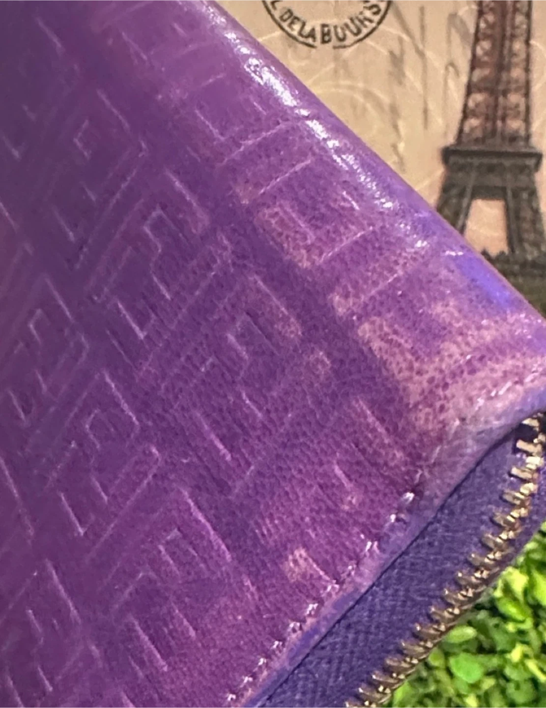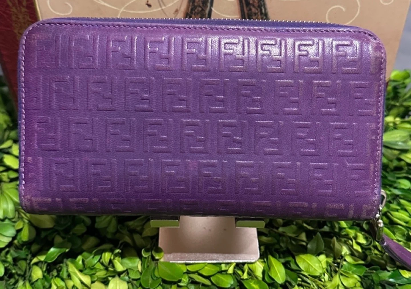 A purple Fendi zip-around wallet with embossed logo pattern. It has multiple card slots and a zippered coin pocket. This wallet is made of leather.