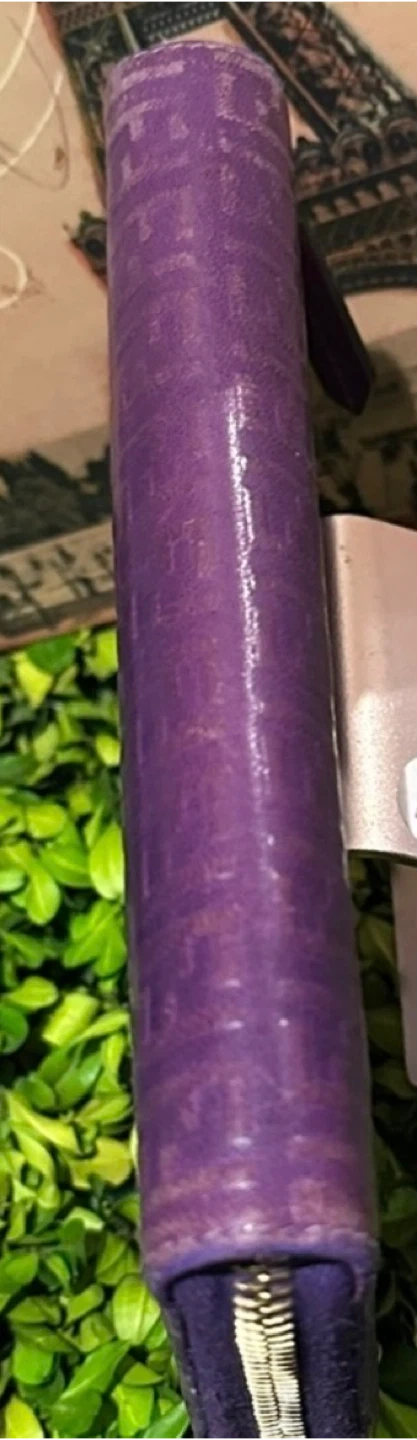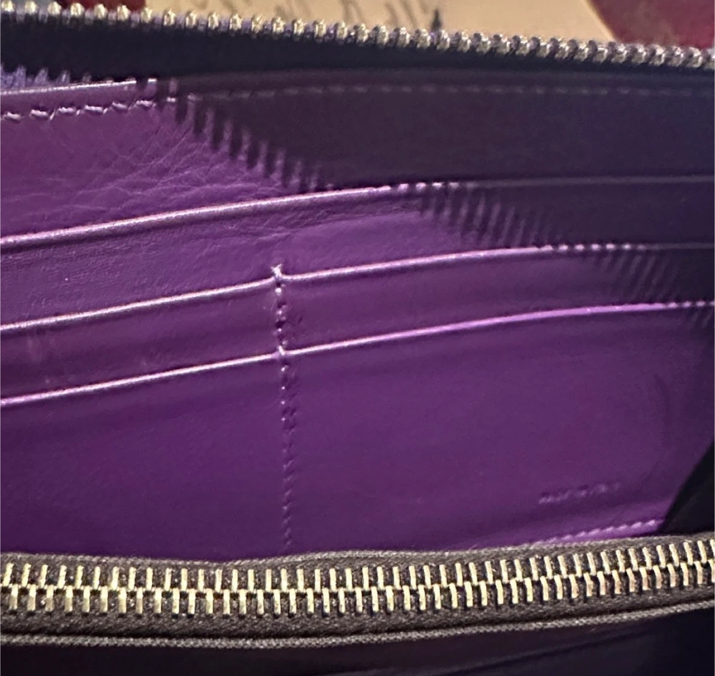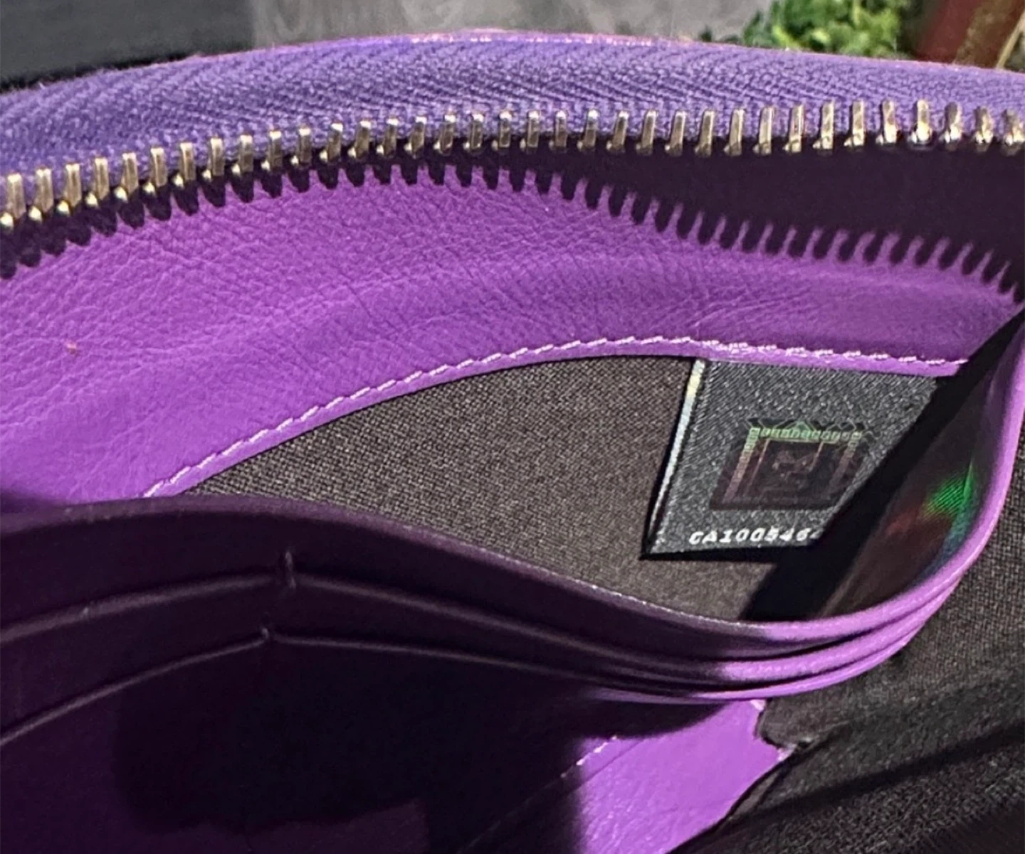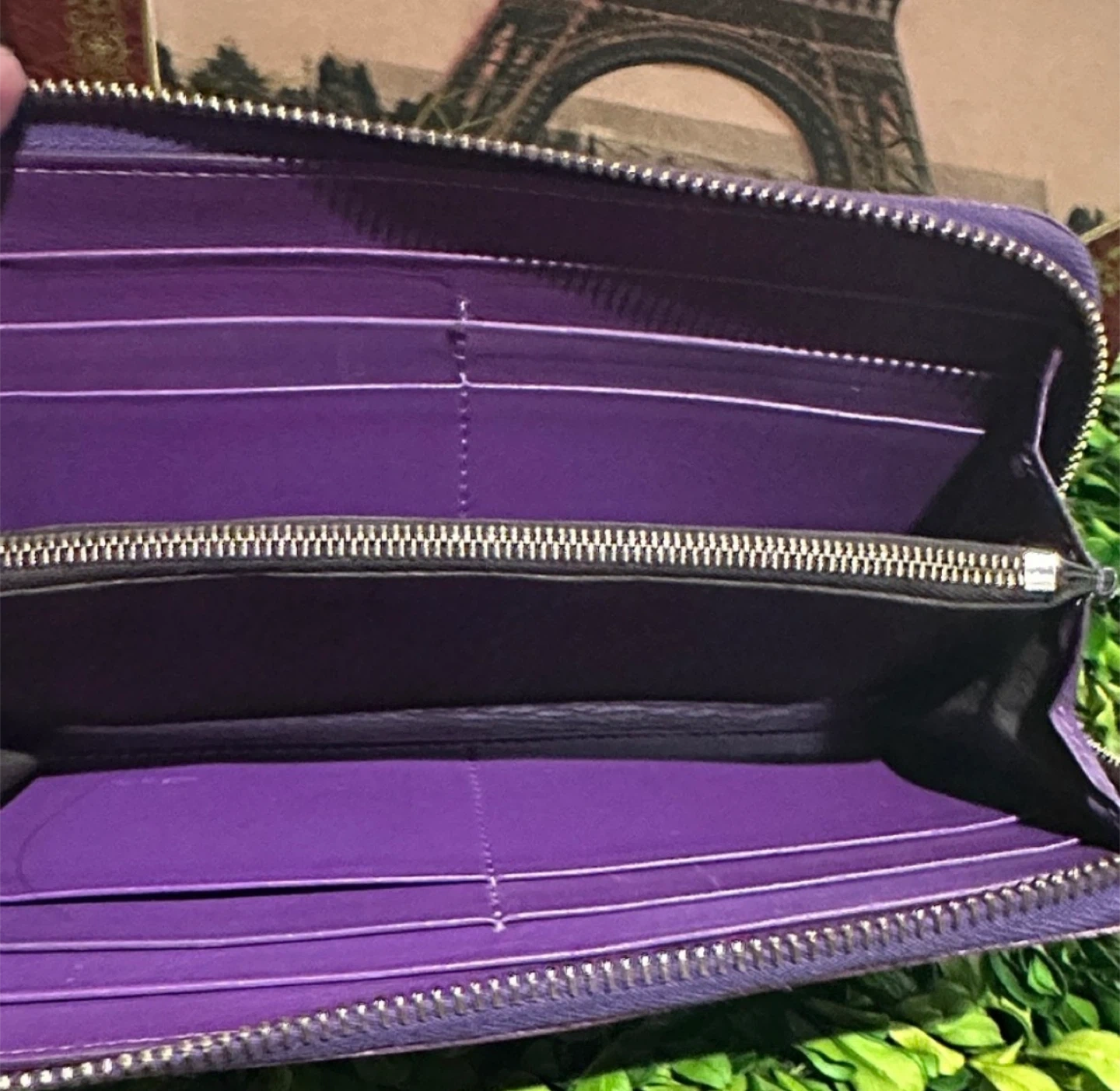 A purple Fendi zip-around wallet with embossed logo pattern. It has multiple card slots and a zippered coin pocket. This wallet is made of leather.