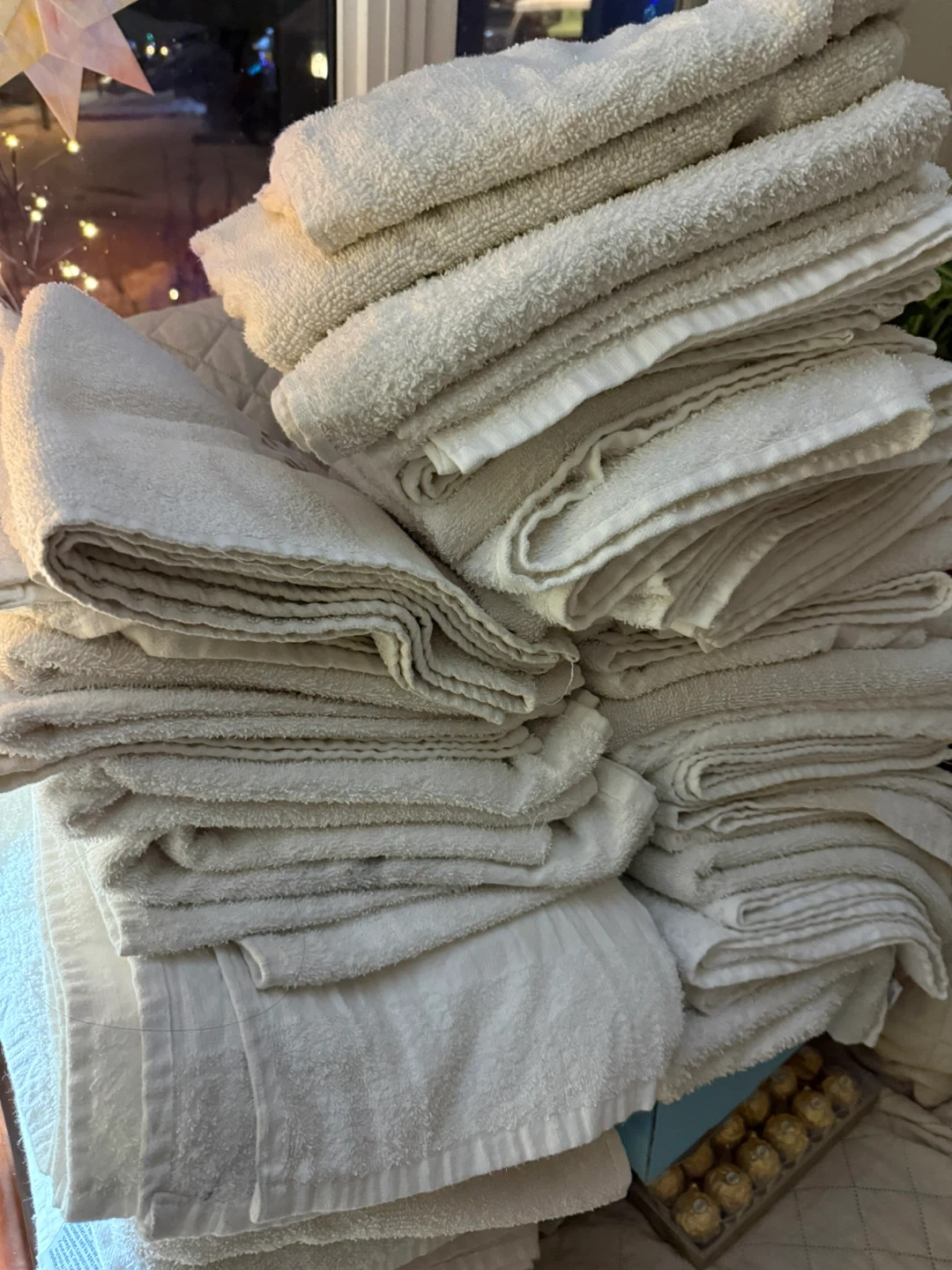 My gym is very particular. Towels with any stains or marks are set aside for the cleaners to use. Problem is, they get too many. I have a constant supply. Usually I give 10 per person.