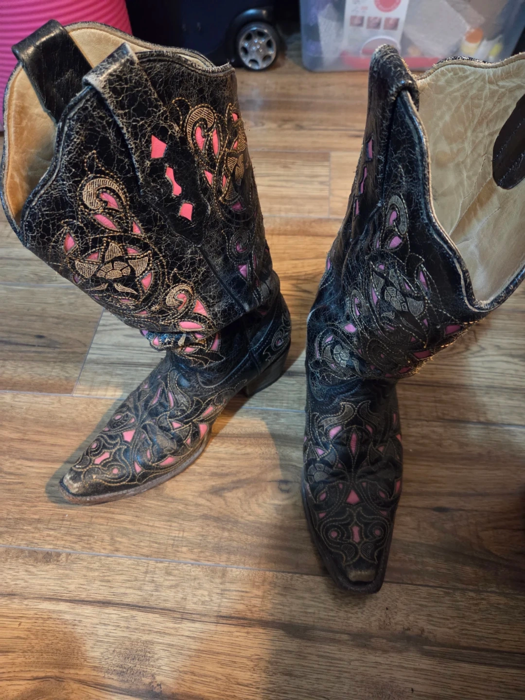 Selling a pair of genuine Corral cowboy boots! They're black with a pink embroidered design. These boots have some signs of wear, particularly on the toes, but they still have lots of life left in them!