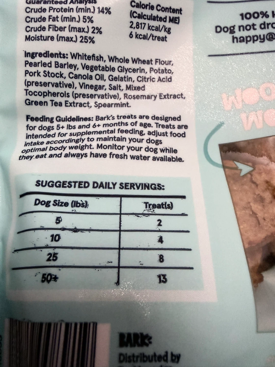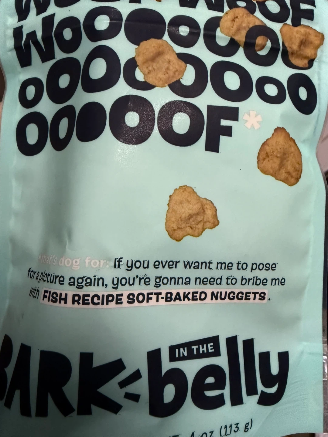 Free, first to pick up. BarkBox dog treats in a fish recipe. These are soft-baked nuggets. Bag contains 4 oz (113 g). Treats are designed for dogs 5+ lbs and 6+ months of age.