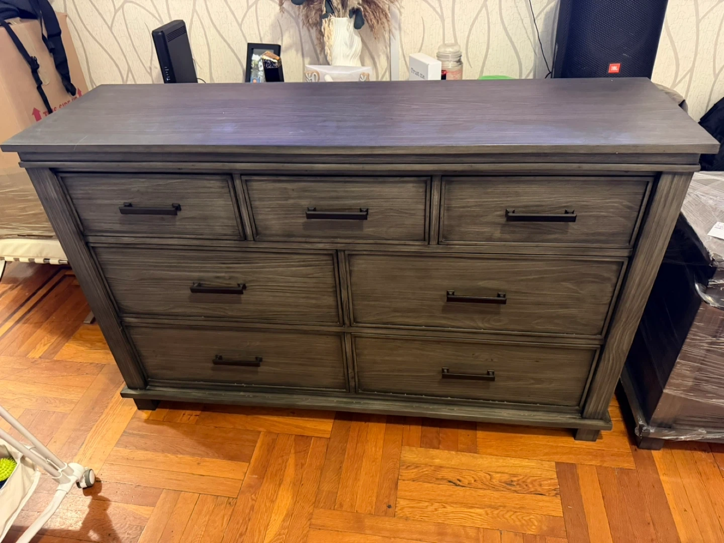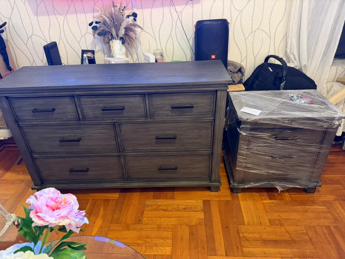 This is a dresser and a matching nightstand. Both pieces are made of gray wood. The dresser has seven drawers and the nightstand has three drawers. They're a nice addition to any bedroom!