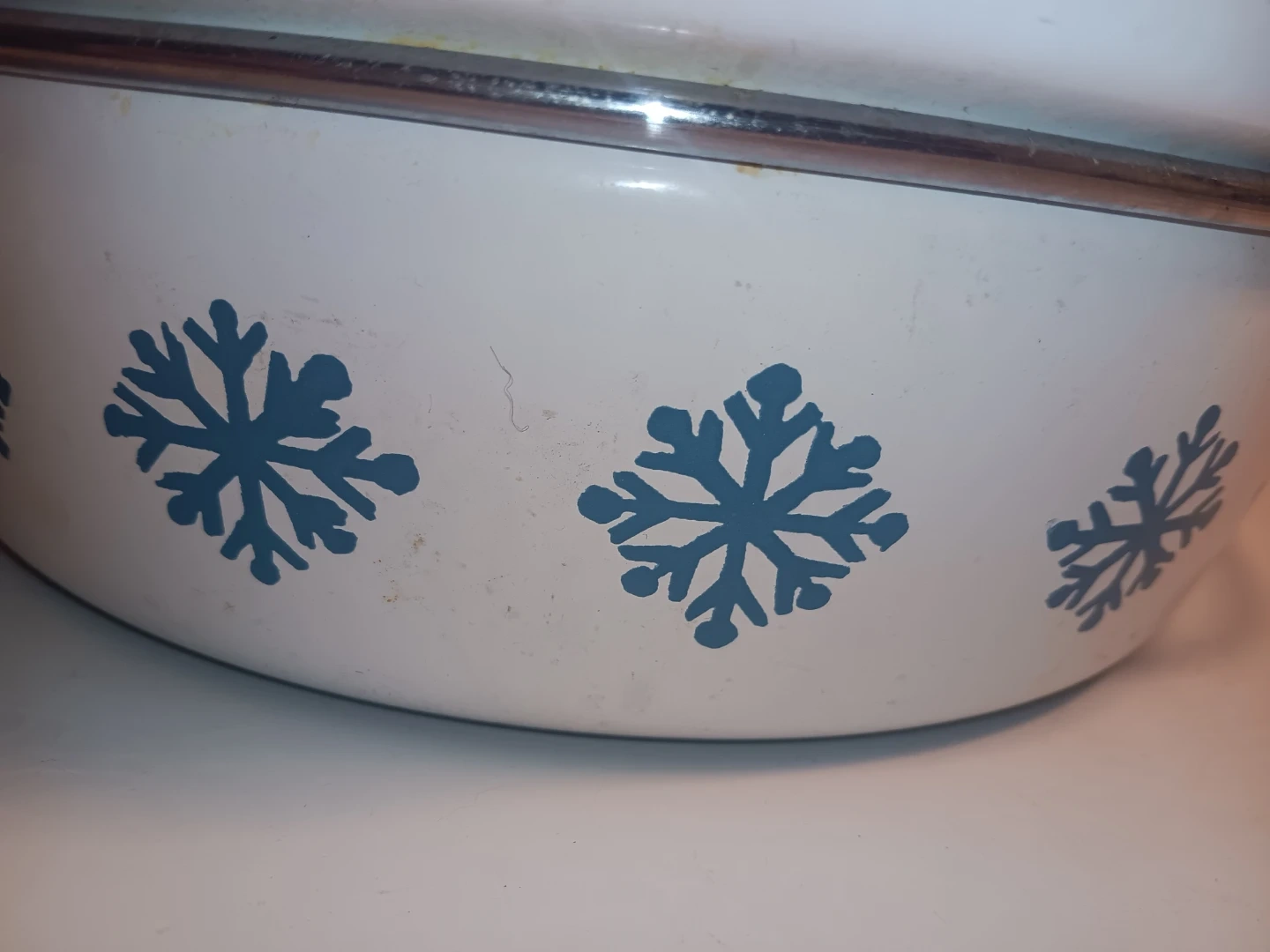 Details visible in photos include the Cathrineholm of Norway maker’s mark on the bases and the classic snowflake pattern wrapping each vessel. Condition reflects authentic vintage use. Interior enamel remains intact with light utensil marks. All lids are present and fit properly. The bottoms show visible wear and heat patina consistent with age and stove use, which has been factored into pricing.