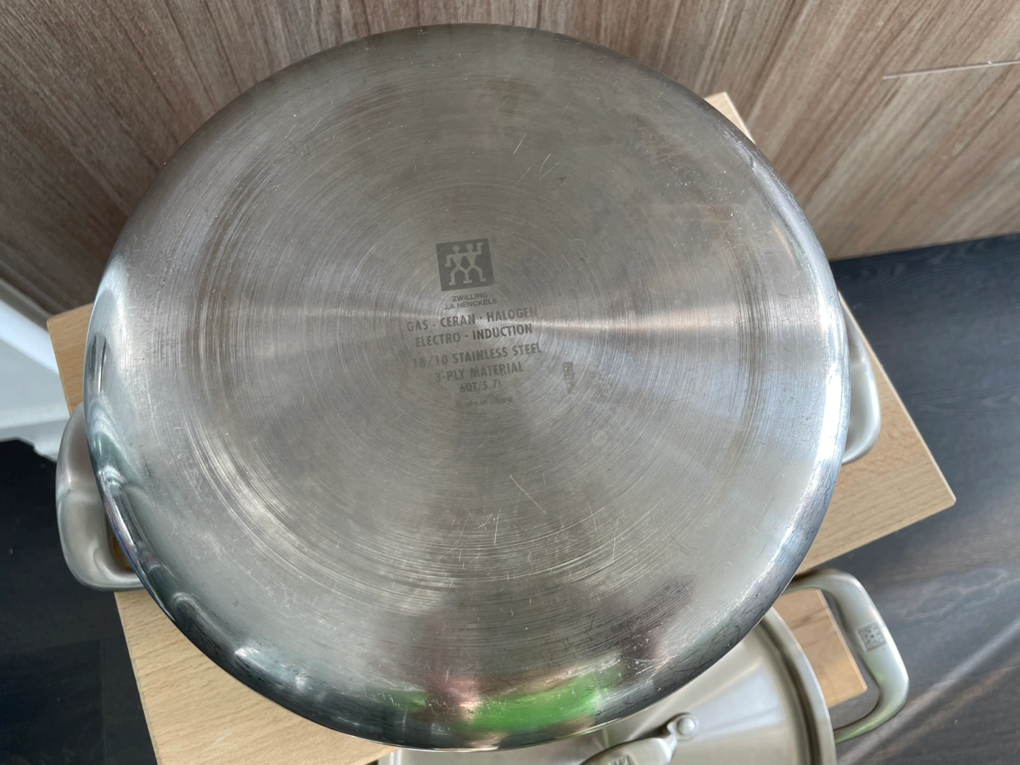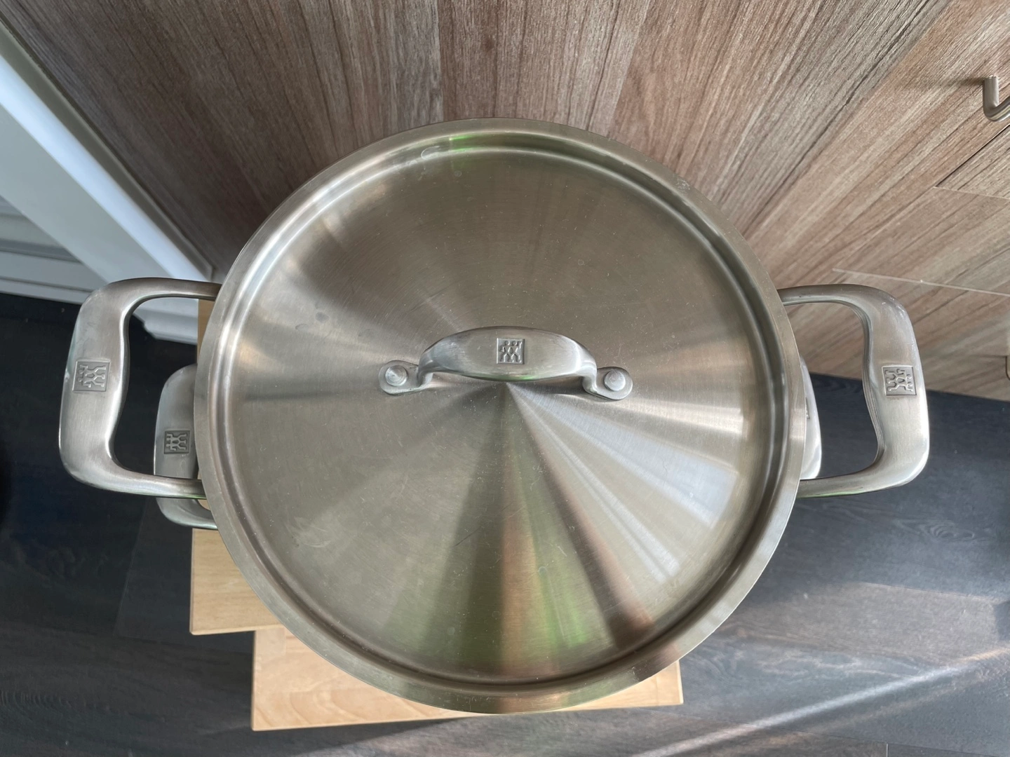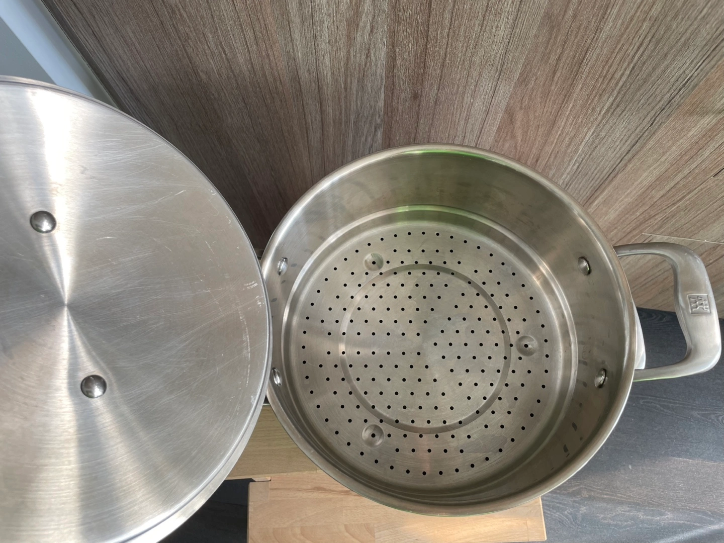 Selling a Zwilling stock pot that comes with a steamer insert! It's in great condition and ready for your next culinary adventure. Perfect for making soups, stews, or steaming veggies. The pot is made of stainless steel and is about 20cm tall.