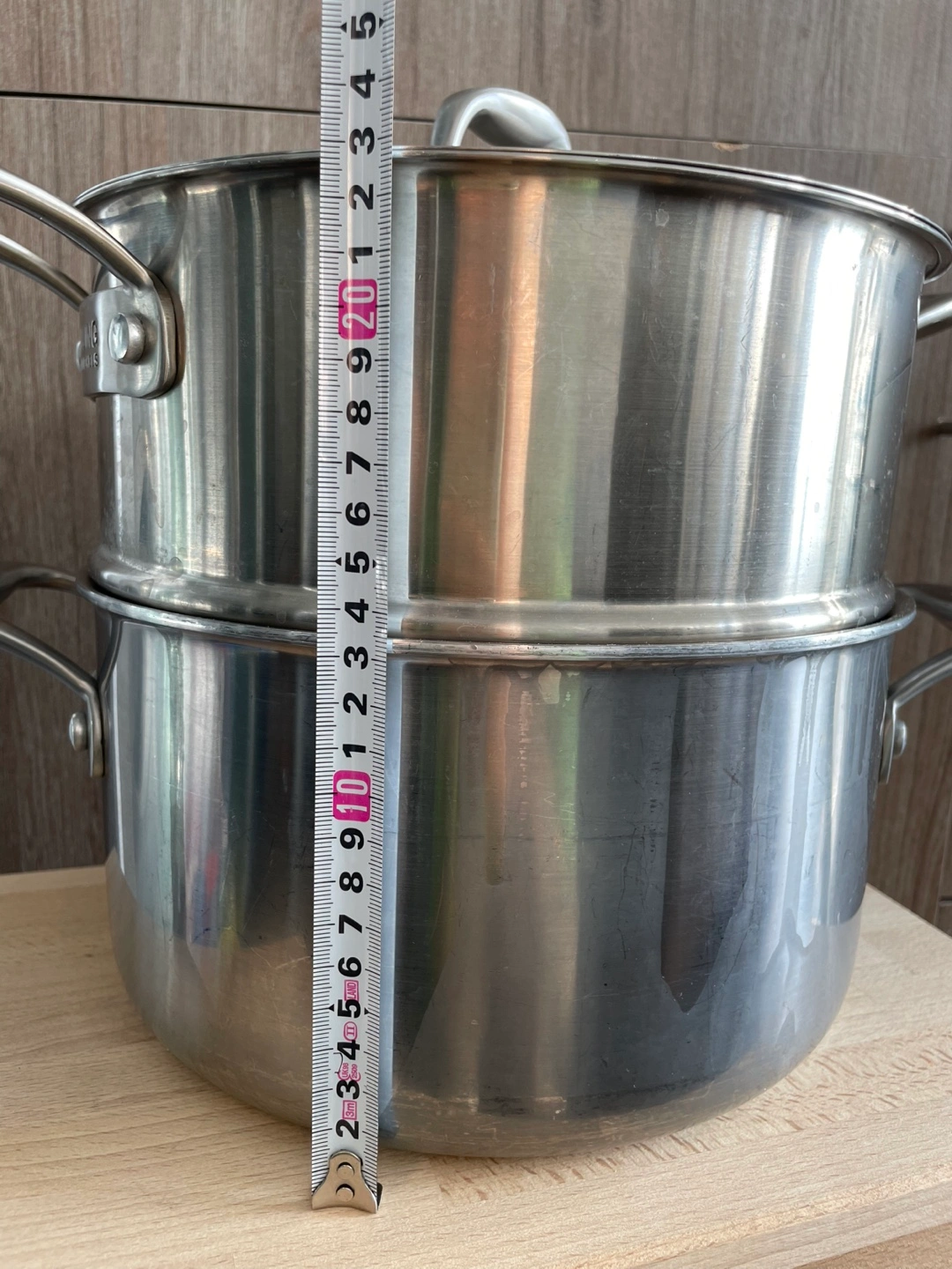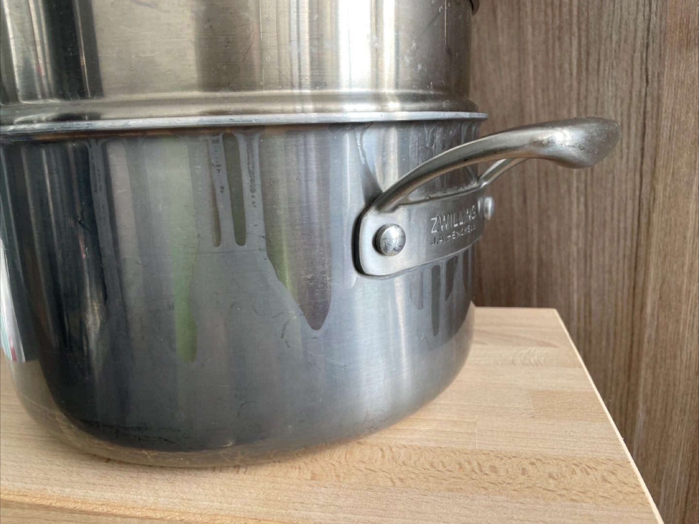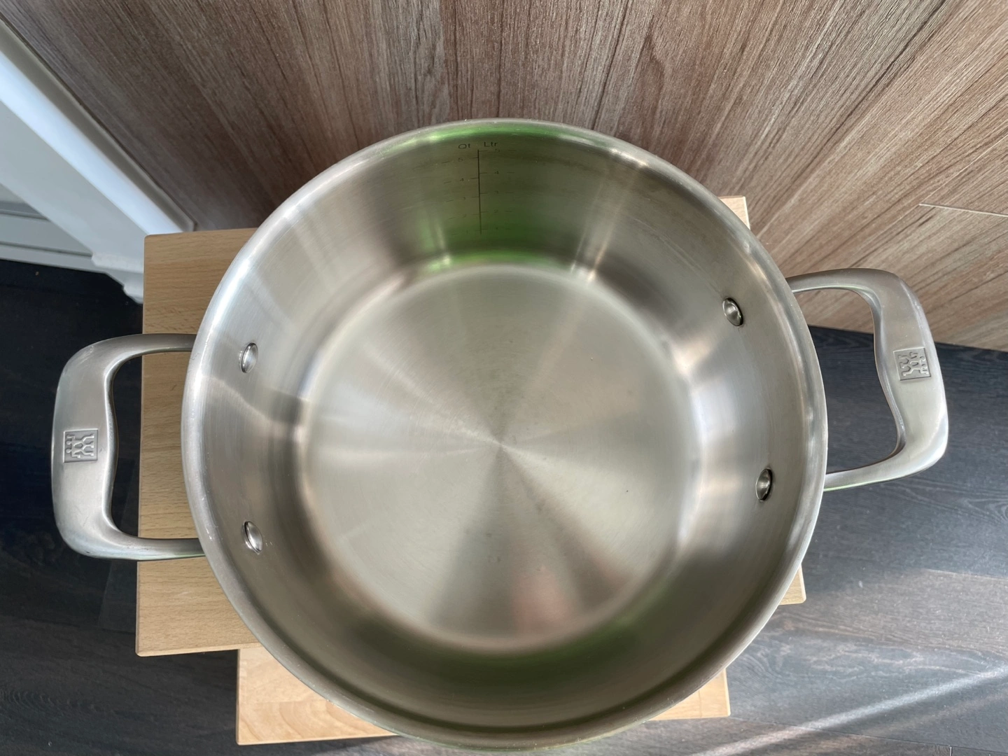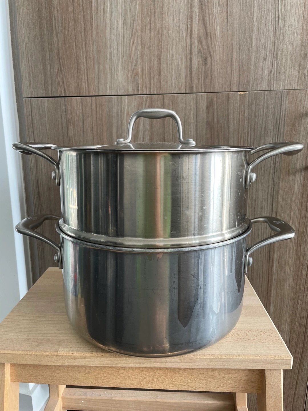 Selling a Zwilling stock pot that comes with a steamer insert! It's in great condition and ready for your next culinary adventure. Perfect for making soups, stews, or steaming veggies. The pot is made of stainless steel and is about 20cm tall.