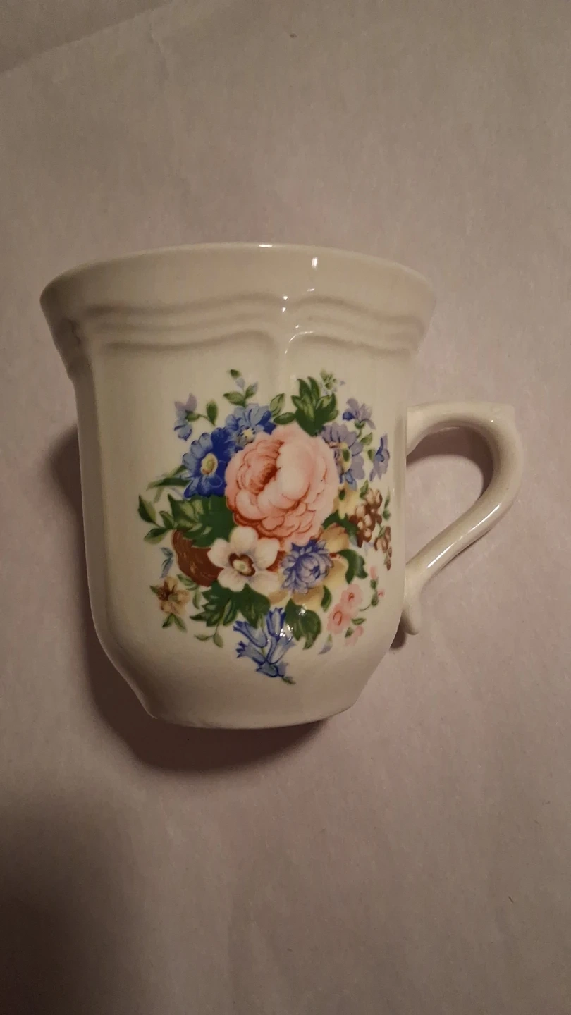 This is a lovely ceramic coffee mug with a vintage floral design. It's perfect for enjoying your morning coffee or tea. The mug's classic shape and charming pattern make it a delightful addition to any kitchen.