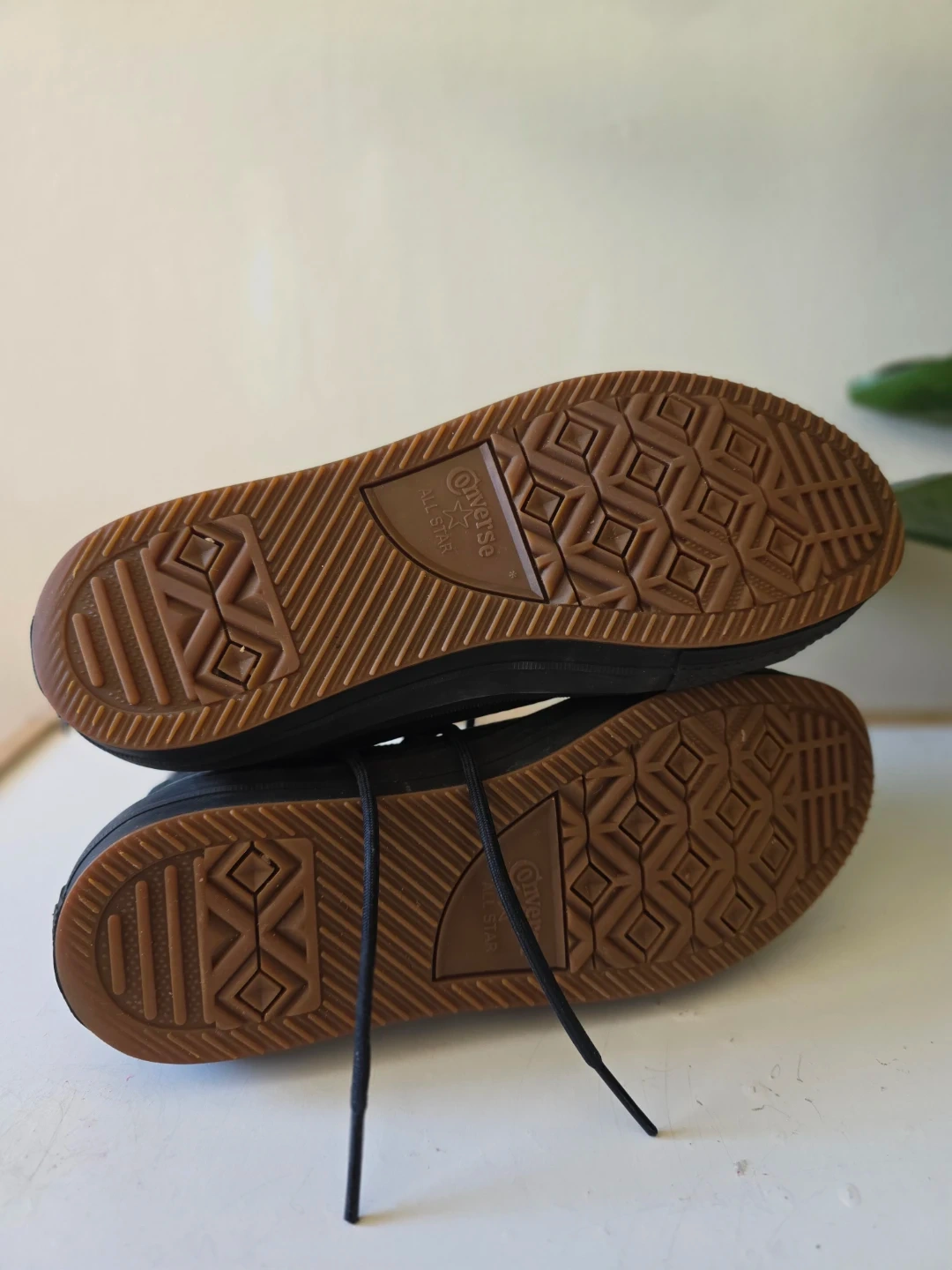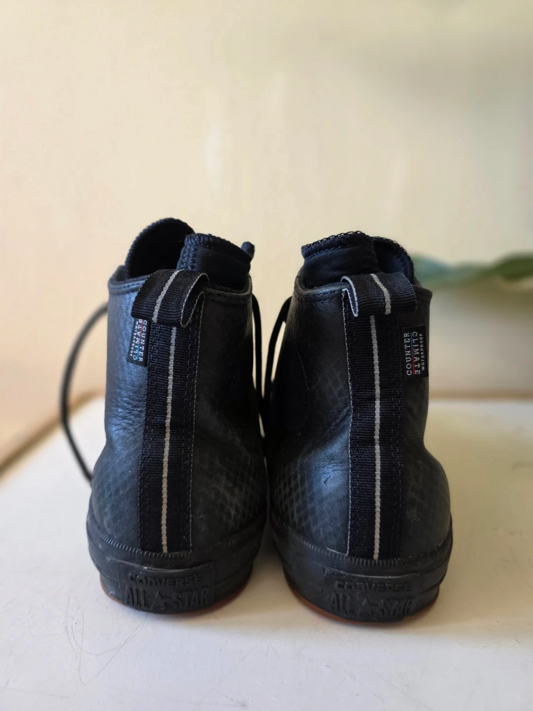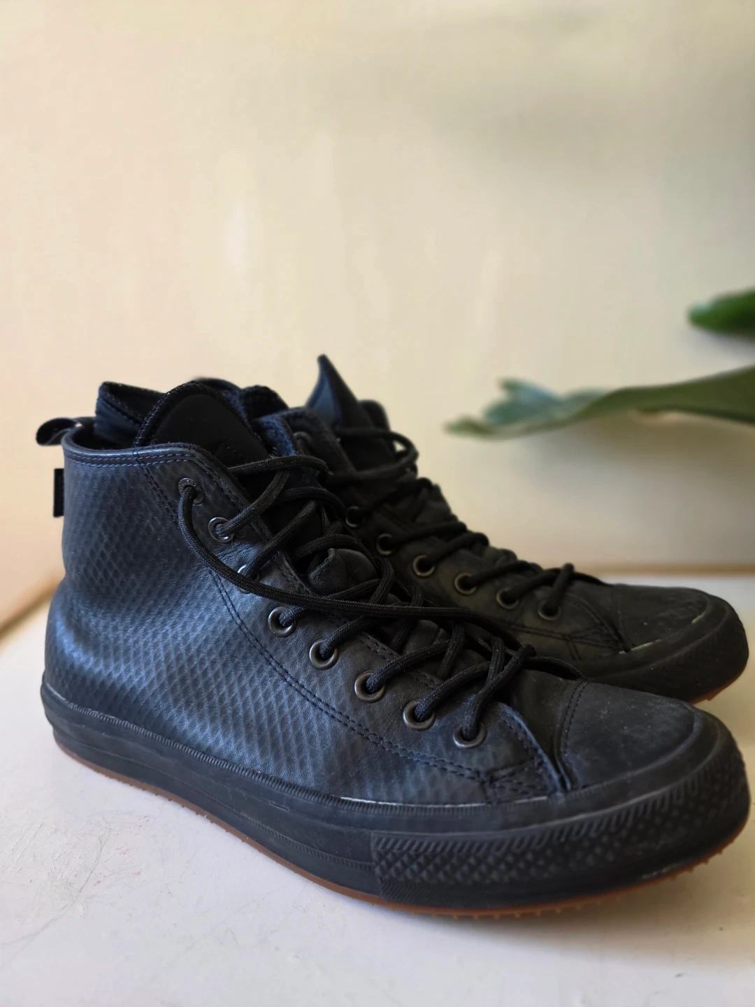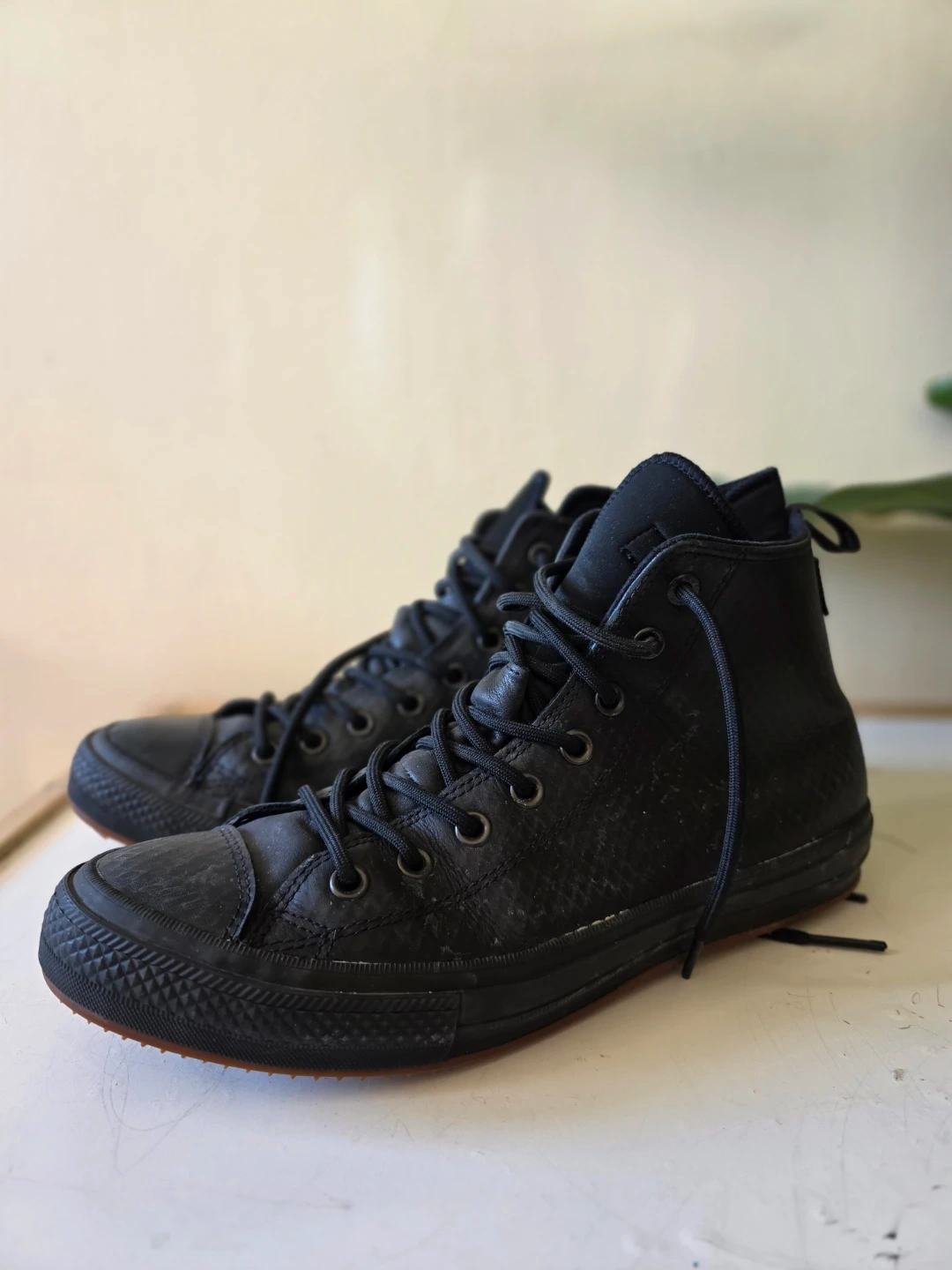 These black Converse Chuck Taylor high-top boots are water repellent and made for the outdoors. They're constructed with durable leather and textile. They feature a rugged outsole for good traction. These boots are ideal for wet or cooler weather conditions.