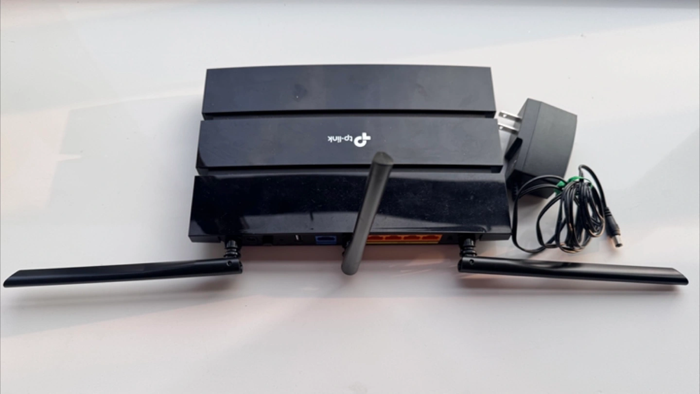 Black router with three antennas. Comes with a power adapter. AC1750 Wireless Dual Band Gigabit Router.
