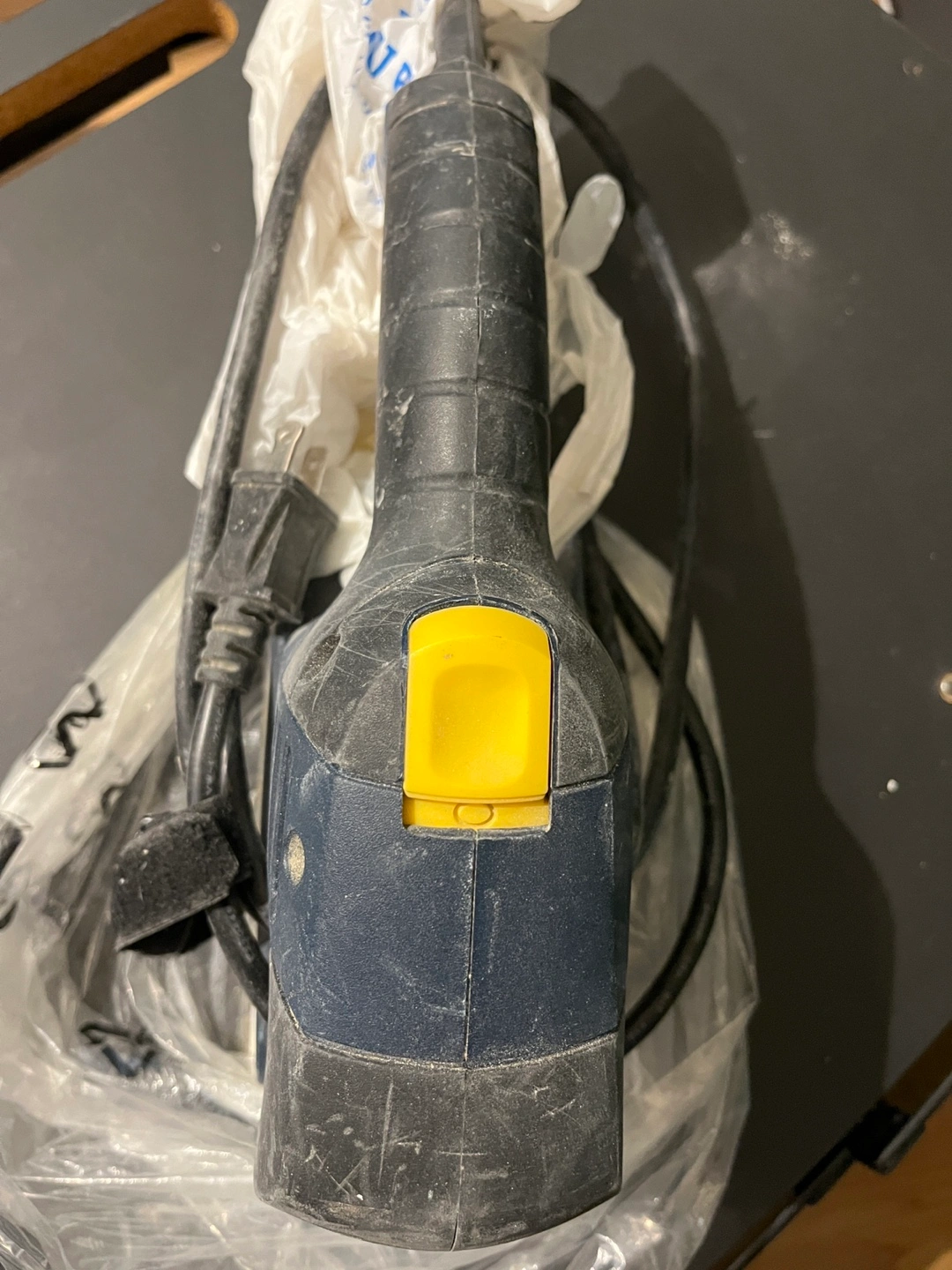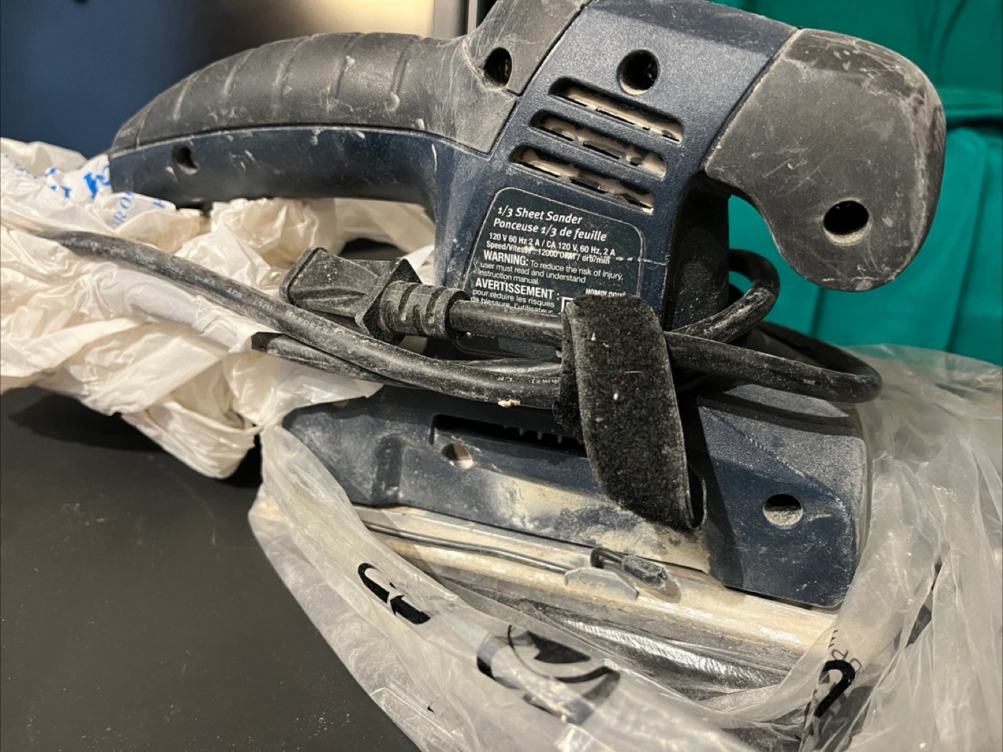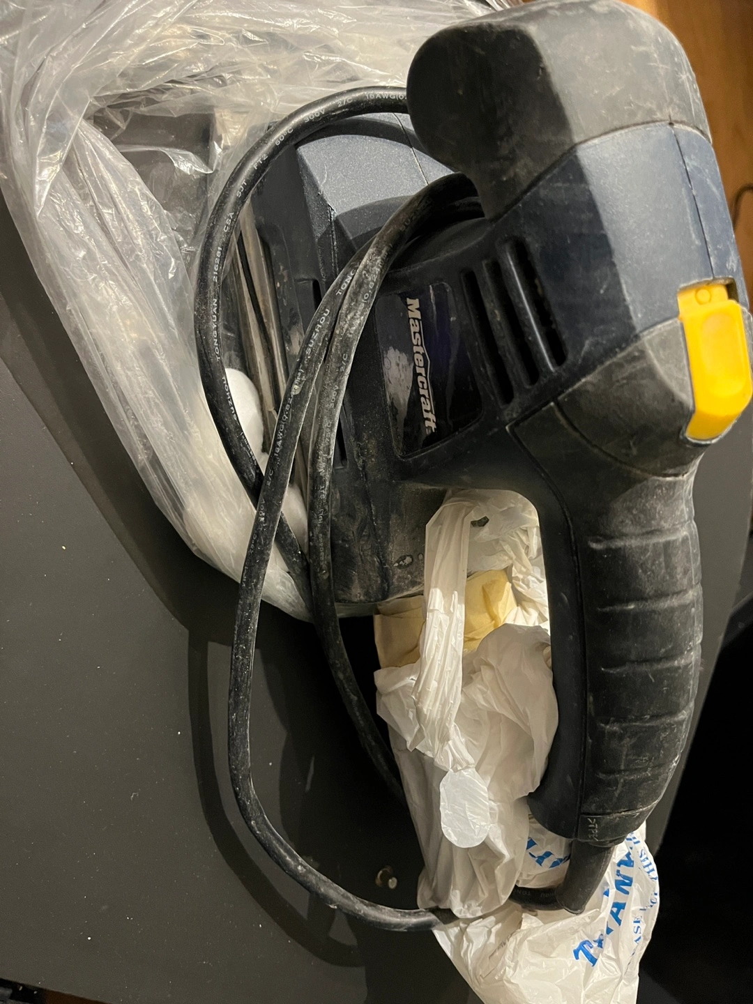 This is a Mastercraft 1/3 sheet sander. It's designed for sanding flat surfaces. The tool has a corded power source. Missing the dust bag. It Works fine. Had let it go because I don’t use it anymore.
