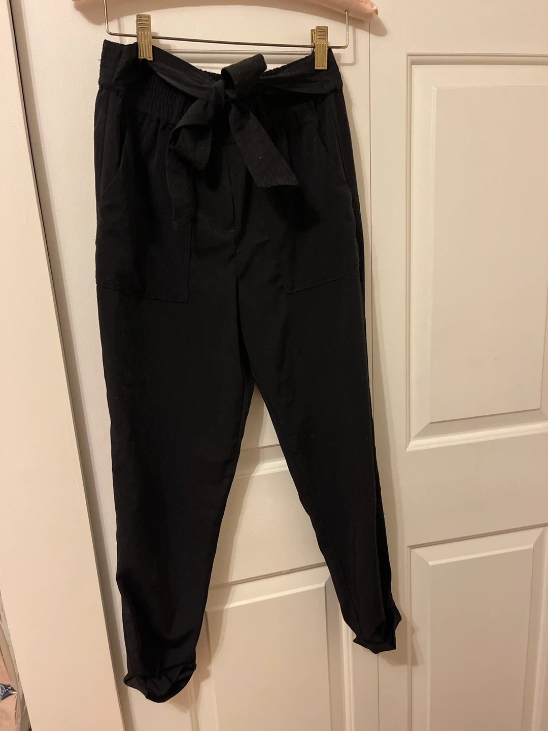 Selling a pair of black pants with a tie waist! They're in great condition and ready for a new home in your wardrobe. The pants have a relaxed fit and are super comfy for everyday wear