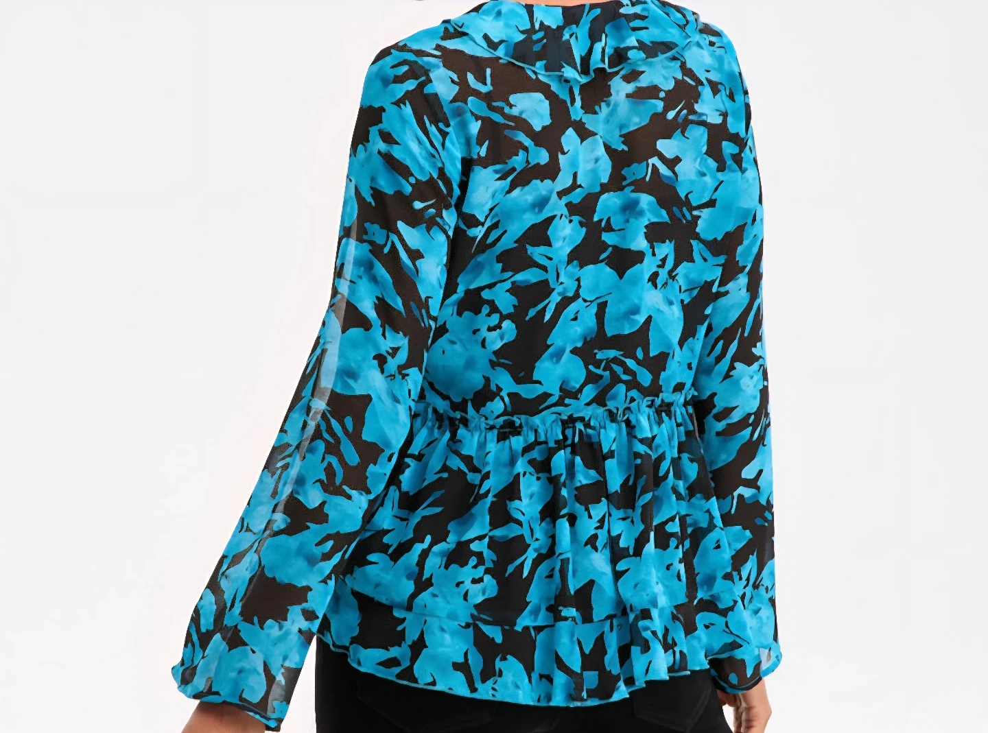 New with tags INC fashion blouse. Blue and black floral print. Features a V-neck with tie closure and a ruffled hem. Long sleeves with a cinched waist. Size X-Large.