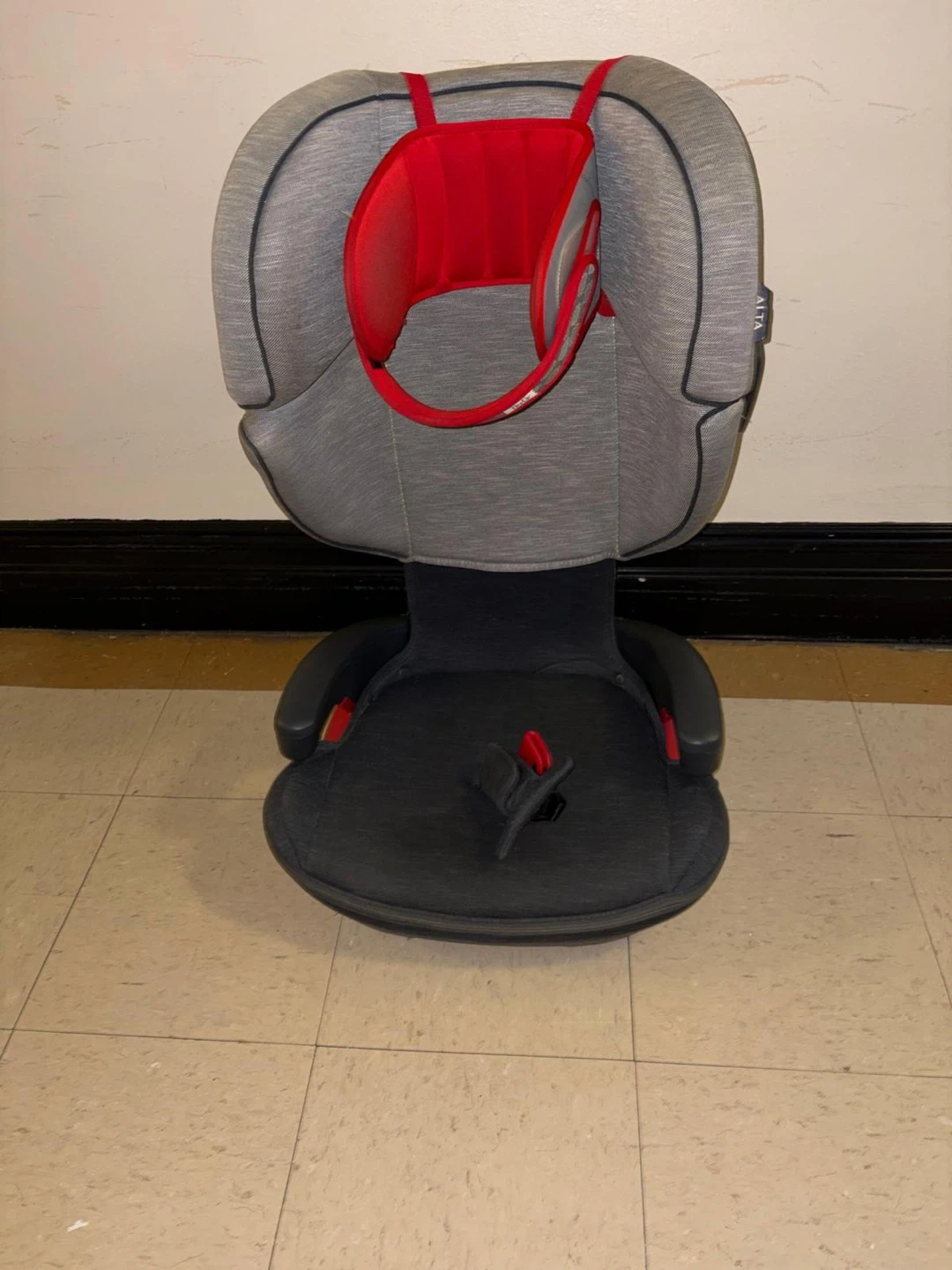 This is an UPPAbaby ALTA highback booster car seat. It's gray with red accents. It features SIP (Side Impact Protection) technology for added safety. Suitable for older children transitioning to a booster.