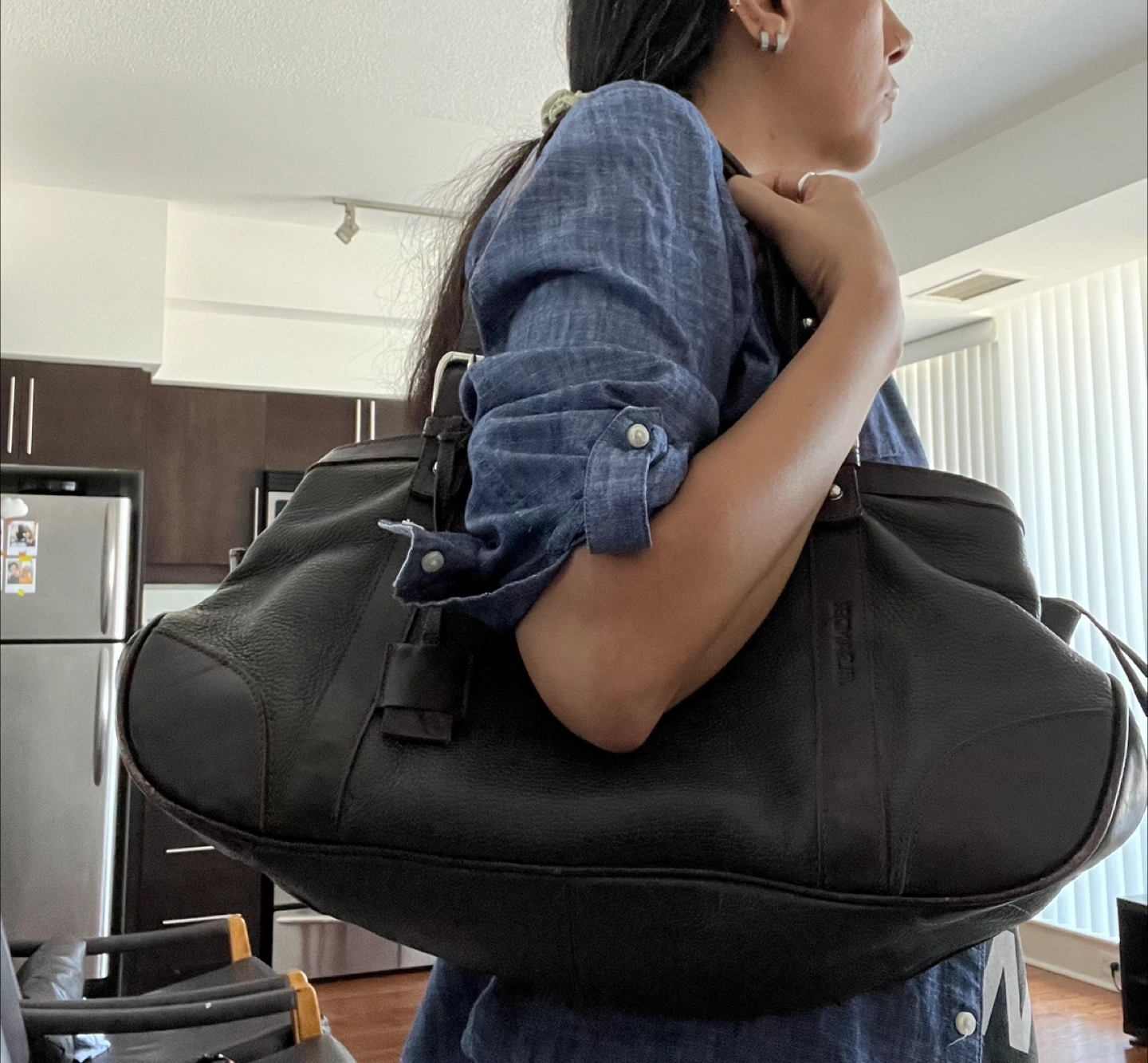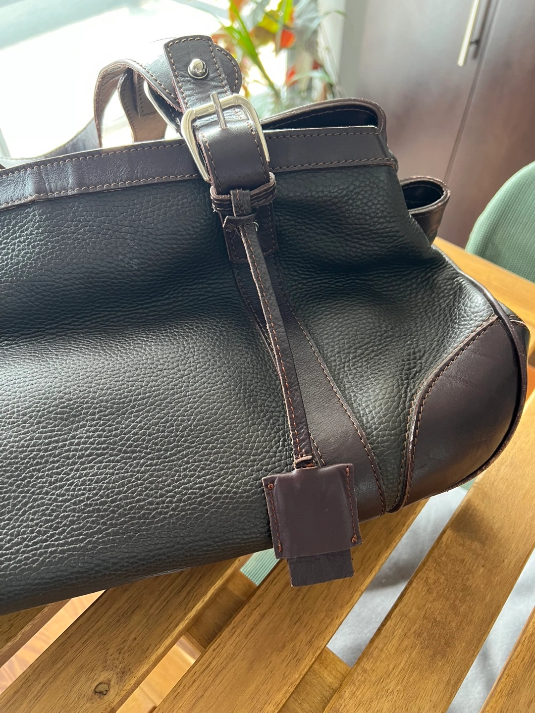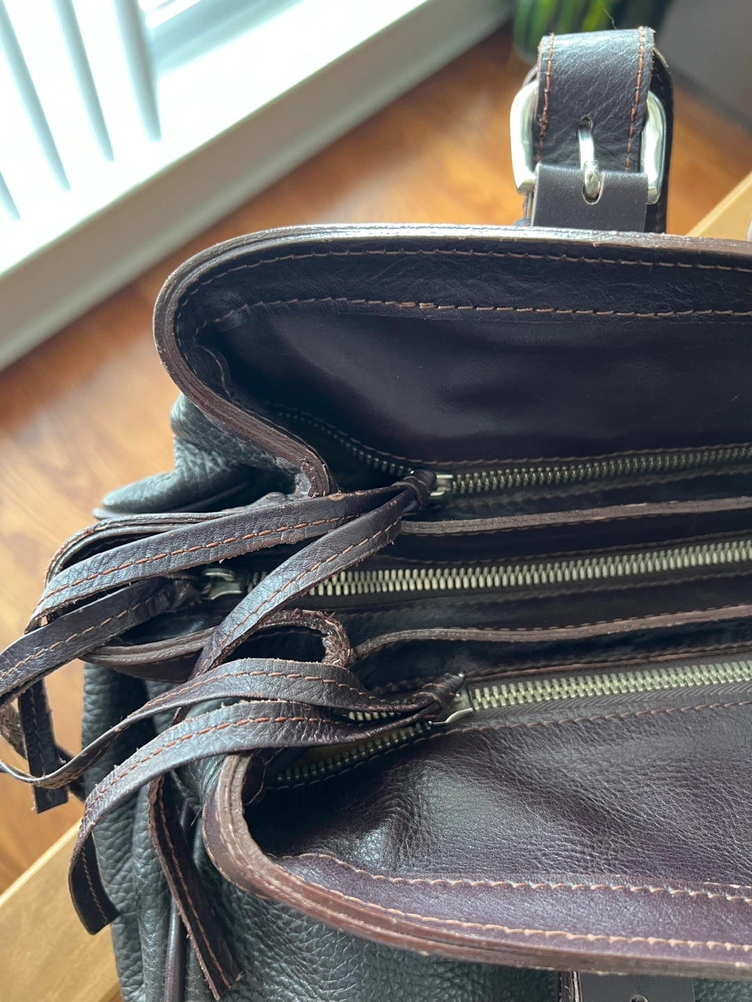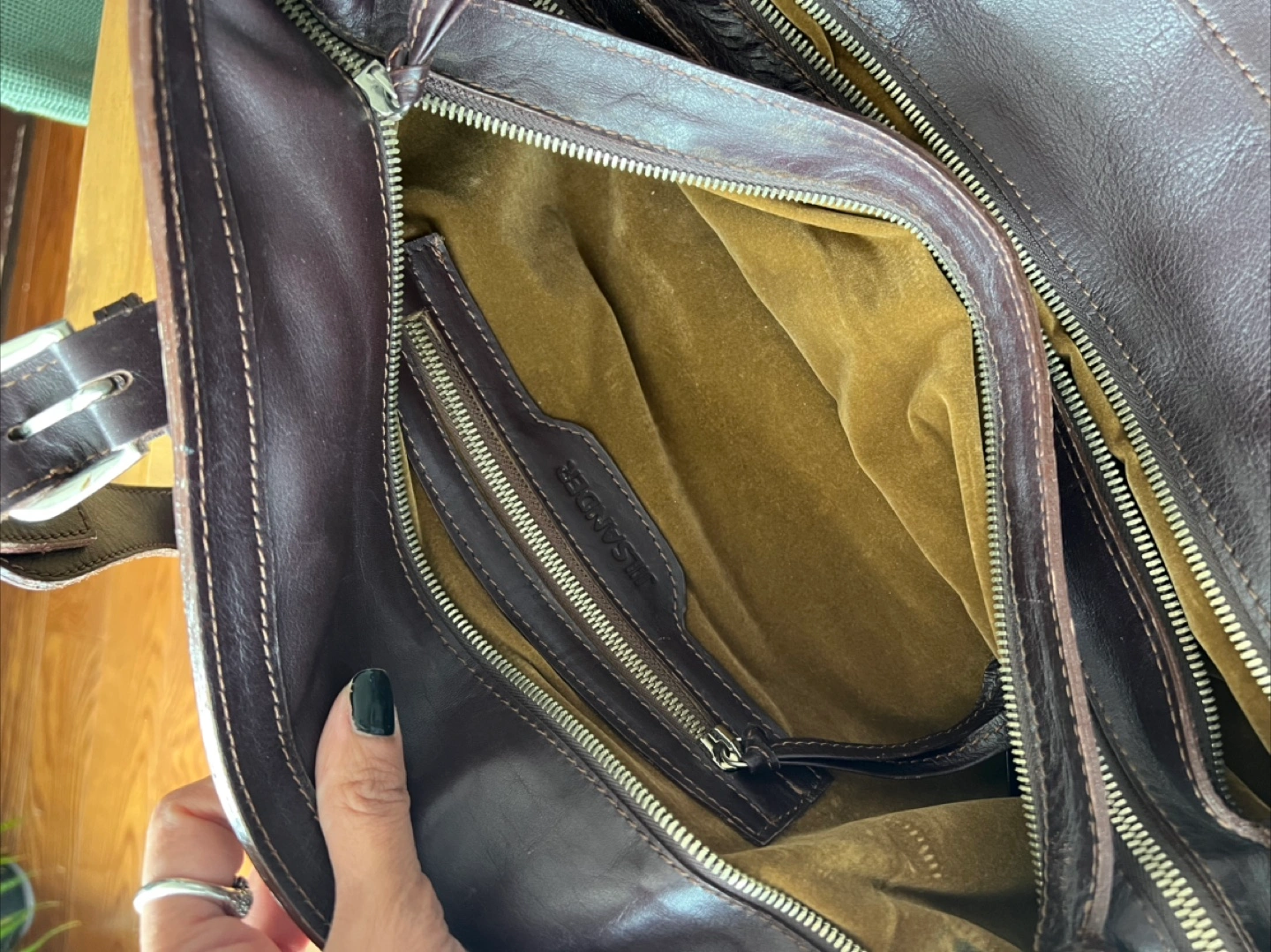 This is a Jil Sander bag in brown leather. It features multiple zippers and a soft, golden-brown interior lining. It's a stylish and functional piece!
