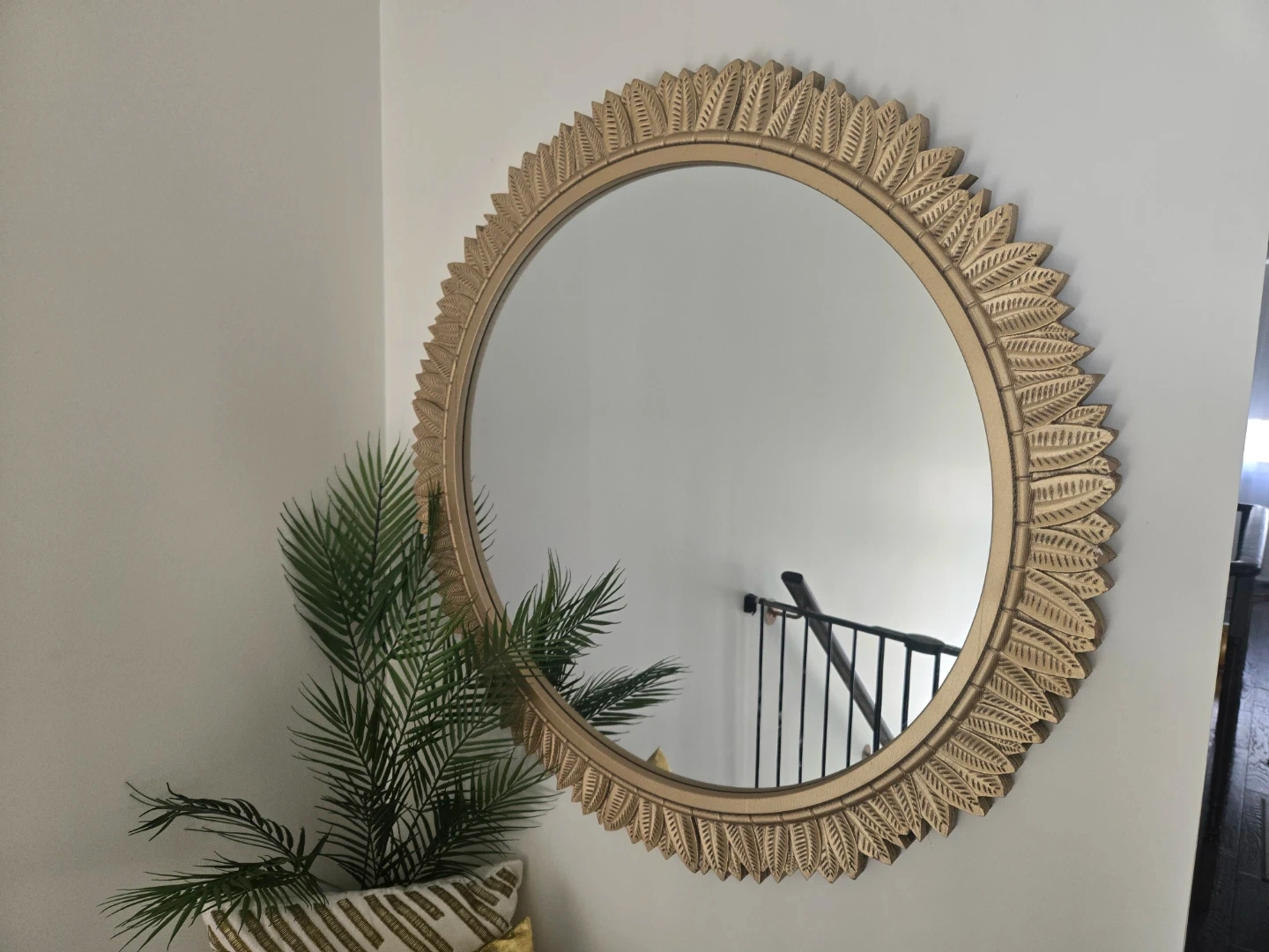 This elegant bench features a comfortable grey upholstered seat and a sleek gold metal frame. It's complemented by a striking round mirror with a decorative gold sunburst frame. Three throw pillows in gold and white tones are included, one with a metallic stripe pattern and another with an intricate mandala design. This set adds a touch of glamour to any entryway or living space.