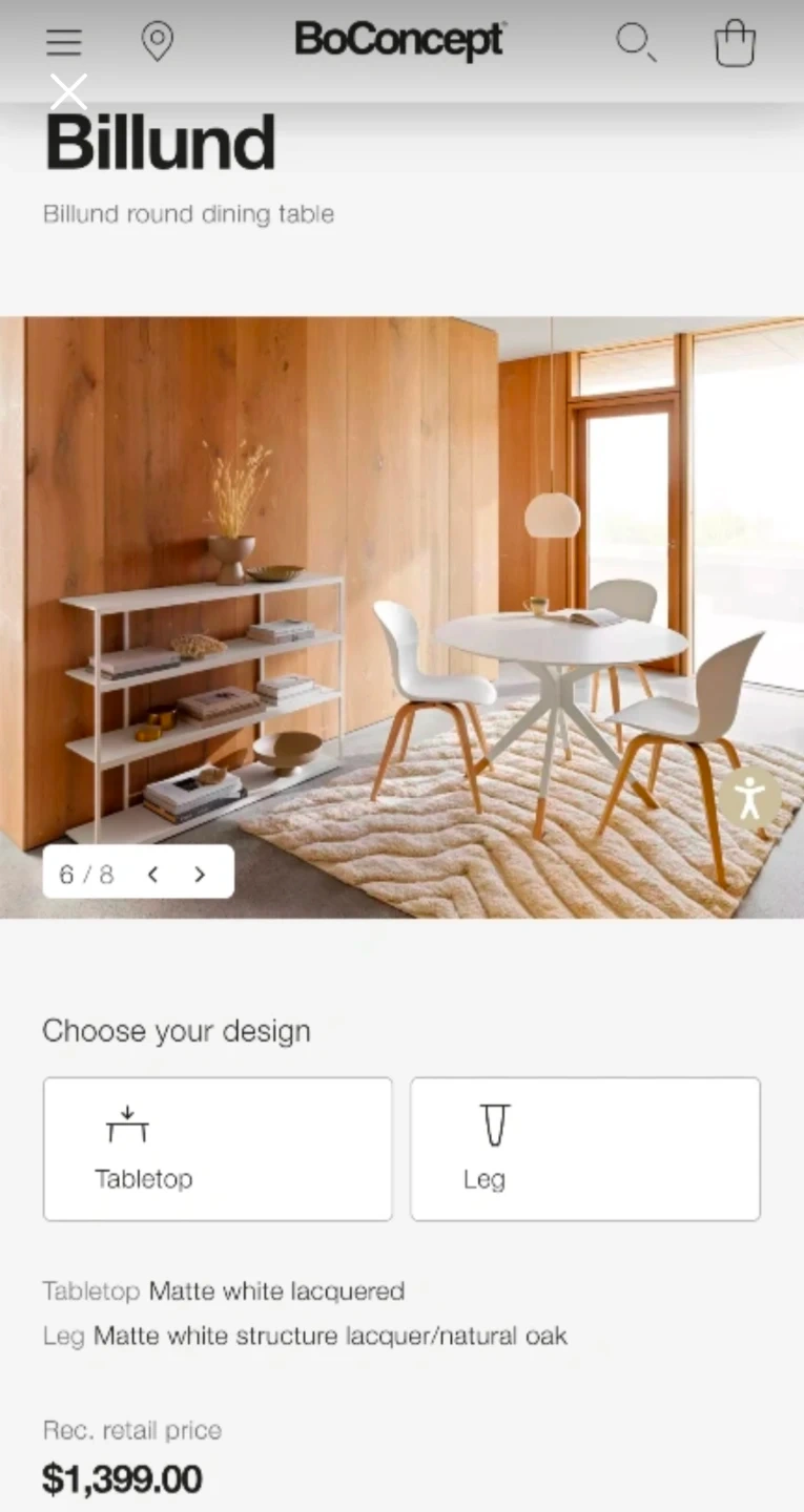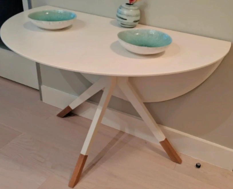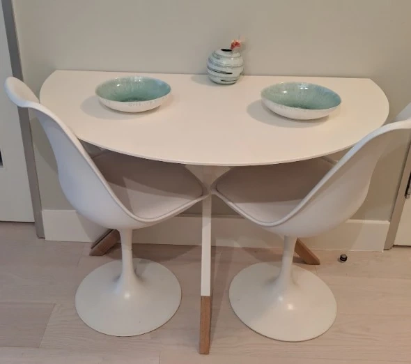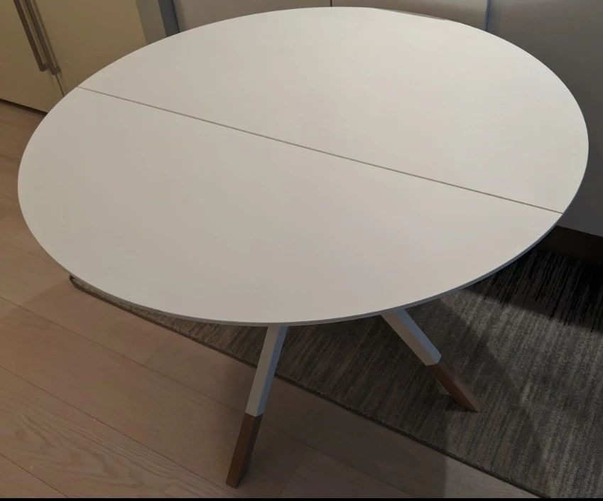 Selling a BoConcept Billund round dining table! The tabletop is matte white lacquered, and the leg structure is matte white lacquer with natural oak. It's a stylish and functional piece for any dining space. Retails for $1,399 ($1523 post tax)
