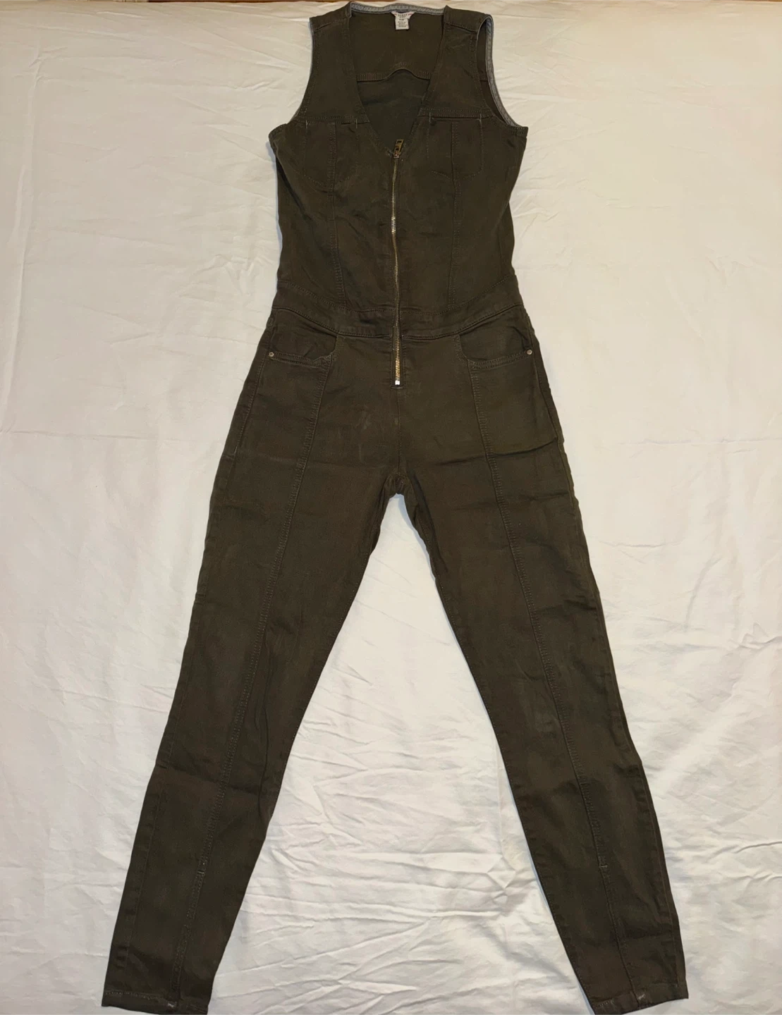 This sleeveless jumpsuit from Guess features a front zipper closure and a dark olive color. It's made of a durable fabric, perfect for a casual look. Size is marked as medium.