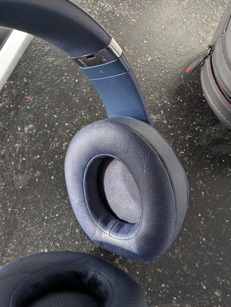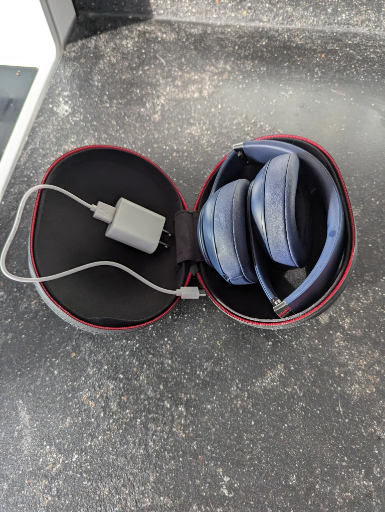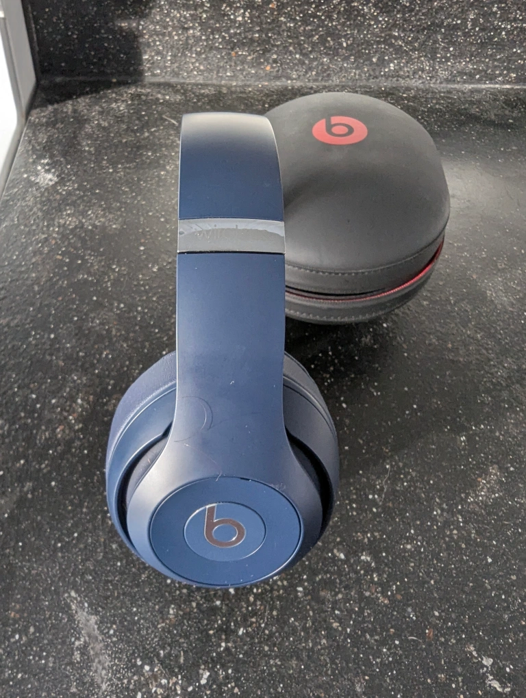 Wireless over-ear headphones. Navy blue colour. Includes case and charging cable (not the original but works great). Some minor cosmetic wear and tear as pictured on one ear cover.