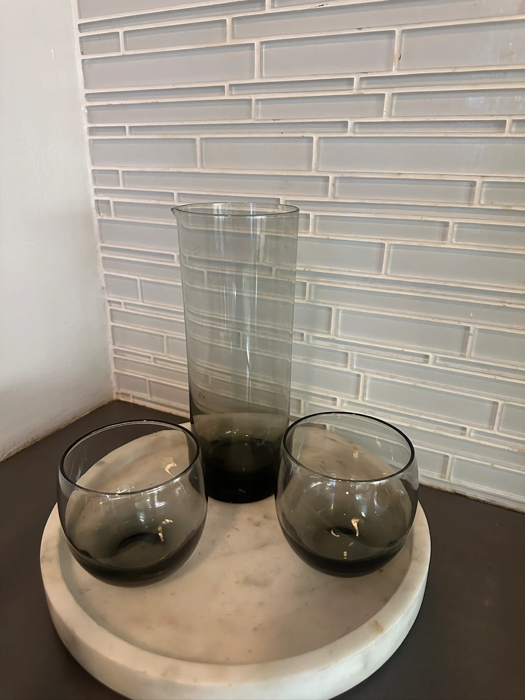 A beautiful mcm bar kitchen ware set. No chips. Solid Marble tray is modern & included in asking price.