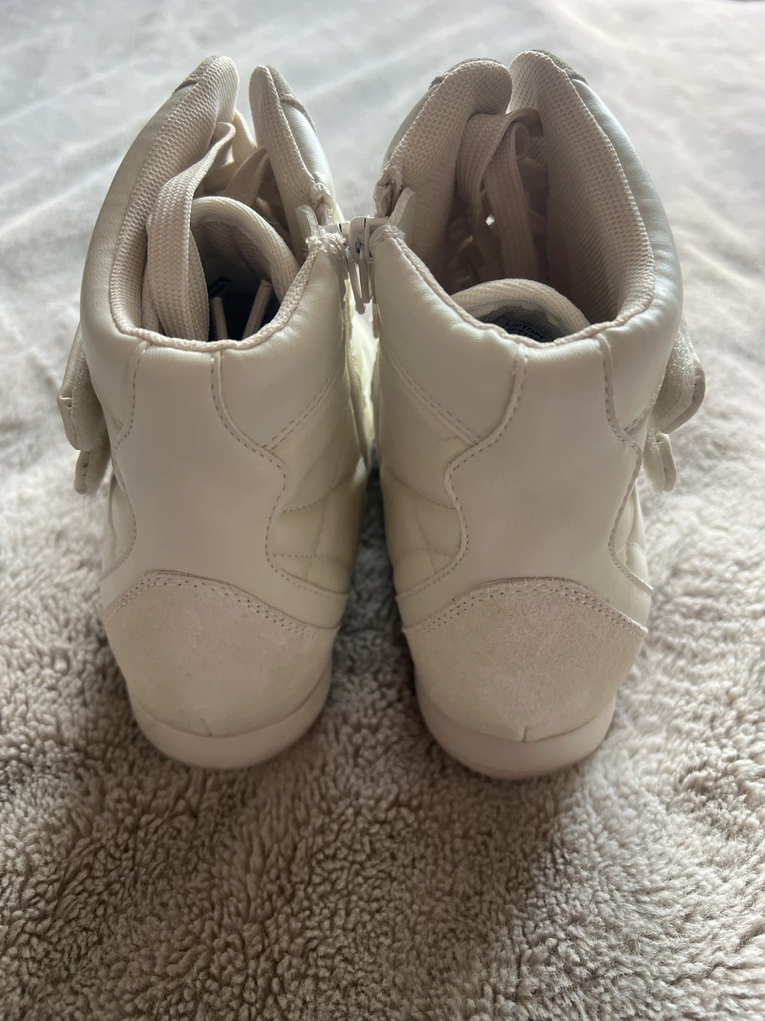 Steve Madden white high-top sneakers with a wedge heel. These sneakers feature a zipper closure on the side and velcro straps at the ankle. Made with a mix of leather and suede.