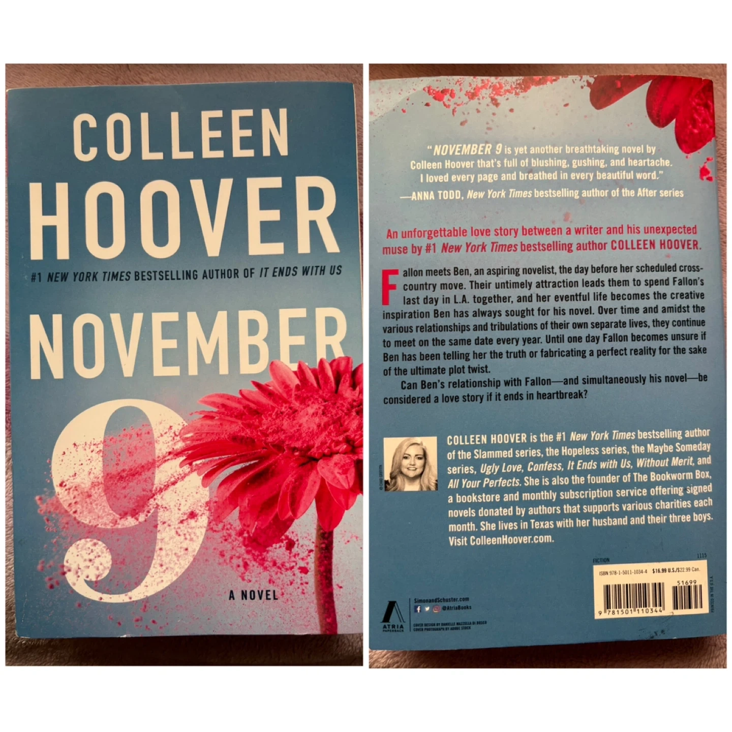 For sale is Colleen Hoover's novel, "November 9." It's an unforgettable love story centered around a writer named Fallon and her unexpected muse, Ben. The narrative explores their unique connection as they meet and continue to exchange on the same meaningful date each year, revealing the depths of their evolving relationship.