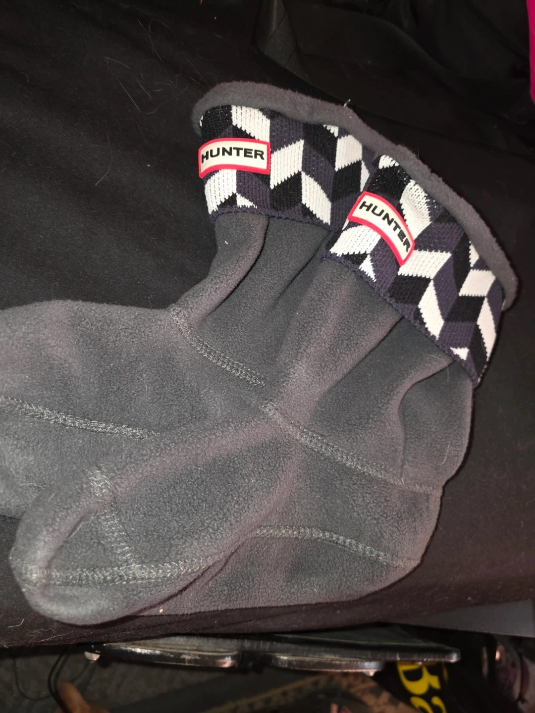 These are Hunter fleece boot socks. They're grey with a black, white, and grey patterned cuff that says Hunter. Fleece material.