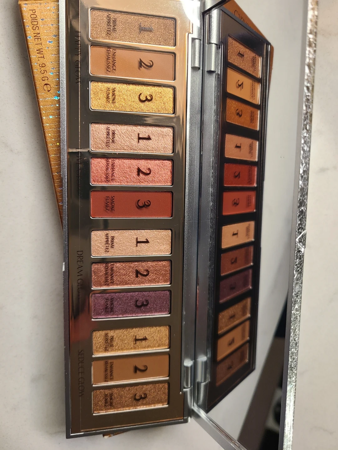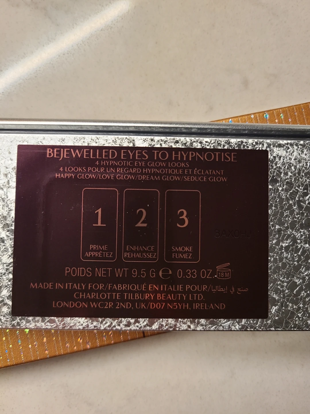 Charlotte Tilbury Bejewelled Eyes to Hypnotise Palette. It features 12 shades with four hypnotic eye glow looks. The palette has a net weight of 9.5g.