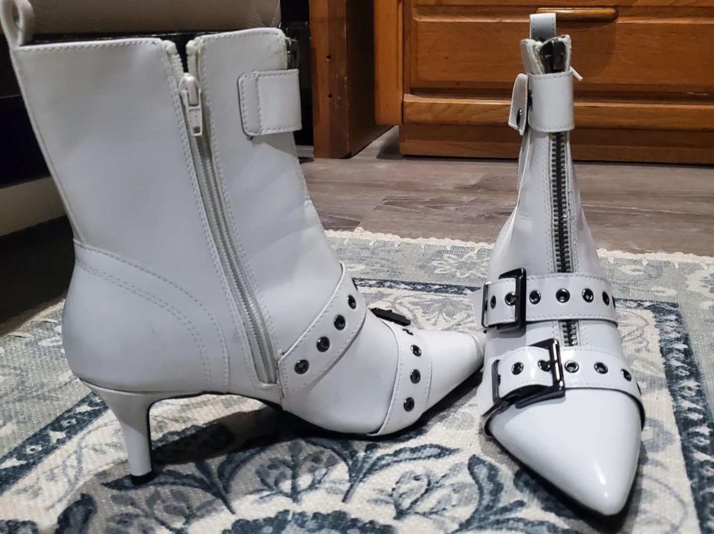 "Wild pair" white ankle boots featuring decorative buckles and side zippers. These boots have a pointed toe and a 2 1/2 inch stiletto heel. Faux leather material.