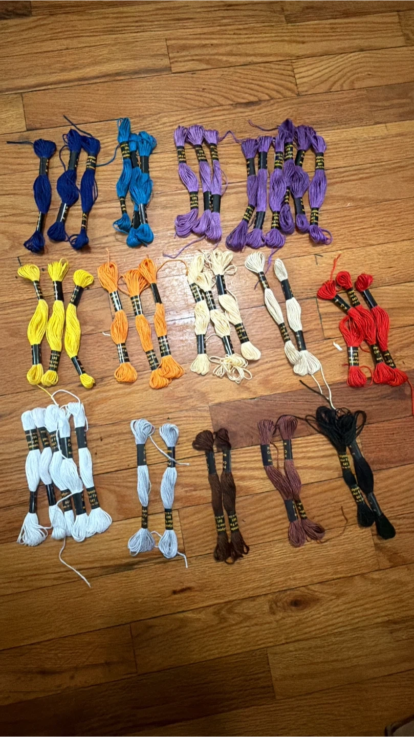 A collection of DMC embroidery floss skeins in various colors. Includes blue, purple, yellow, orange, cream, white, light blue, brown, and black. Perfect for all your cross-stitch and embroidery projects!