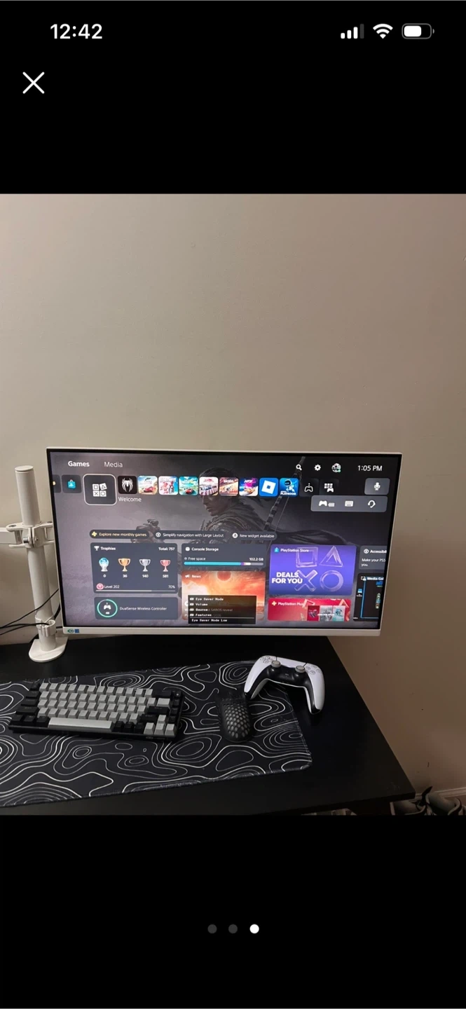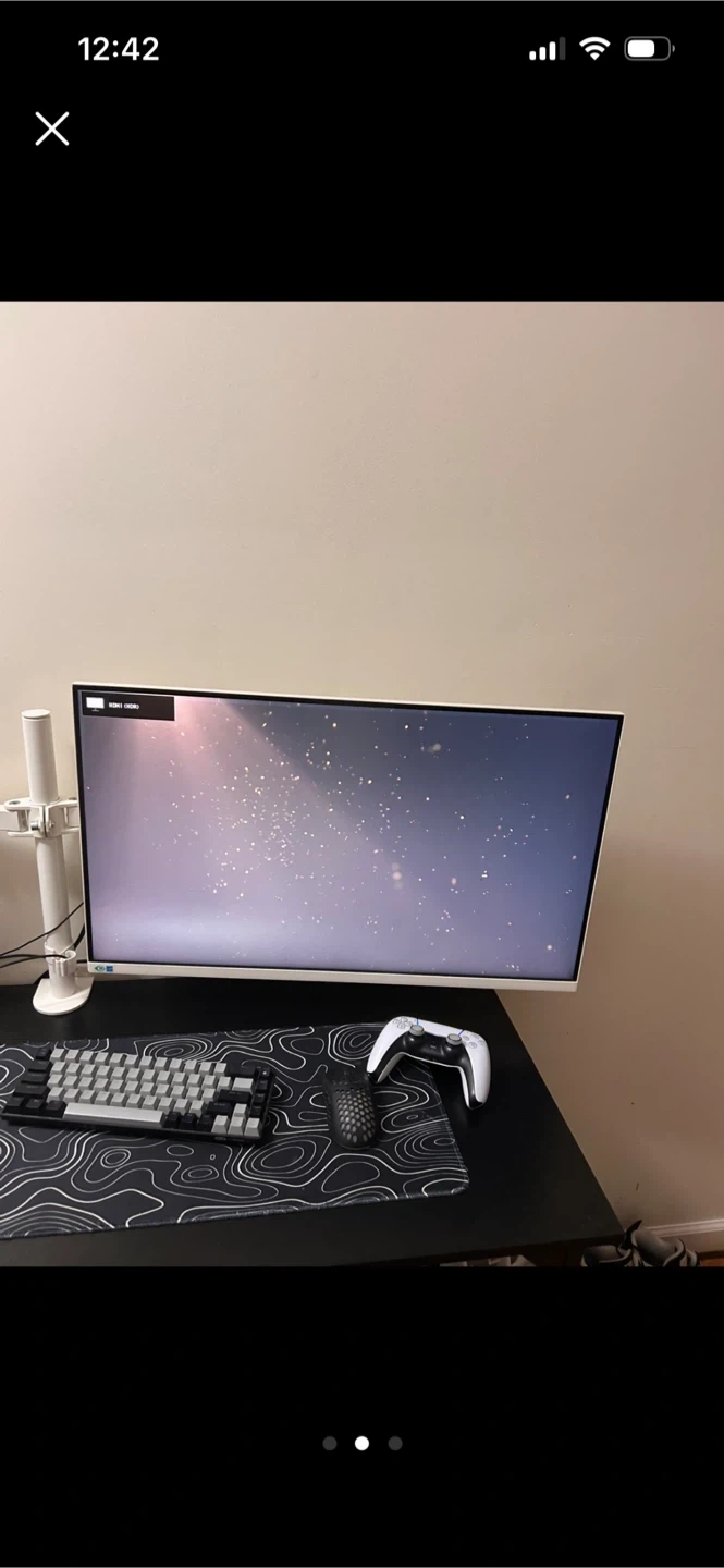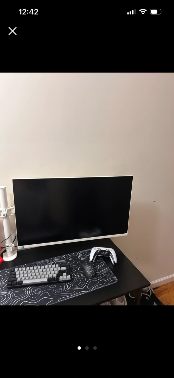This is a white gaming monitor. It features a large screen for an immersive experience. The refresh rate is suitable for fast-paced gaming.