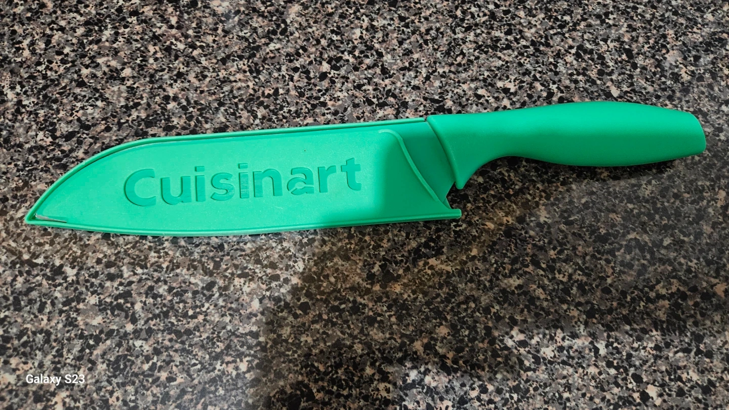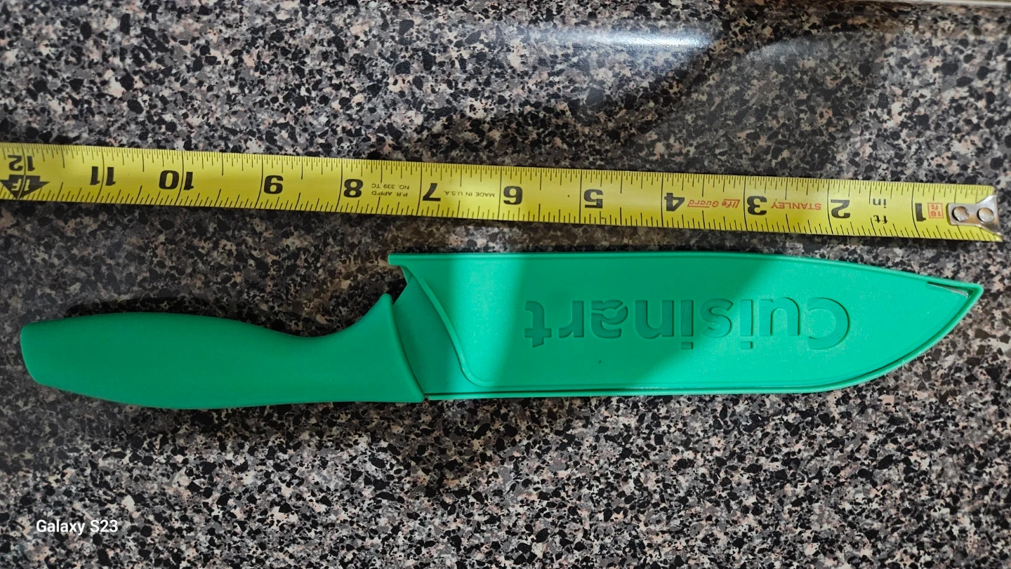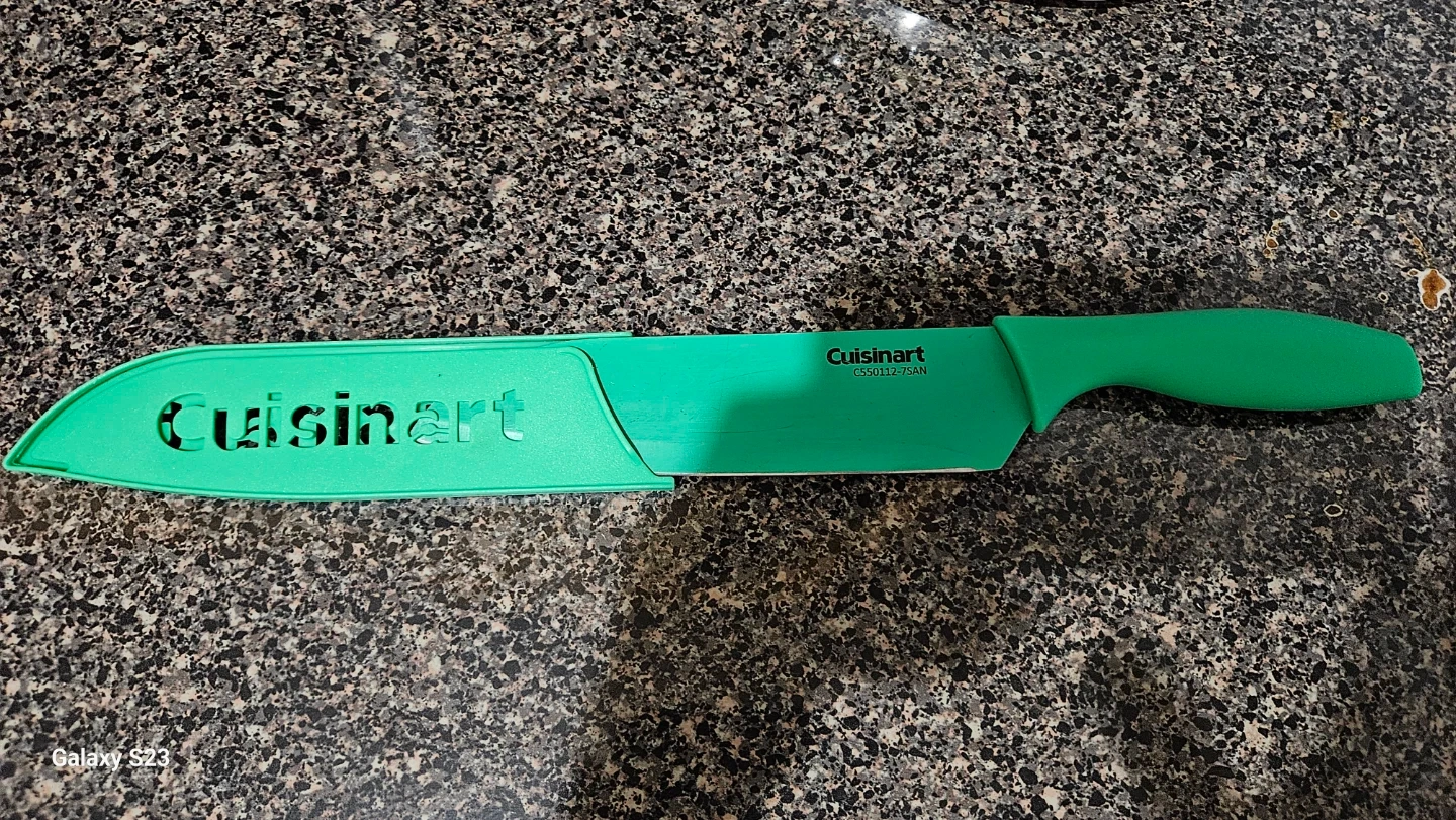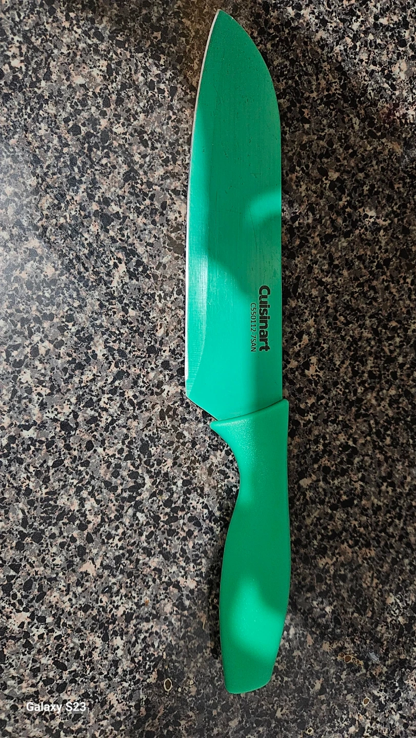 I'm selling a Cuisinart chef's knife in a vibrant green color. It comes with a matching sheath for safe storage. The knife measures approximately 12 inches in length.