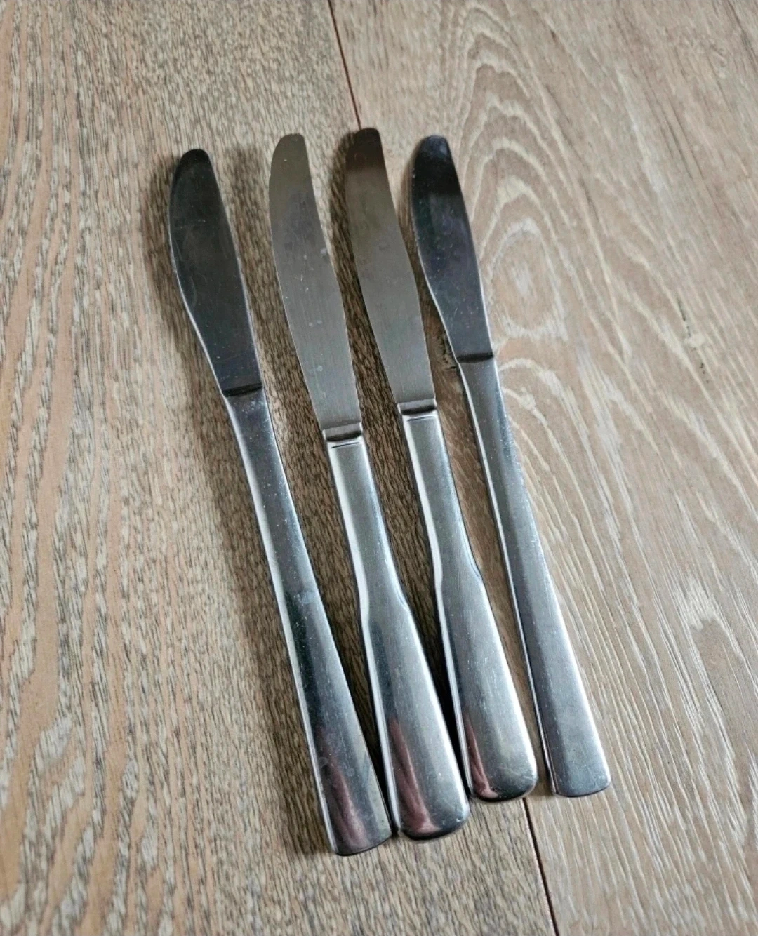 Four stainless steel butter knives are available. They're made from durable stainless steel. These knives are good for spreading butter or jam. They'd be useful for any mealtime.